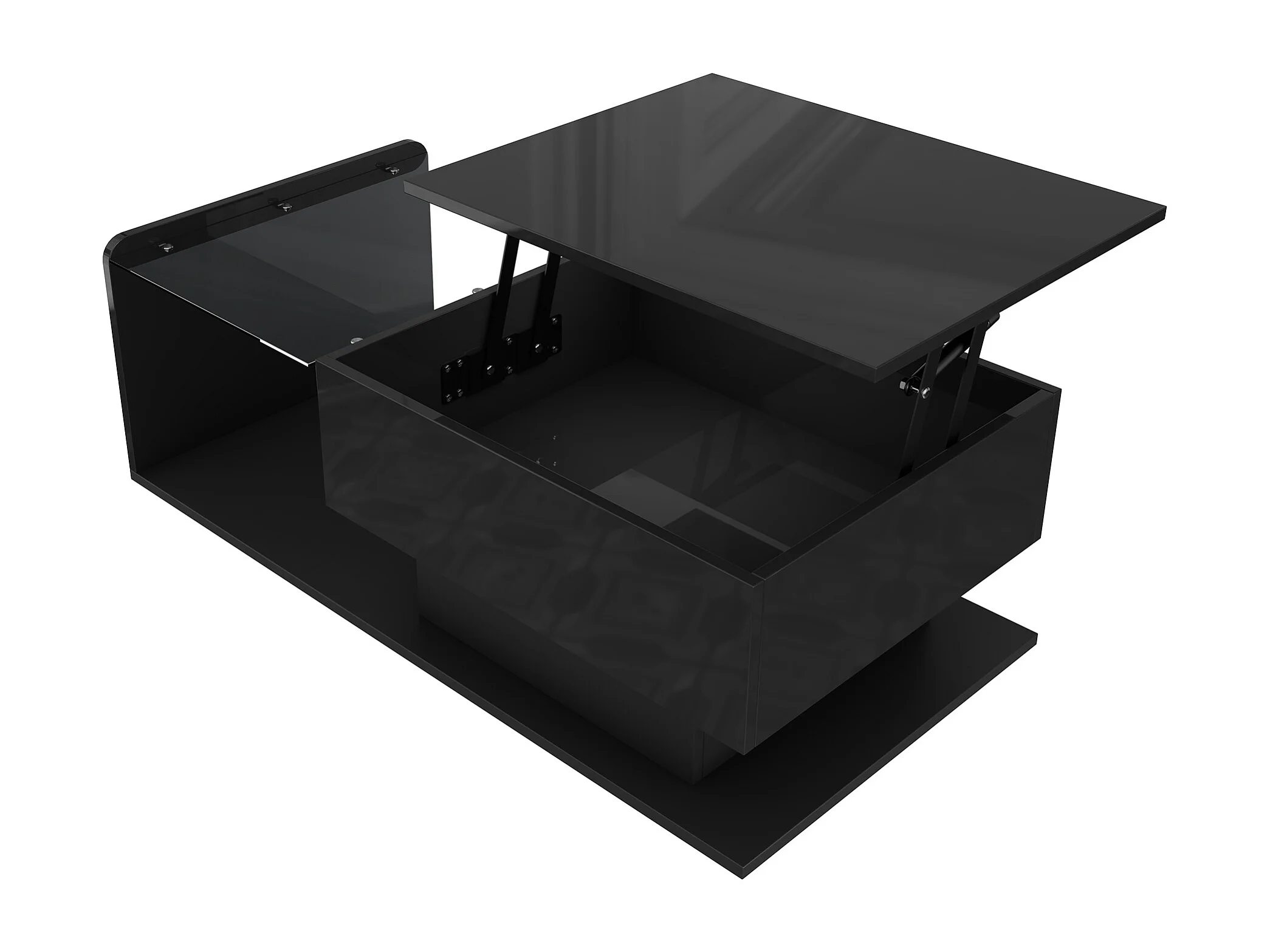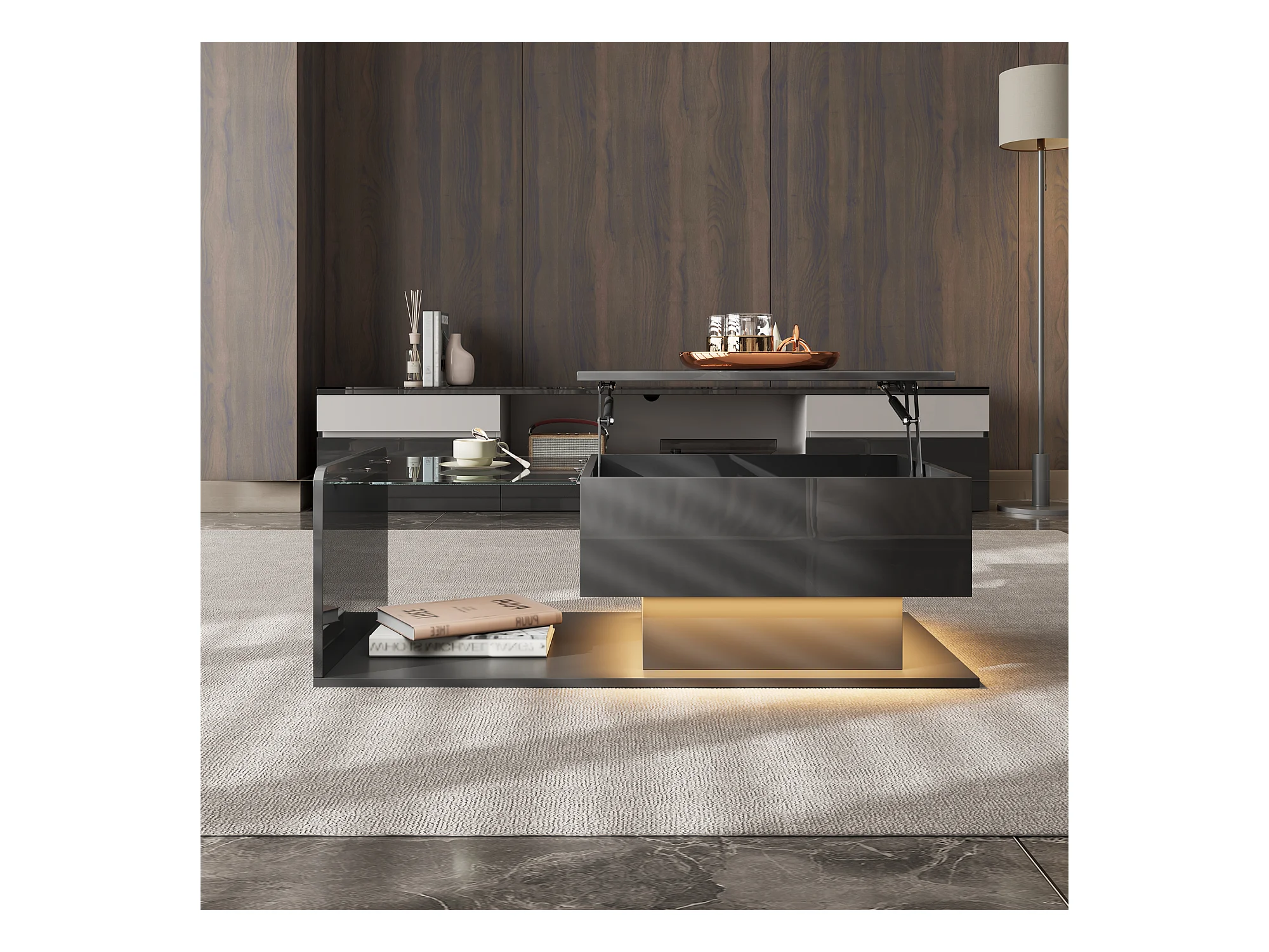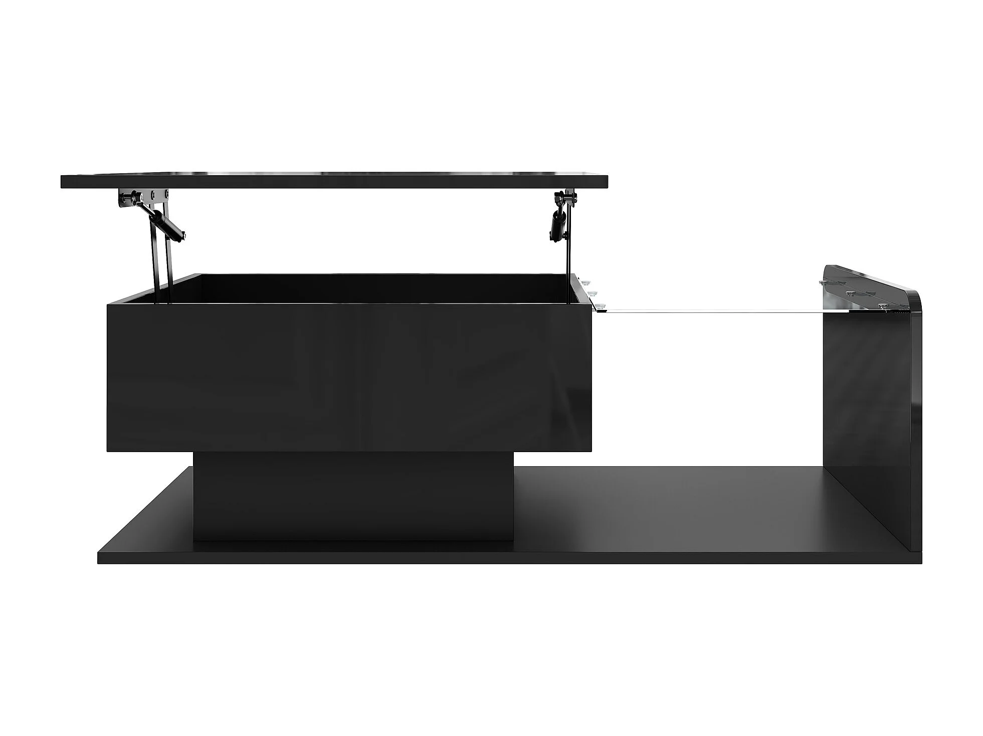Tavolino da caffè nero sollevabile con LED, piano in vetro e contenitore 100x50x33/47,5cm