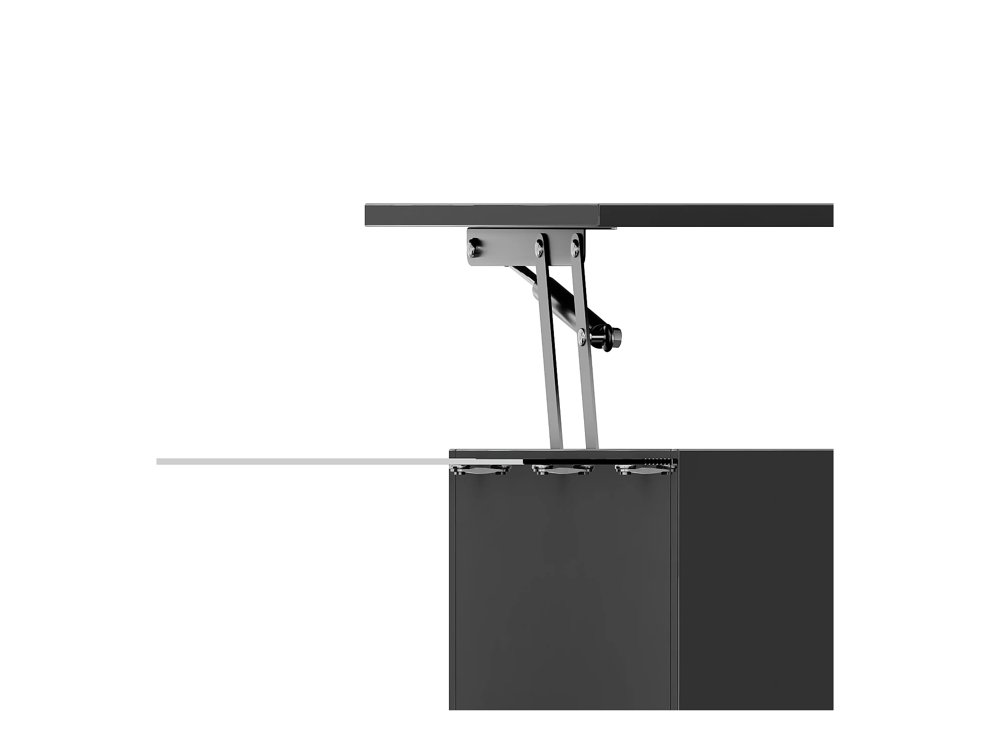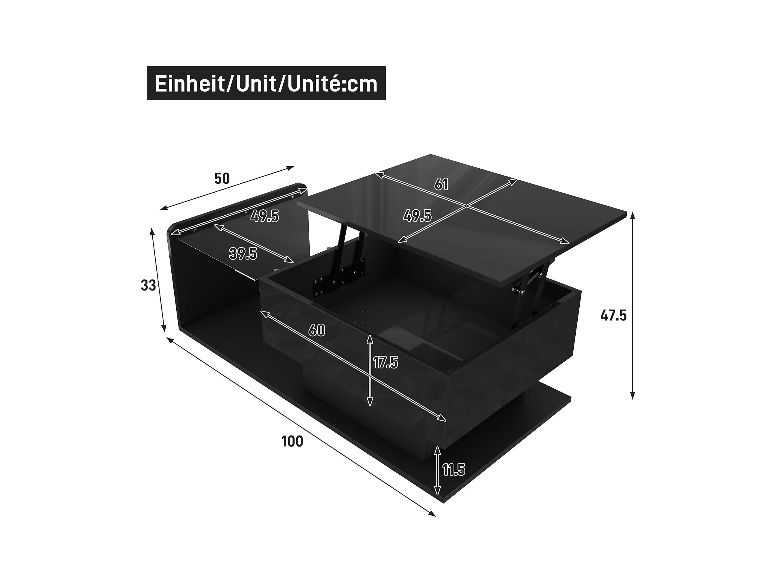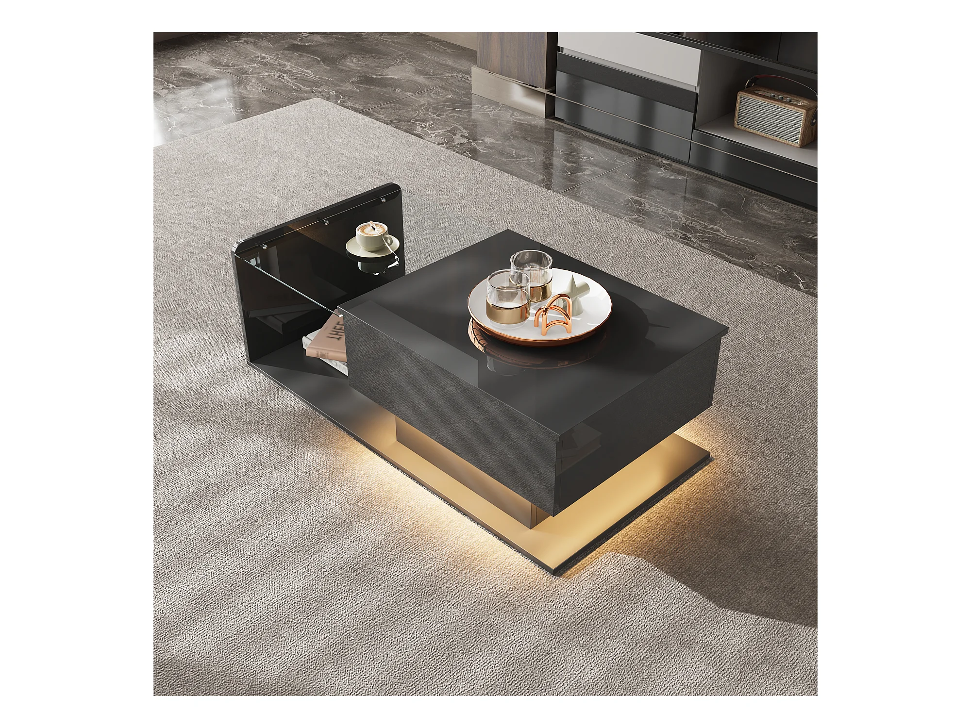 Tavolino da caffè nero sollevabile con LED, piano in vetro e contenitore 100x50x33/47,5cm