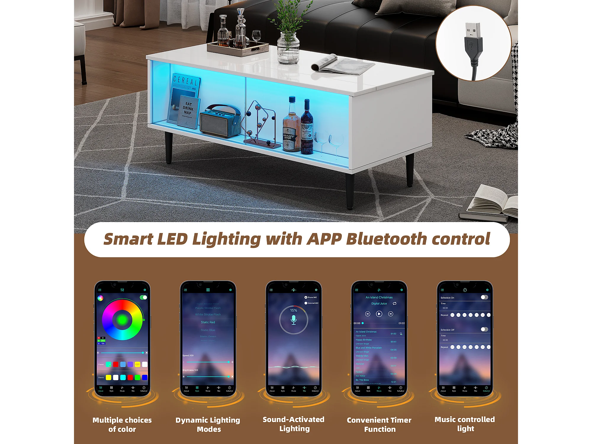 Tavolino da caffè con piano sollevabile, luce LED, spazio nascosto, porta USB e di ricarica, 100x50x35 cm, bianco
