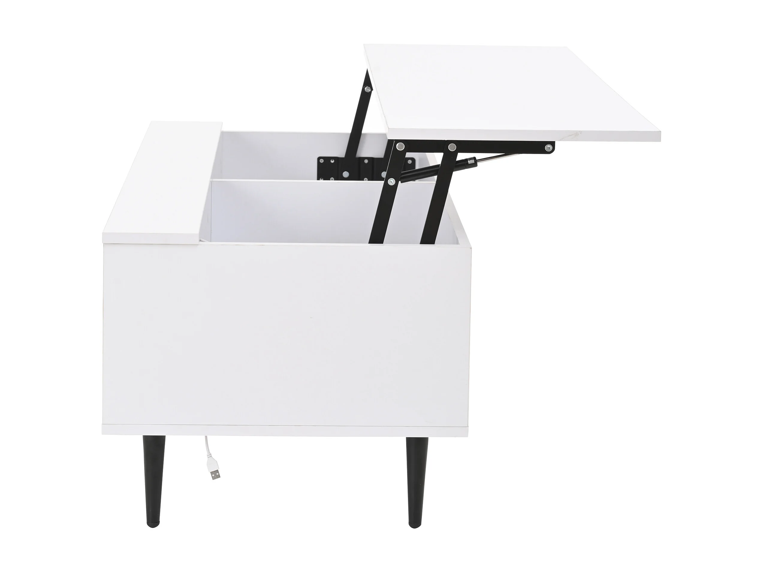Tavolino moderno con doppio meccanismo di sollevamento, contenitore nascosto, truciolare, bianco (100x50x43 cm)