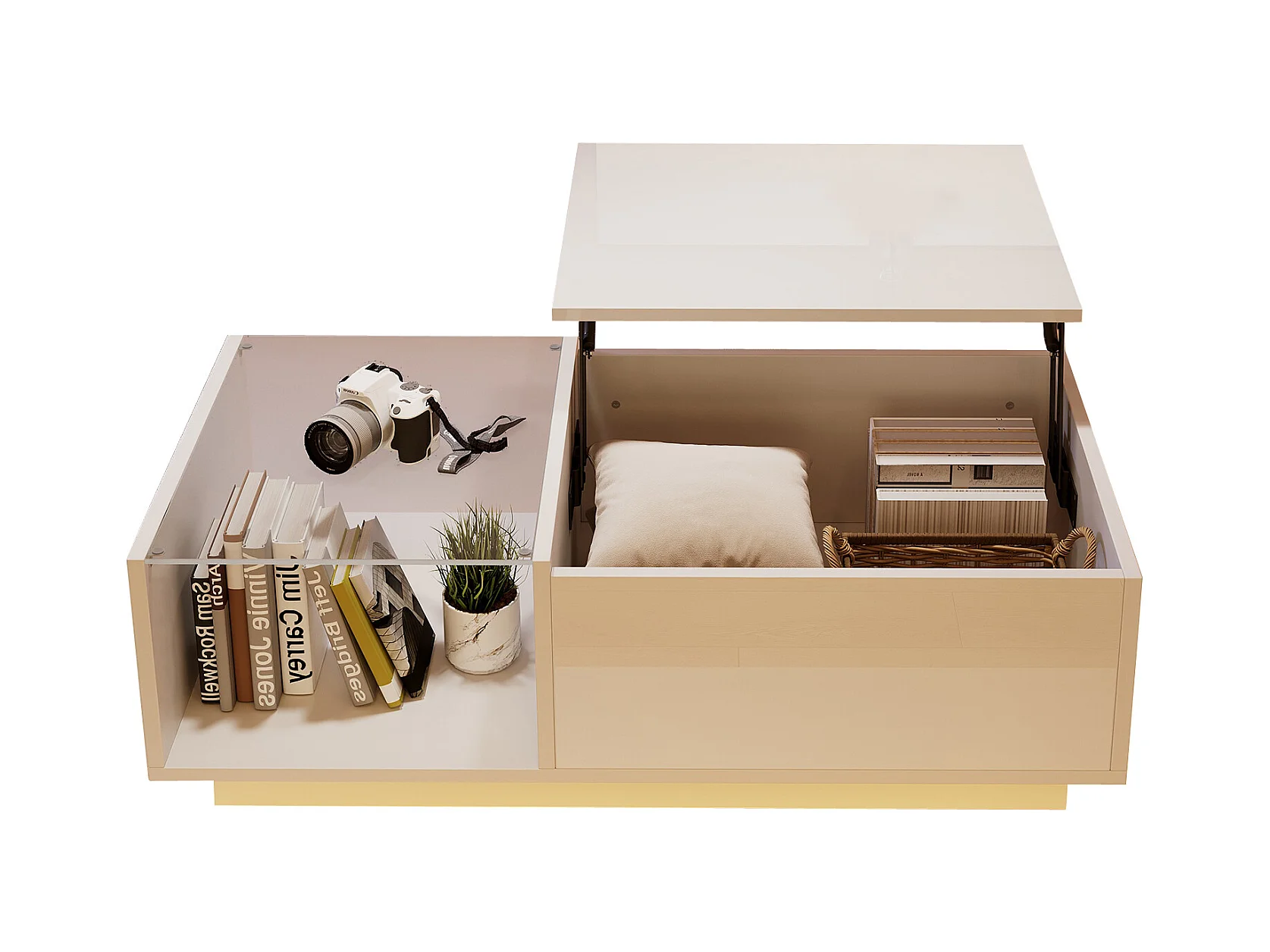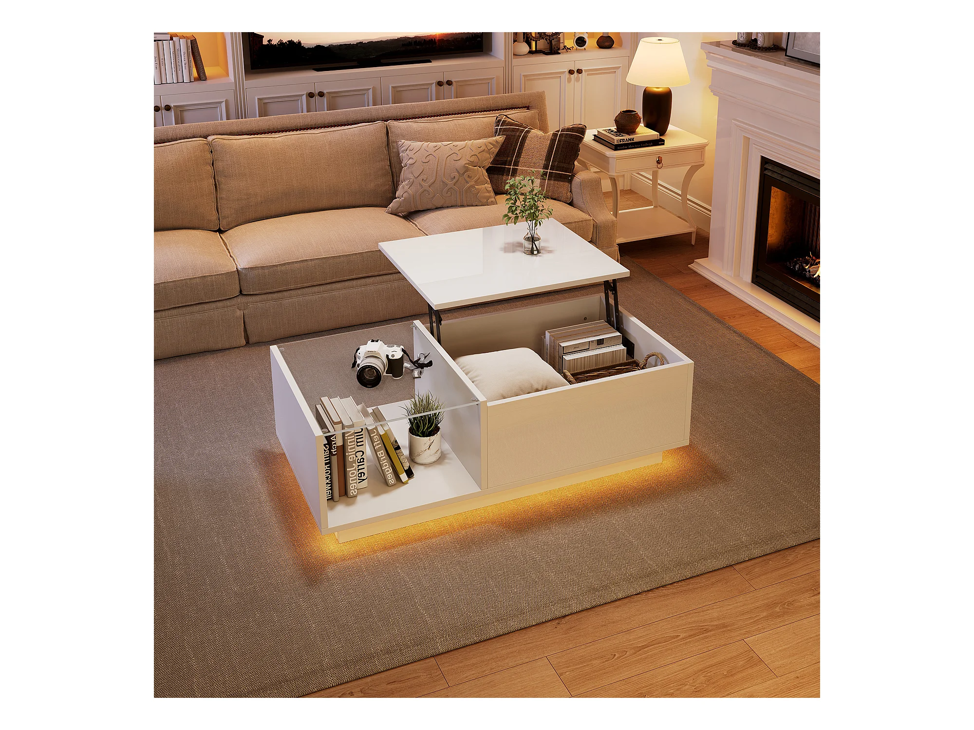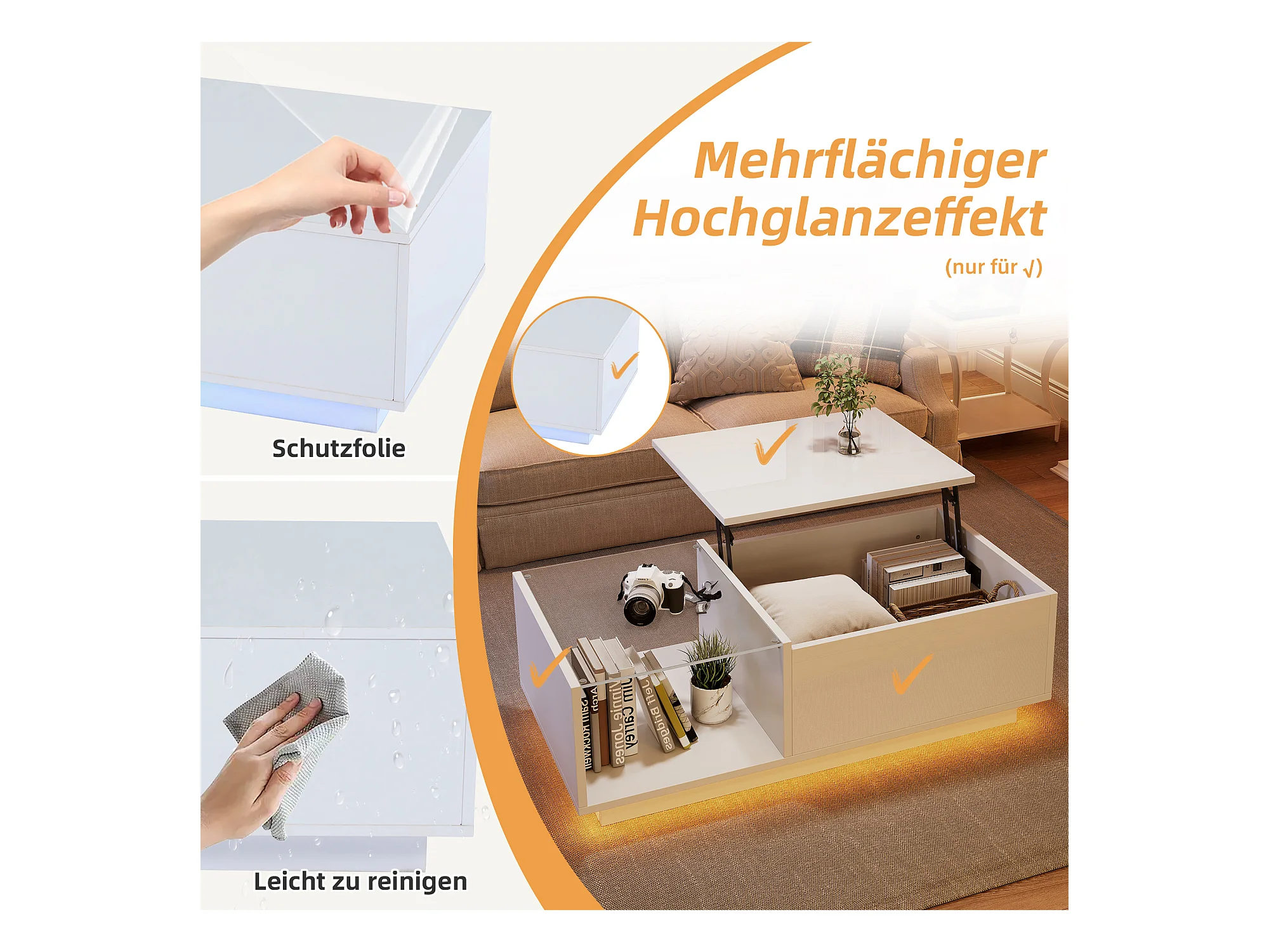 Tavolino da caffè regolabile in altezza con LED, pannello truciolare, bianco, contenitore integrato e illuminazione personalizzabile (100x50x33-46,5 cm)