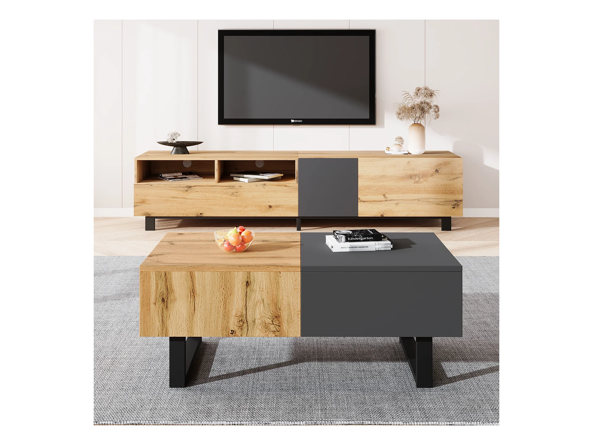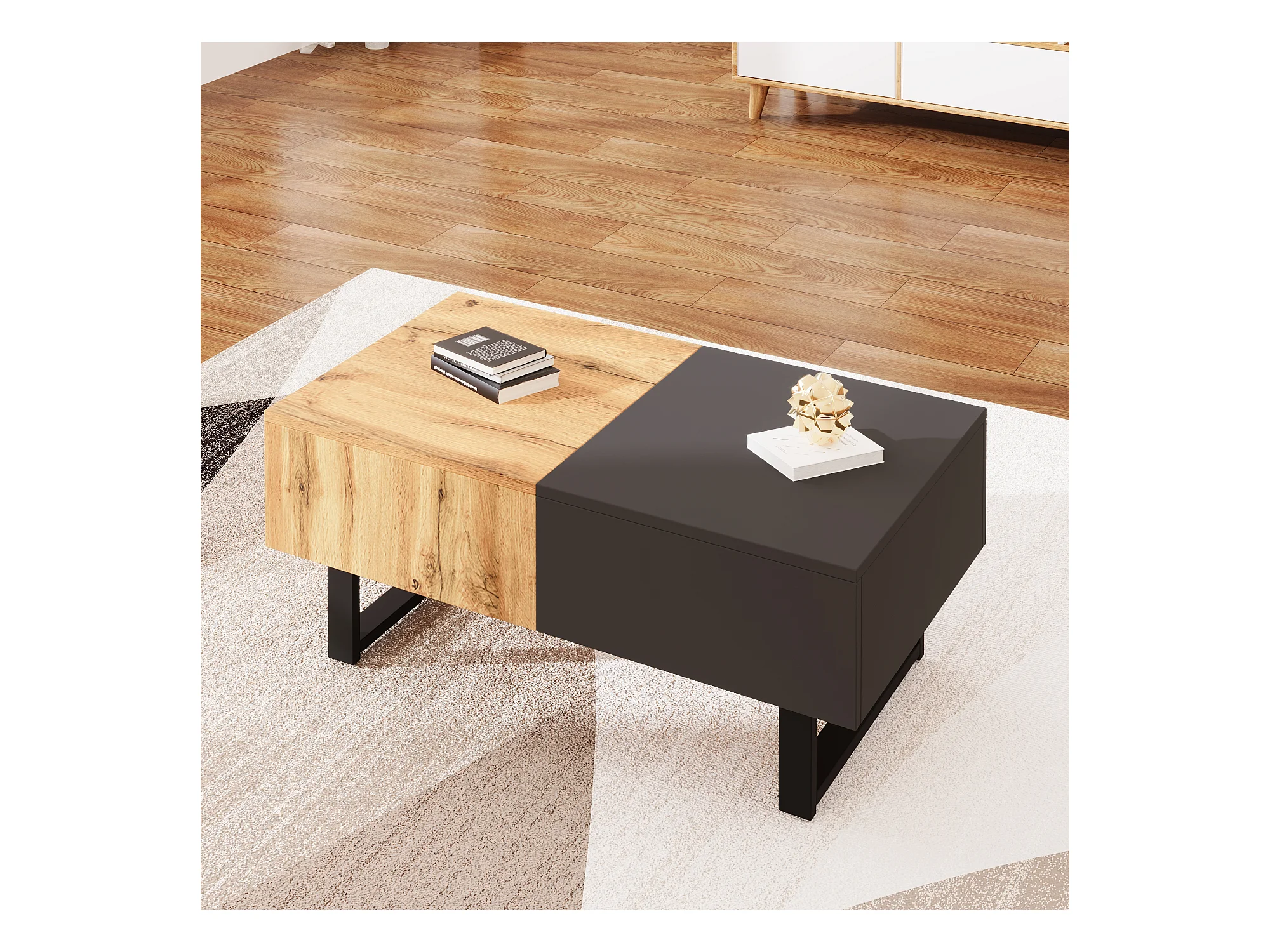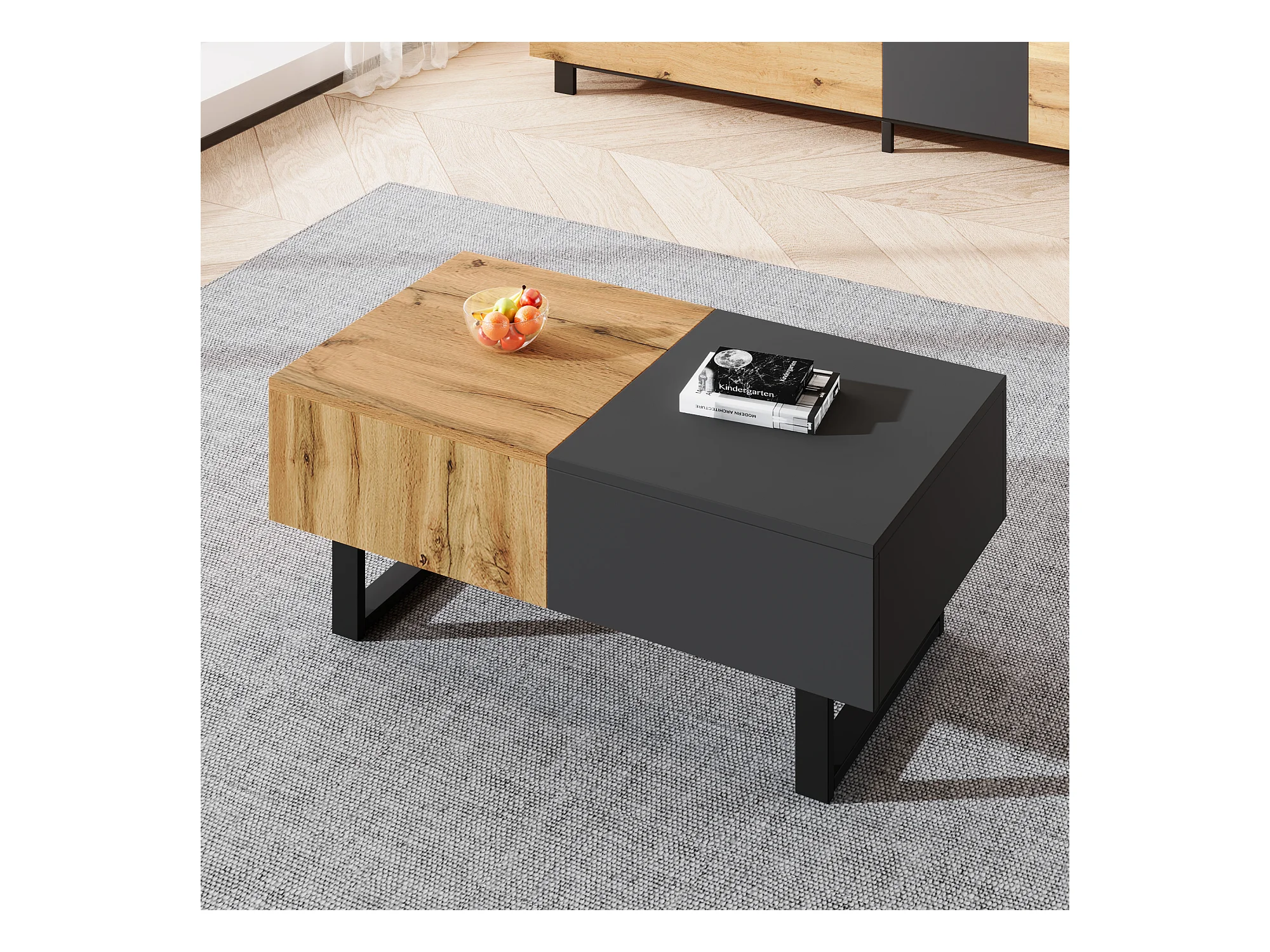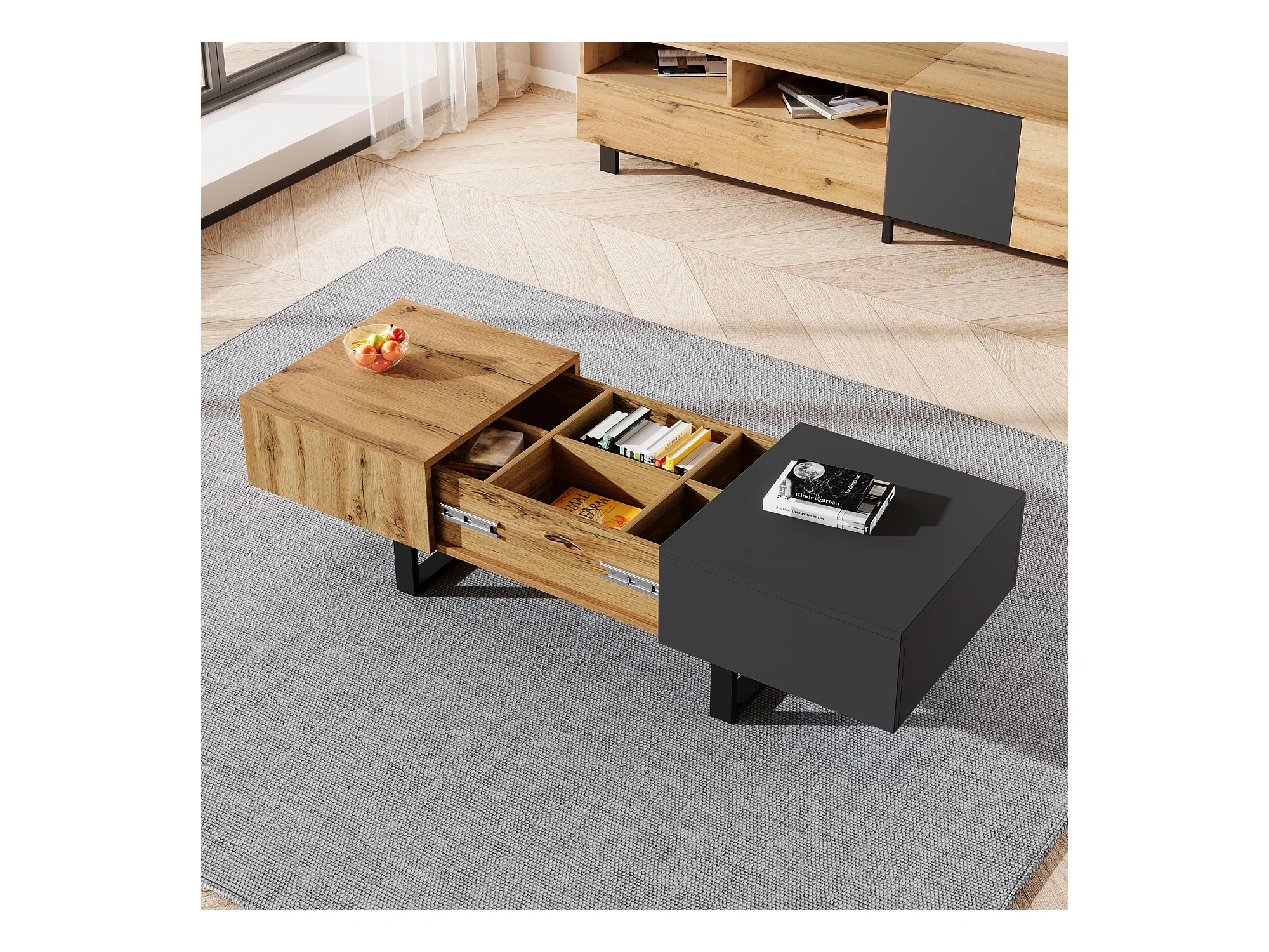 Tavolino da caffè scorrevole moderno multifunzionale, con vano portaoggetti nascosto, in truciolato, metallo naturale e antracite (155x55x40 cm)