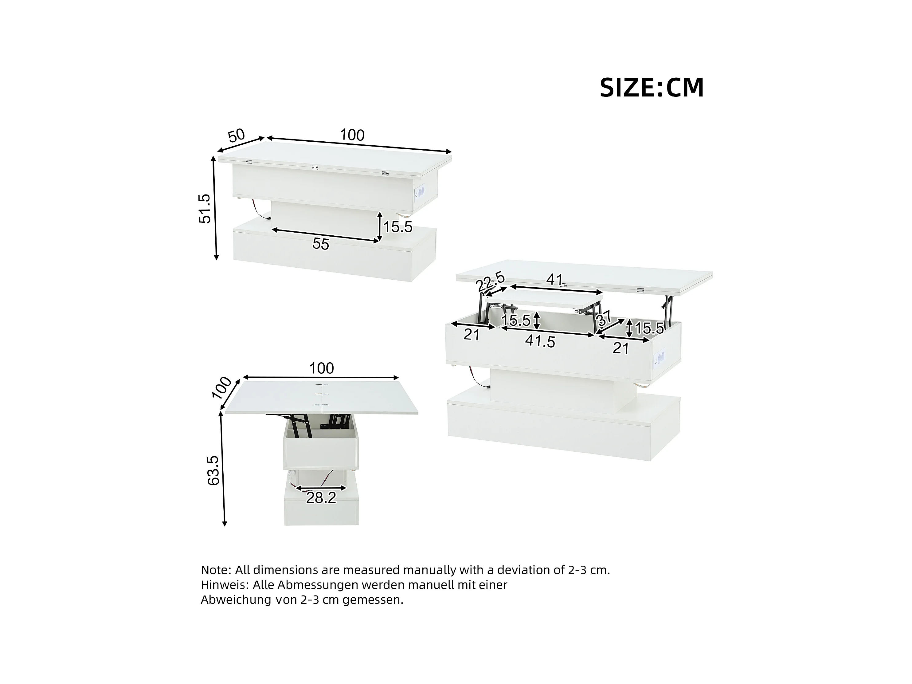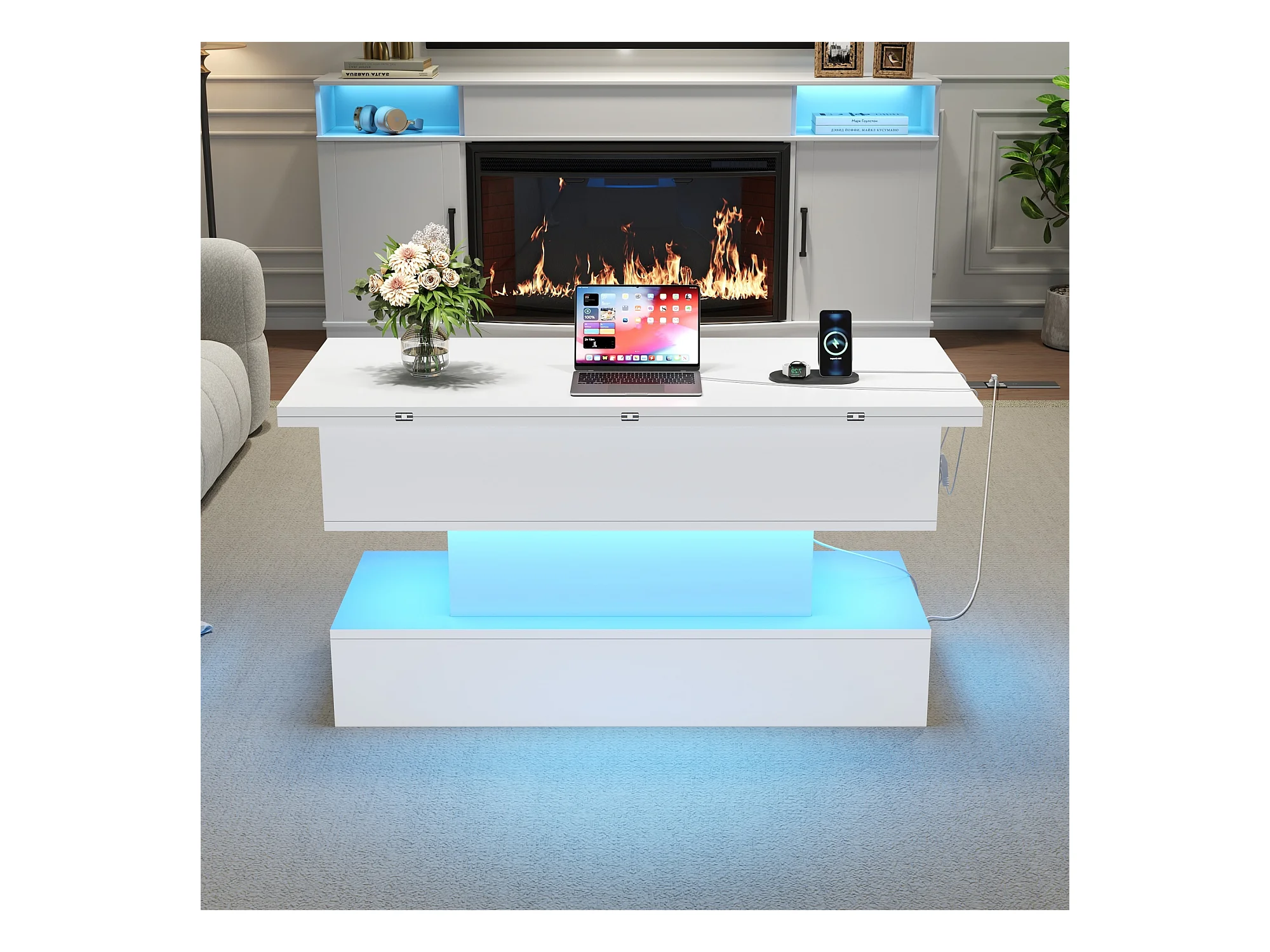 Tavolino da caffè sollevabile bianco con presa di ricarica, illuminazione a LED e spazio di archiviazione, 100 x 50 x 51,5 cm