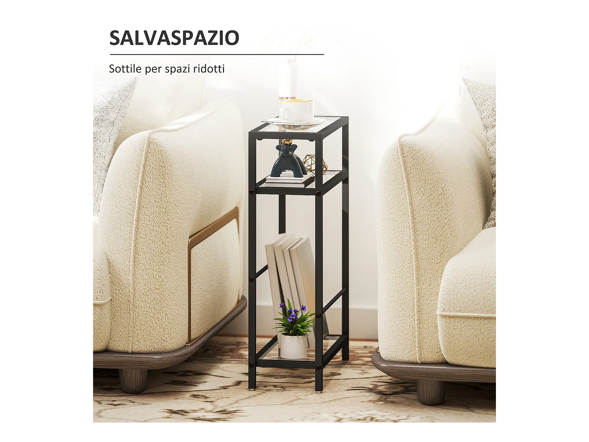 Tavolino da salotto a 3 ripiani compatto in vetro e acciaio nero