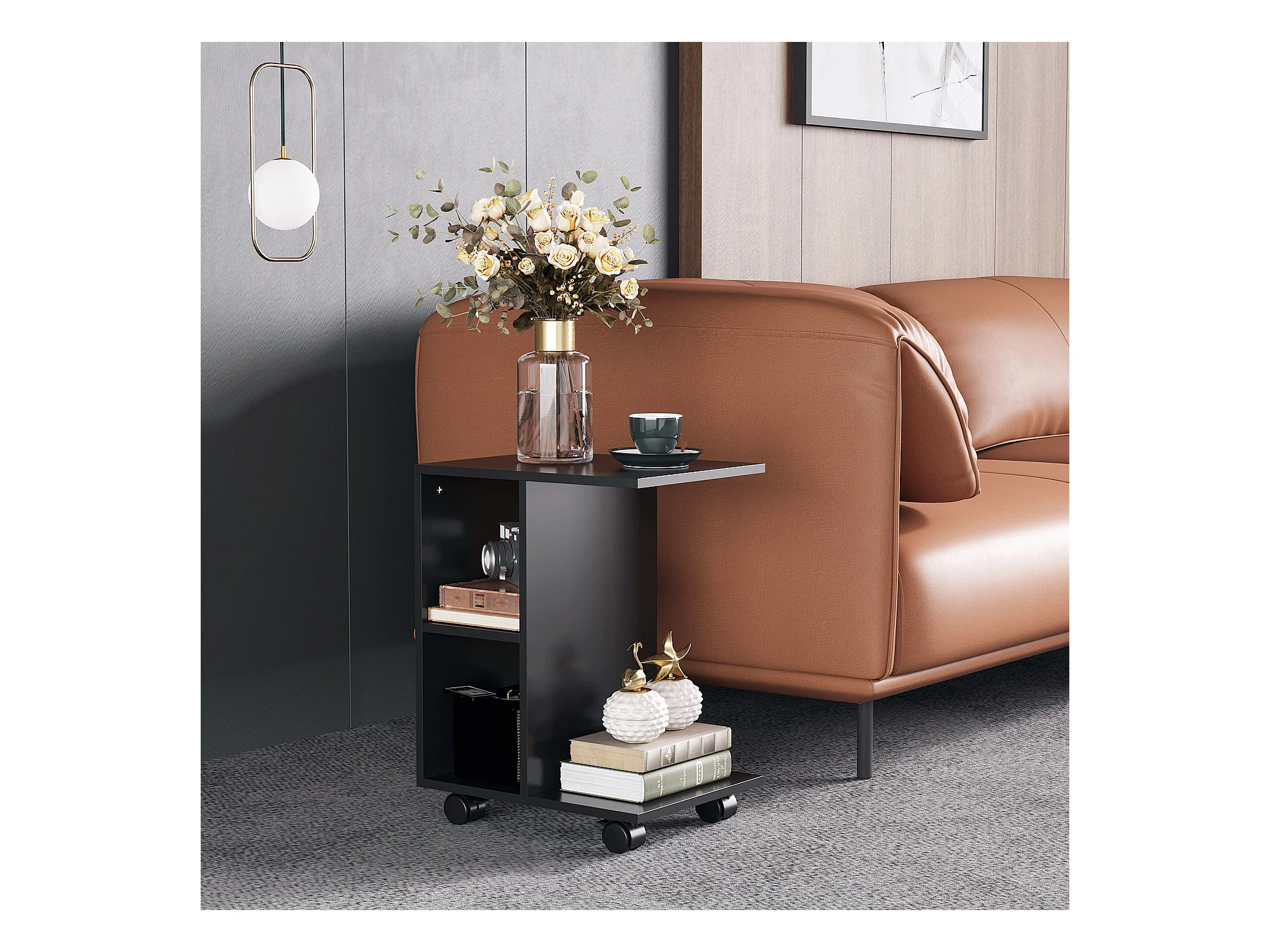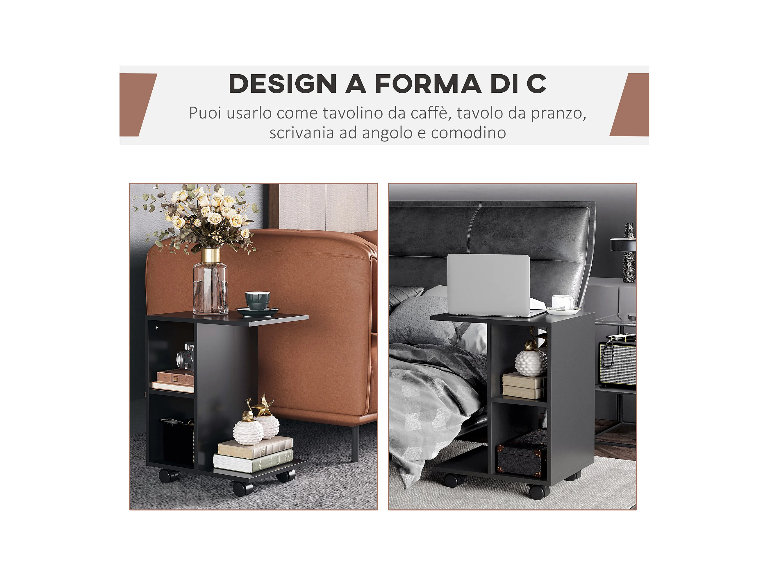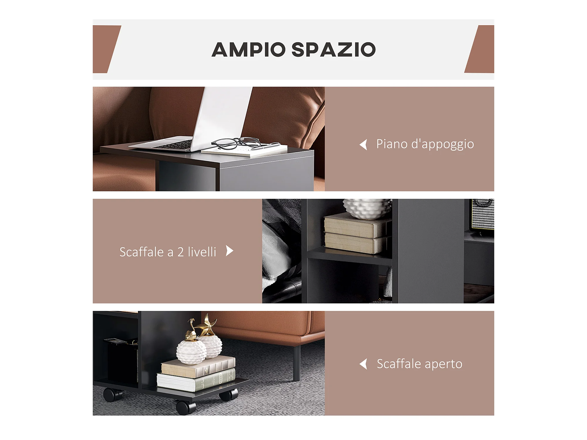 Tavolino da salotto a c 2 ripiani aperti 4 ruote girevoli nero