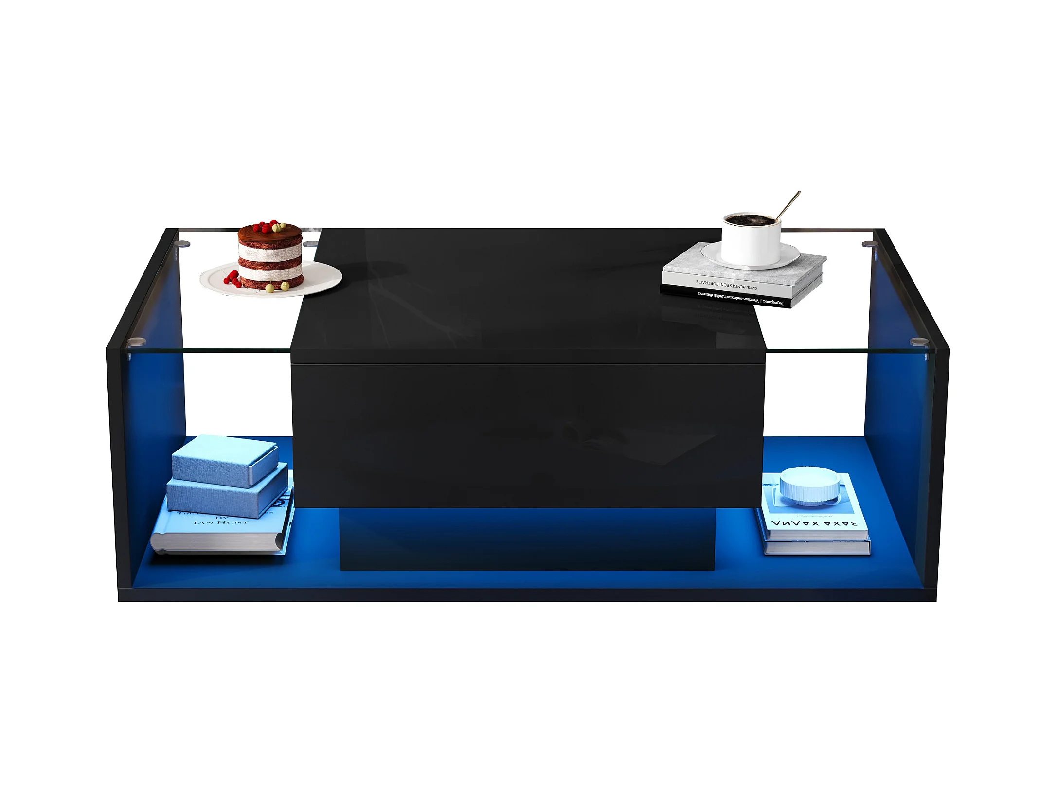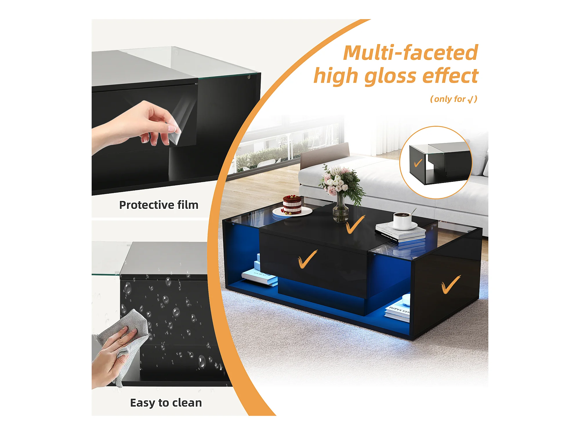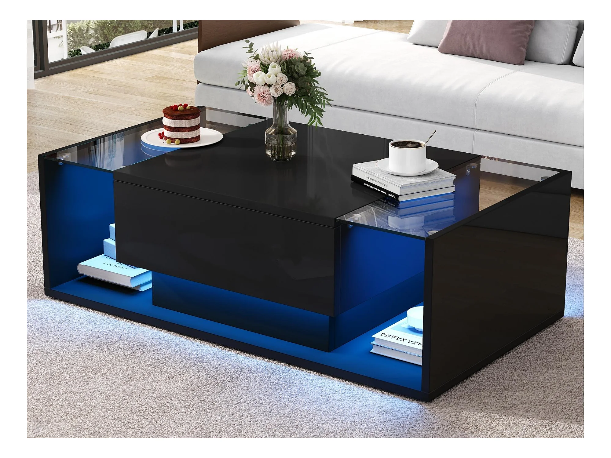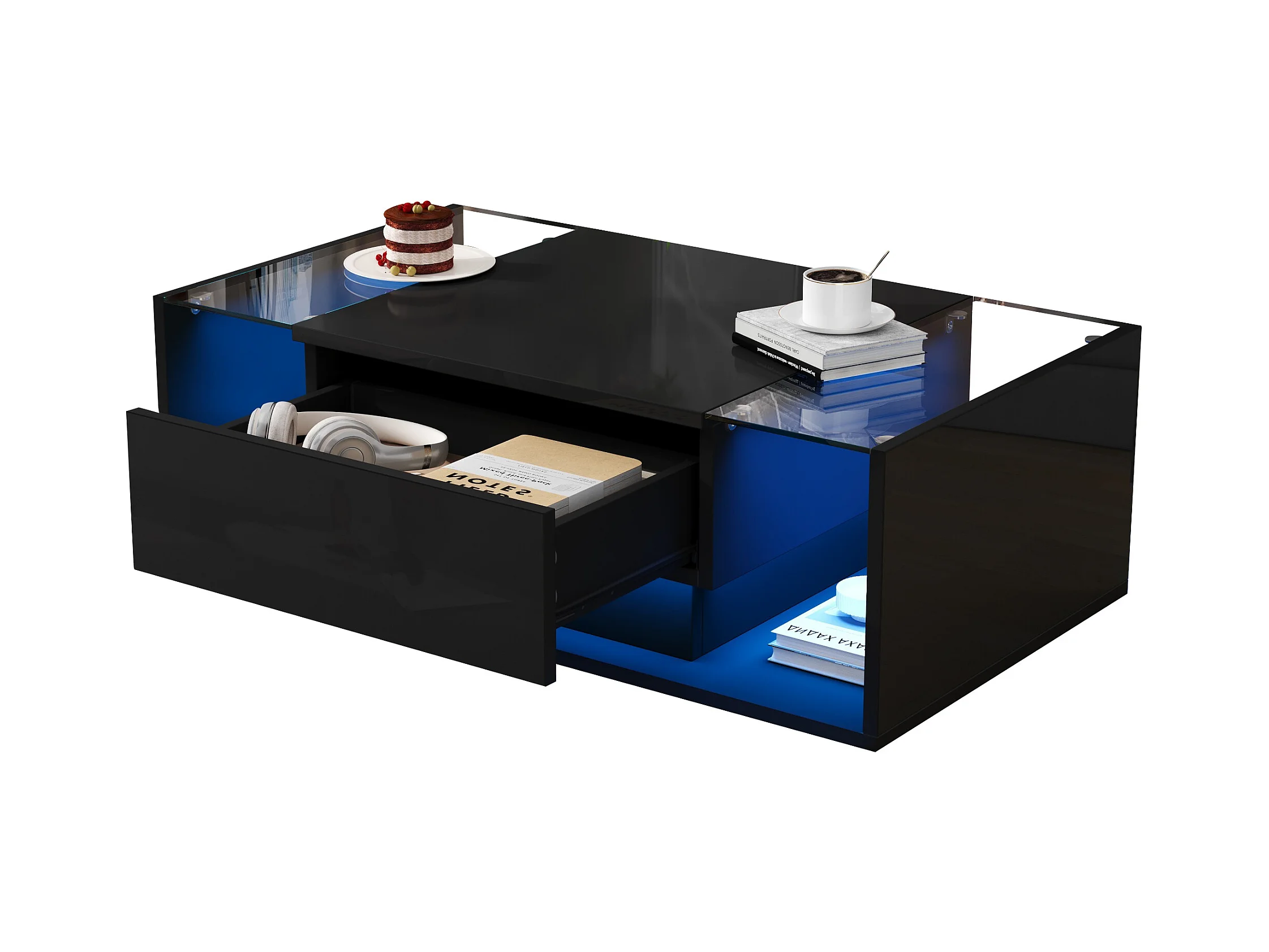 Tavolino da salotto alto splendore 100x50x31 cm - 1 cassetto - con illuminazione LED - Vetro temperato - Nero