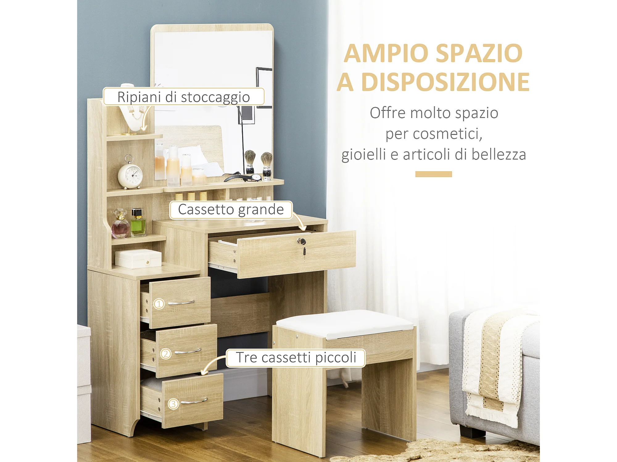 Tavolino da trucco con sgabello specchio cassetti e ripiani legno
