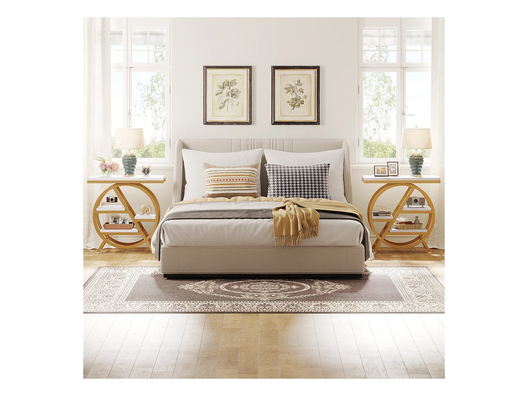 Tavolino rotondo moderno bianco e oro con ripiani in finto marmo, comodino a 2 livelli