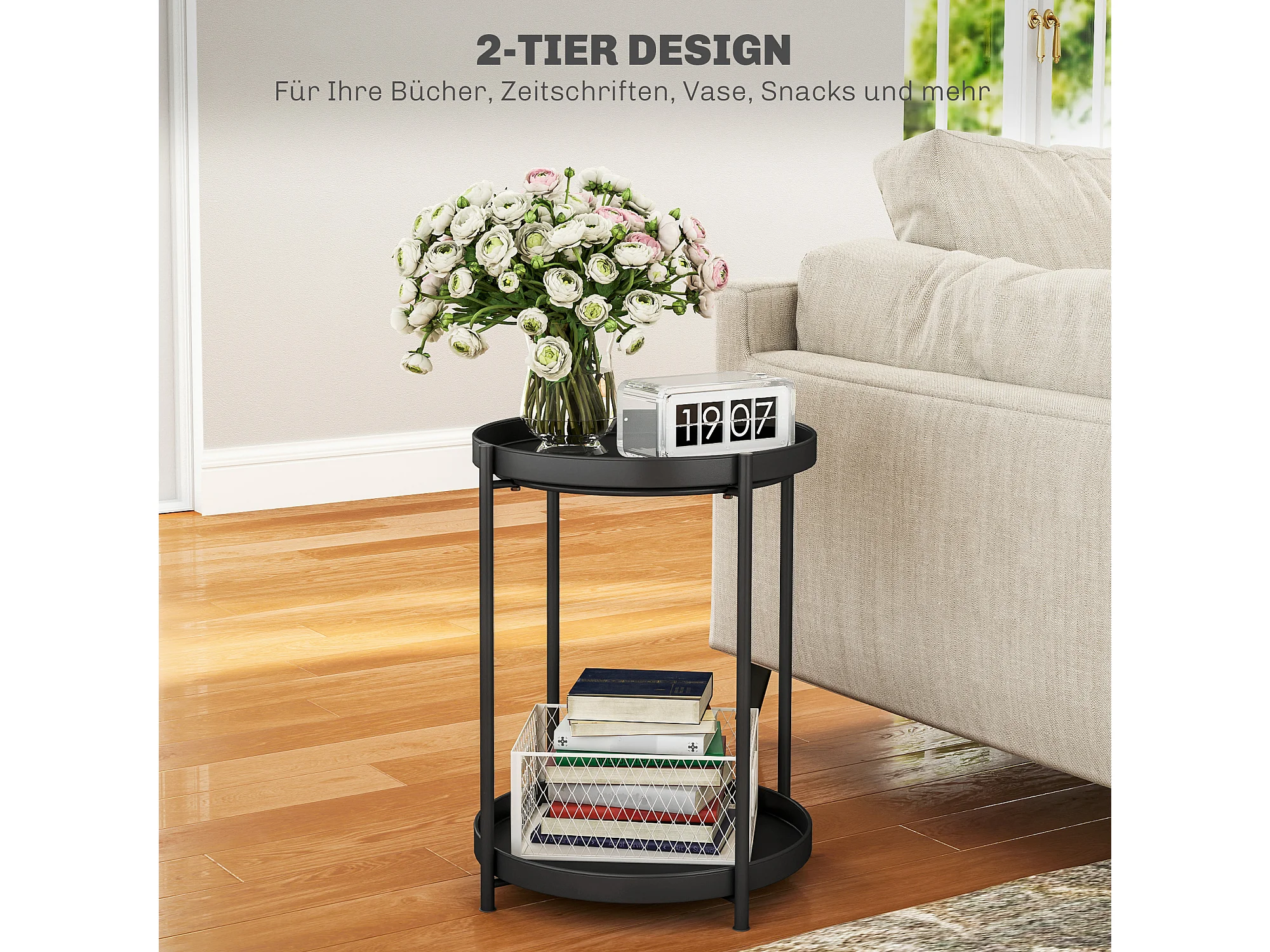 Tavolino laterale rotondo, tavolino da caffè a 2 ripiani, struttura in acciaio, tavolino rimovibile, nero