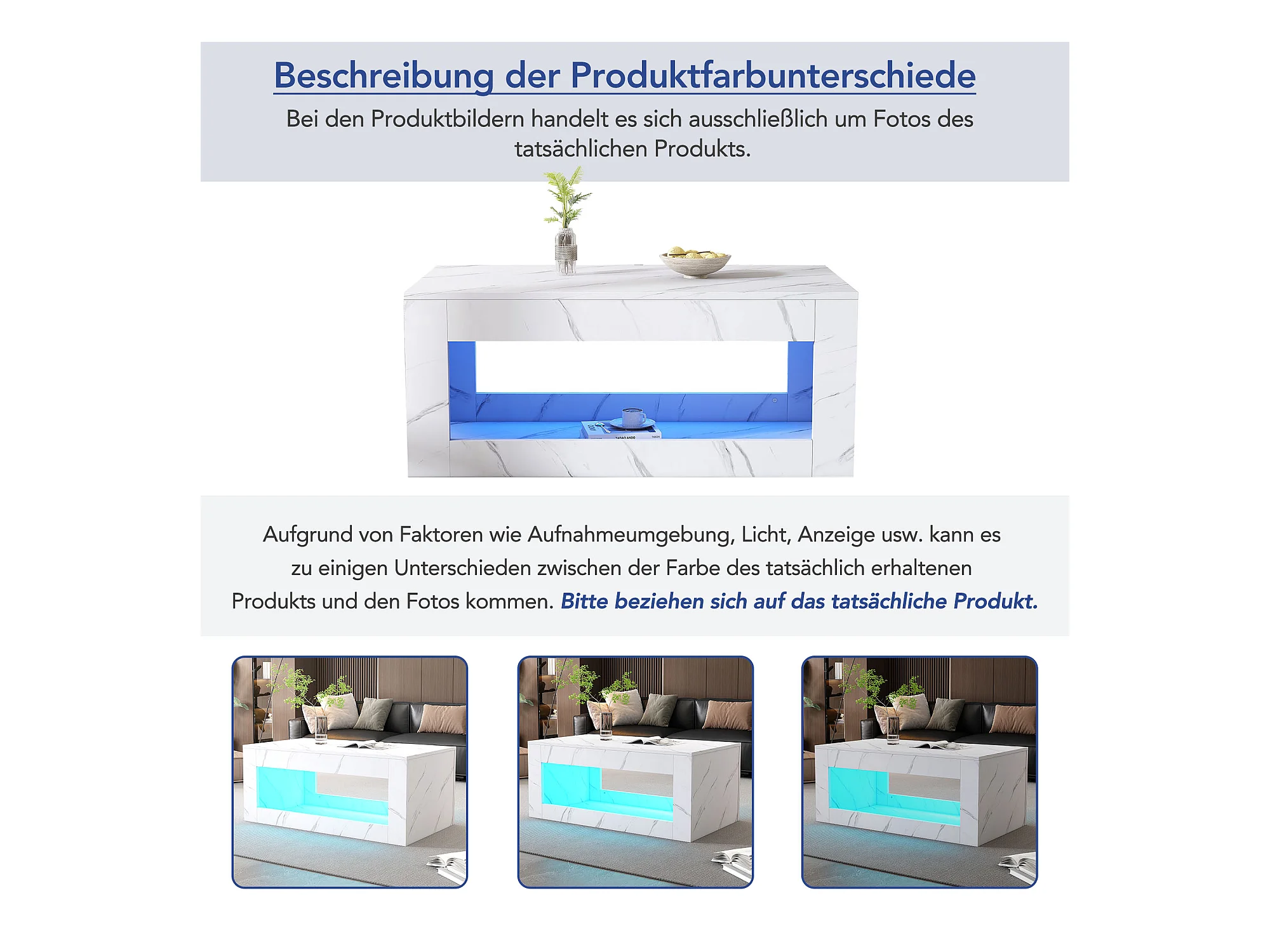 Tavolino da caffè lucido con superficie effetto marmo bianco, struttura colorblock nera, con illuminazione LED controllata tramite app (100x50x34,5 cm)