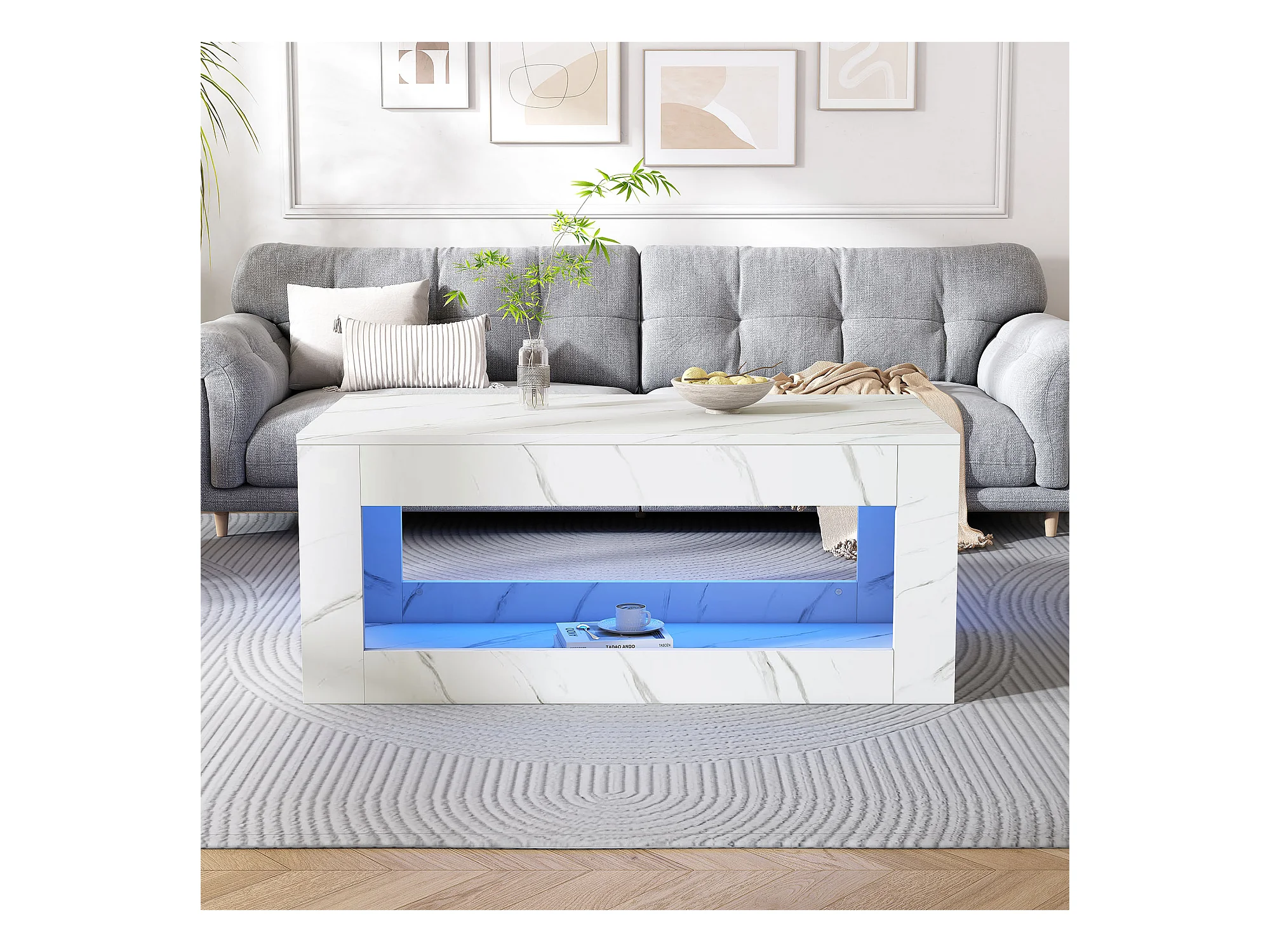 Tavolino da caffè effetto marmo bianco con illuminazione a LED, piano in vetro e 2 cassetti, pannelli in MDF (100x50x35cm)