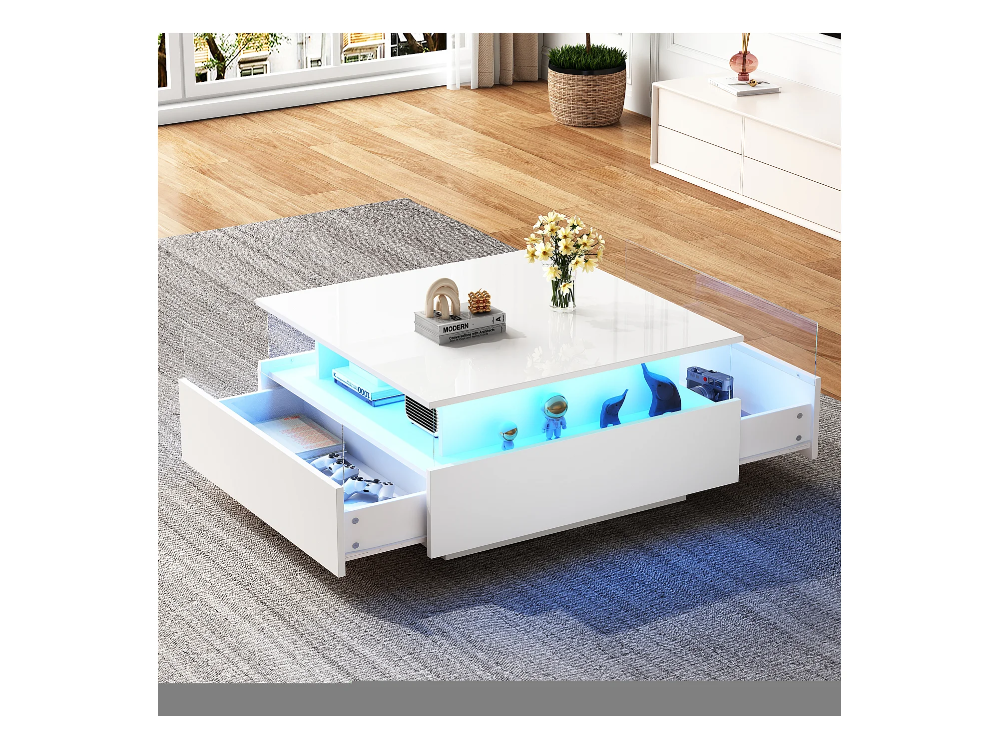 Tavolino moderno con illuminazione a LED, 2 cassetti, pannello in acrilico trasparente, materiali MDF, bianco (70x70x41 cm)