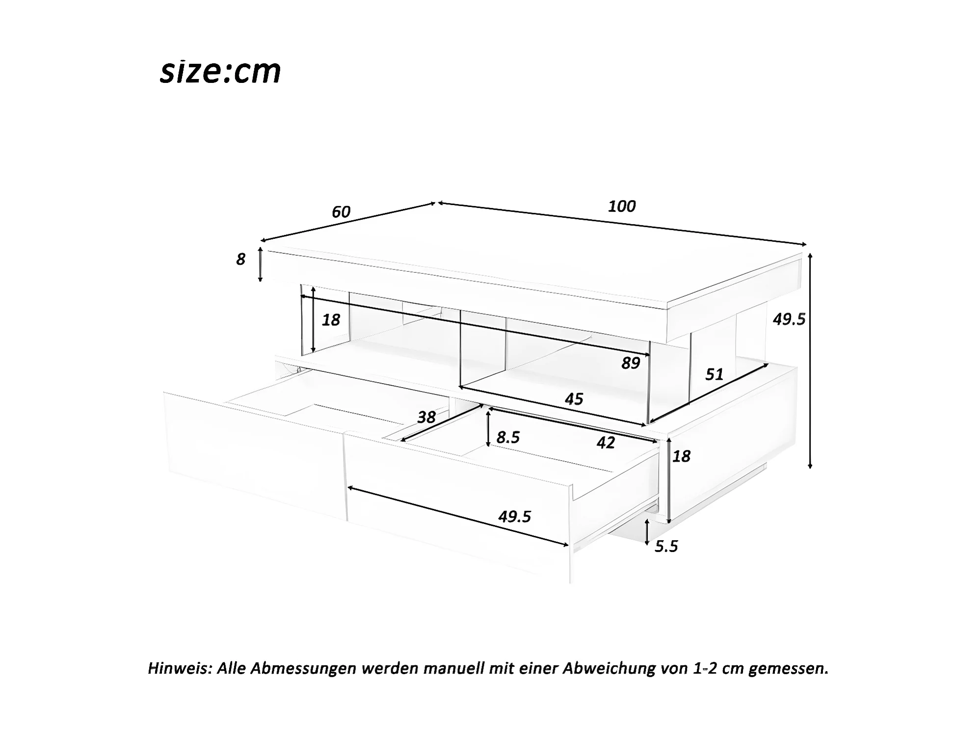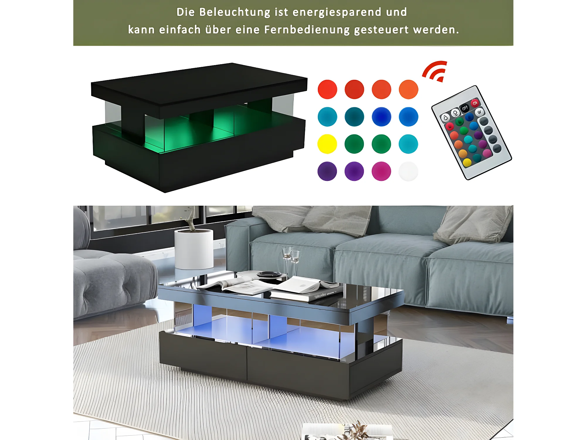 Tavolino moderno in legno con cassetti e illuminazione a LED