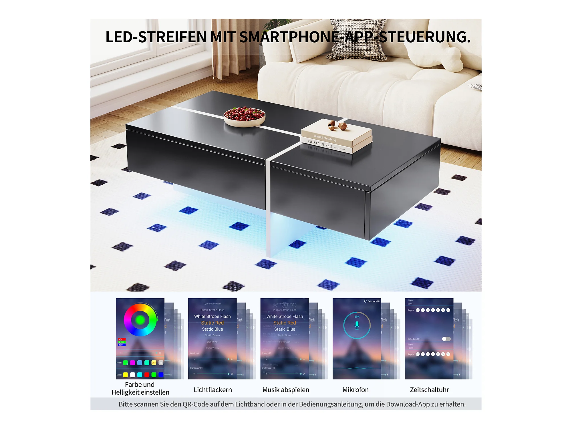 Tavolino nero lucido, tavolo da salotto, piano in marmo con LED, 100 x 50 x 34,5 cm