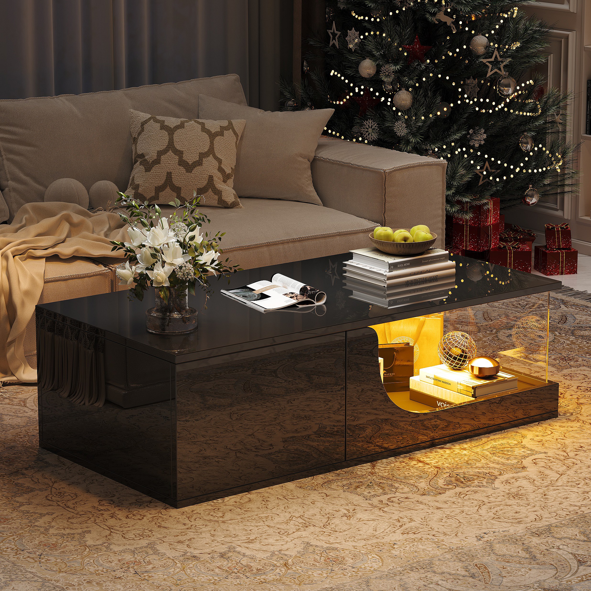 Tavolino da caffè nero lucido - Tavolino da caffè con 2 cassetti e illuminazione a LED - pannello porta a ribalta