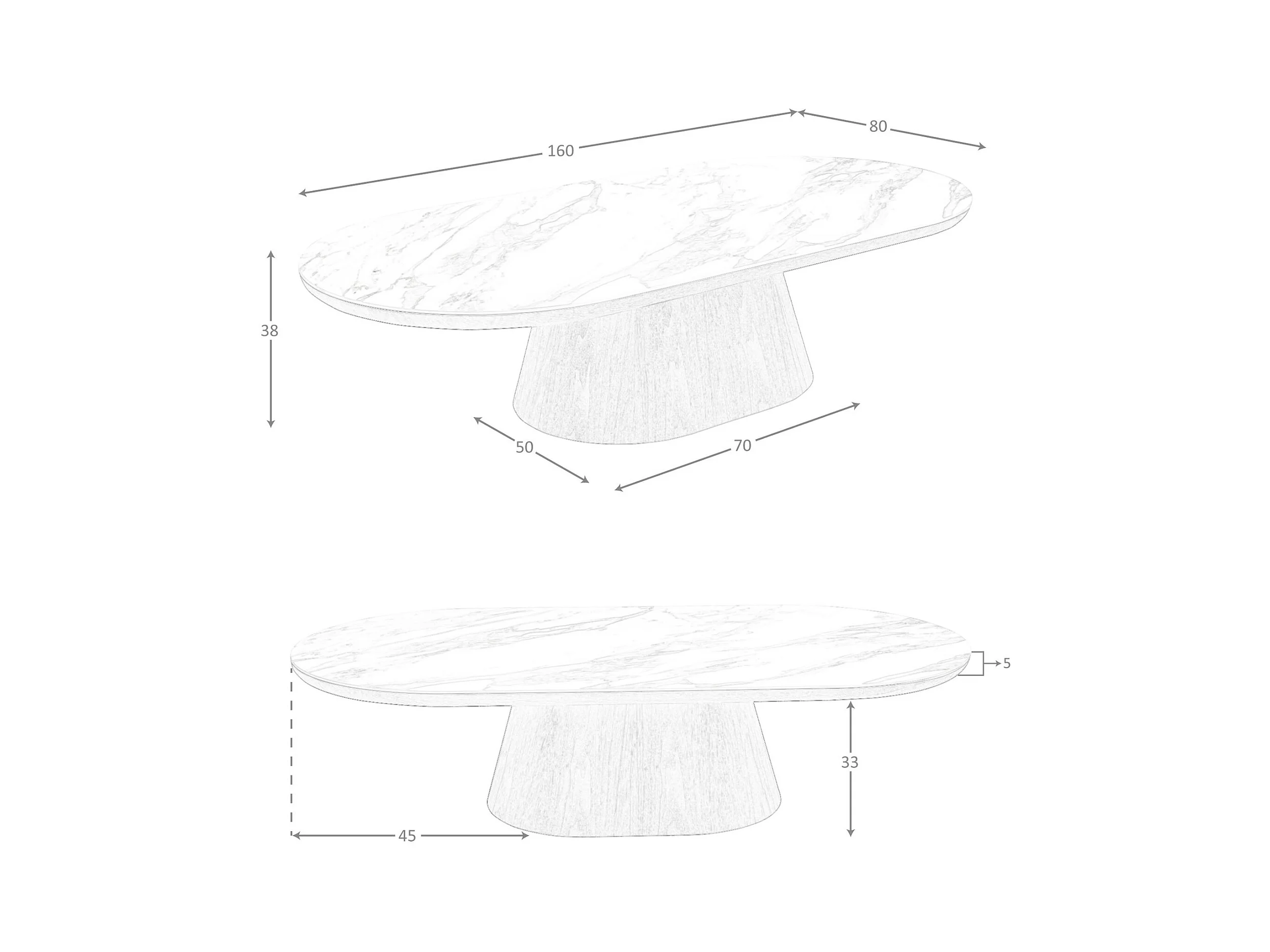 Tavolino ovale semicircolare in marmo porcellanato e noce