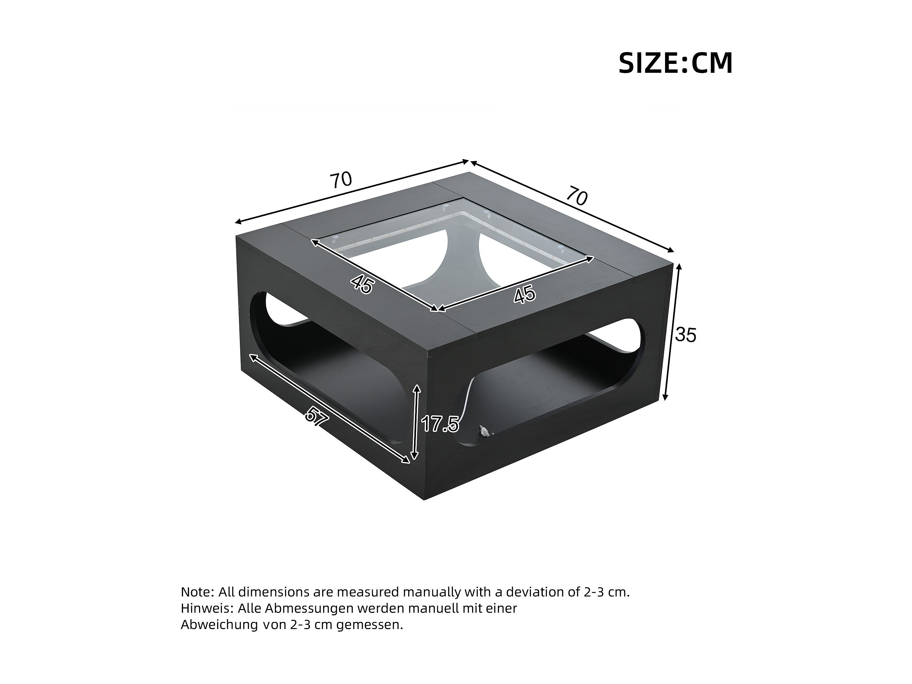 Tavolino quadrato nero con illuminazione a LED, piano in vetro 70x70x35cm