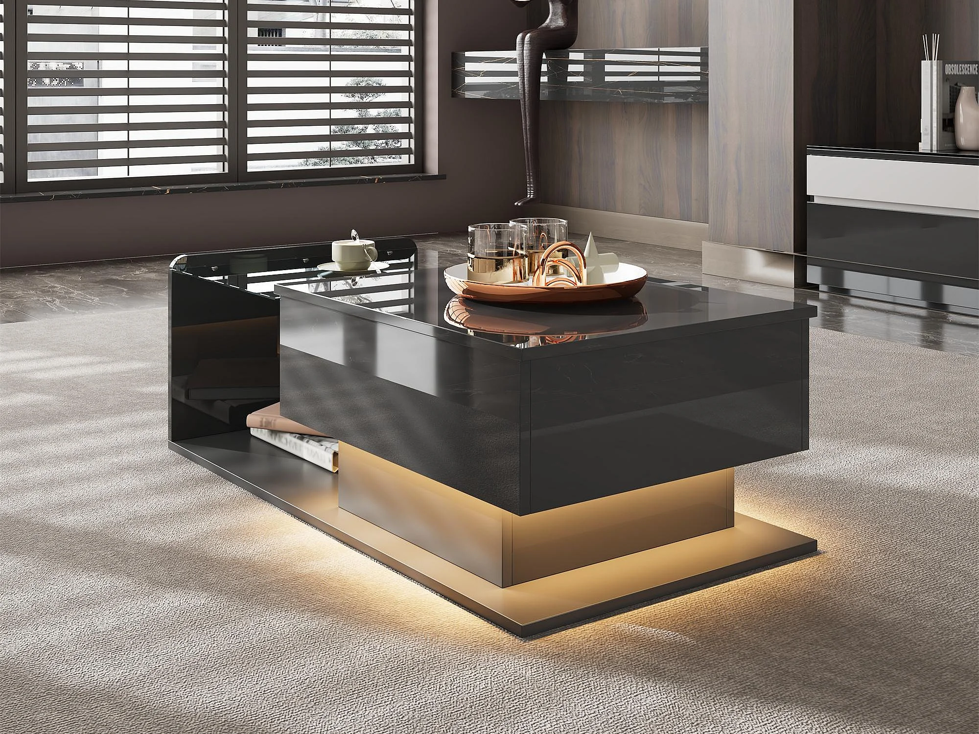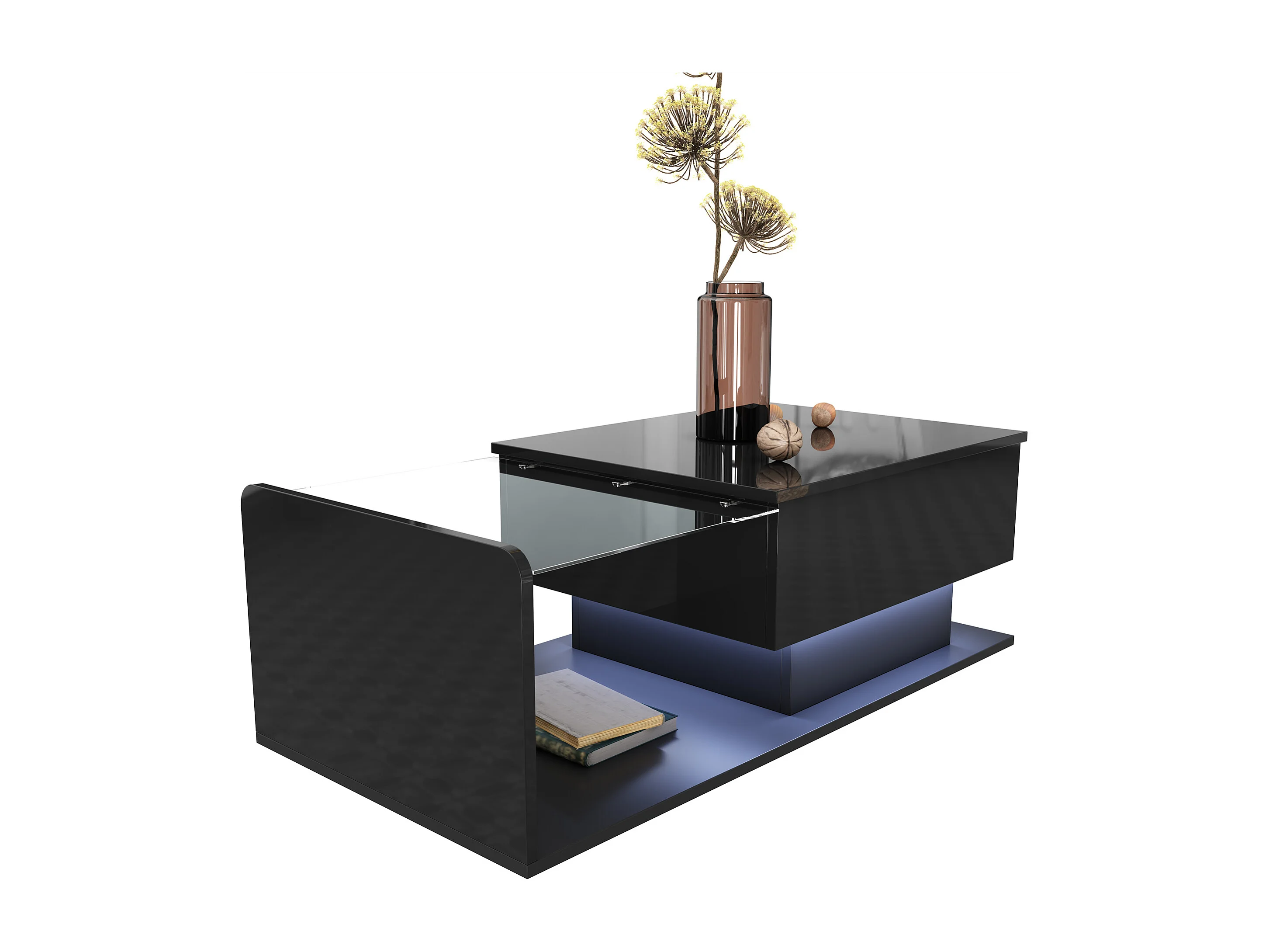 Tavolino regolabile ad alto lucido 100×50×47,5 cm - Piano in vetro - Illuminazione LED - Pannelli di particelle - nero