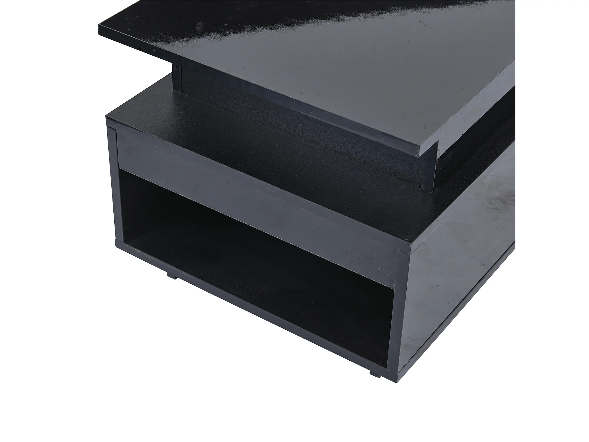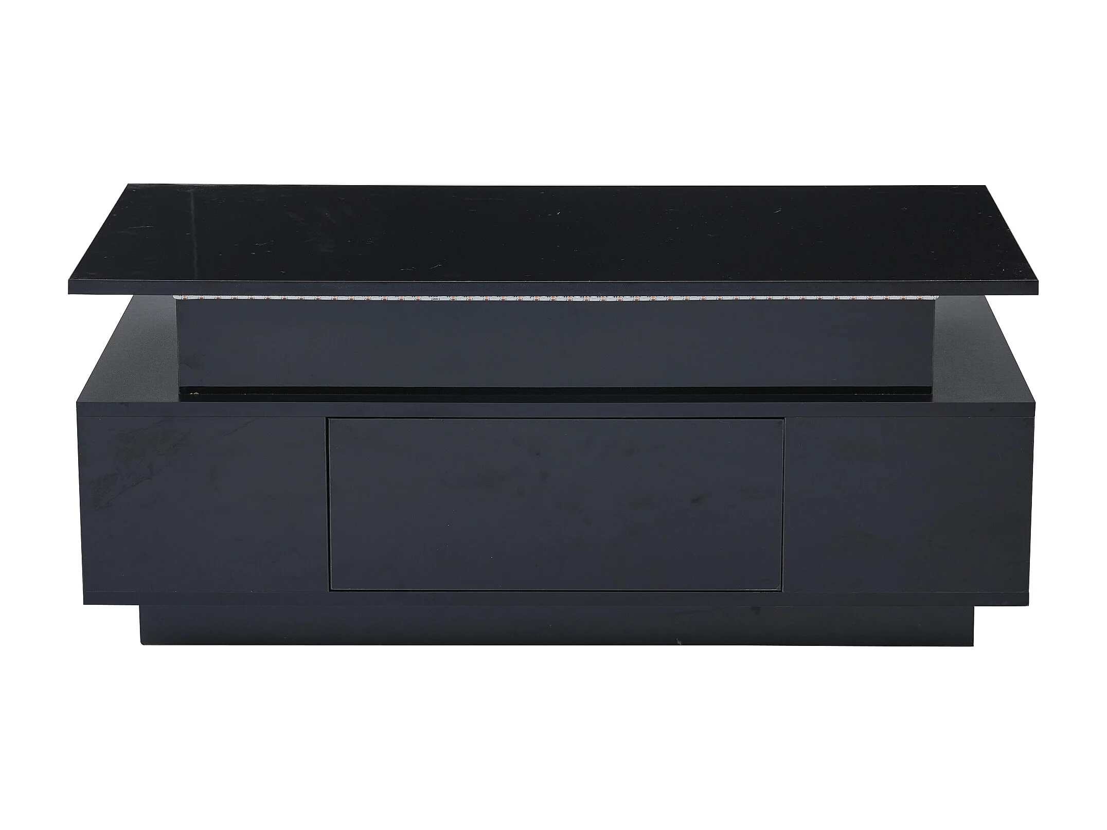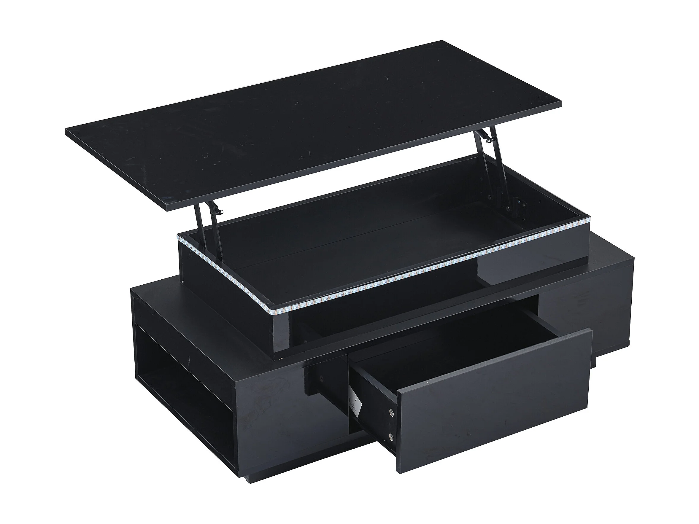 Tavolino rettangolare 96x45x40cm con piano sollevabile e 1 cassetto, ampio vano portaoggetti integrato, LED incluso, corpo laccato nero lucido