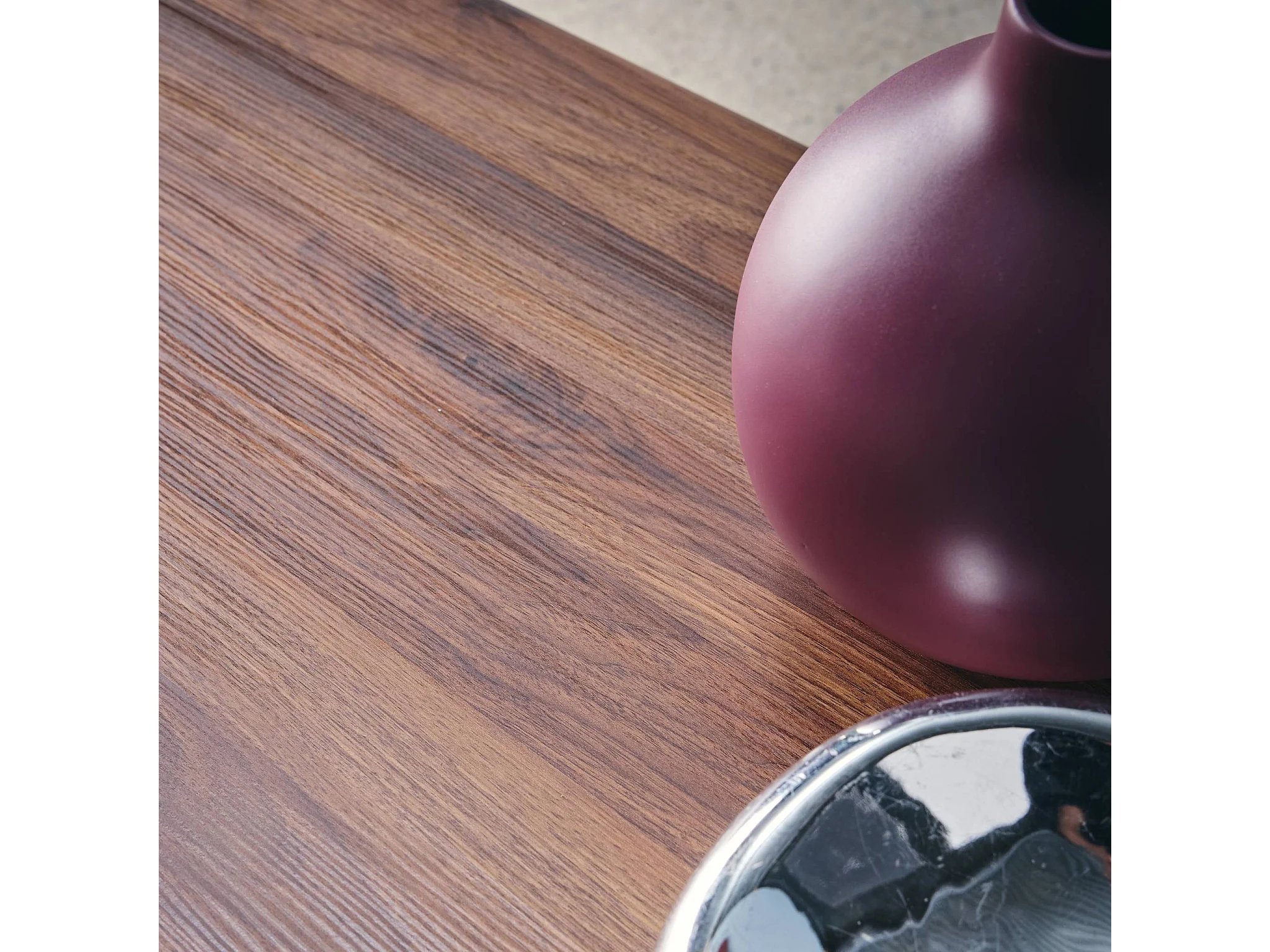 Tavolino rettangolare con gambe cromate e decorazioni in legno, noce