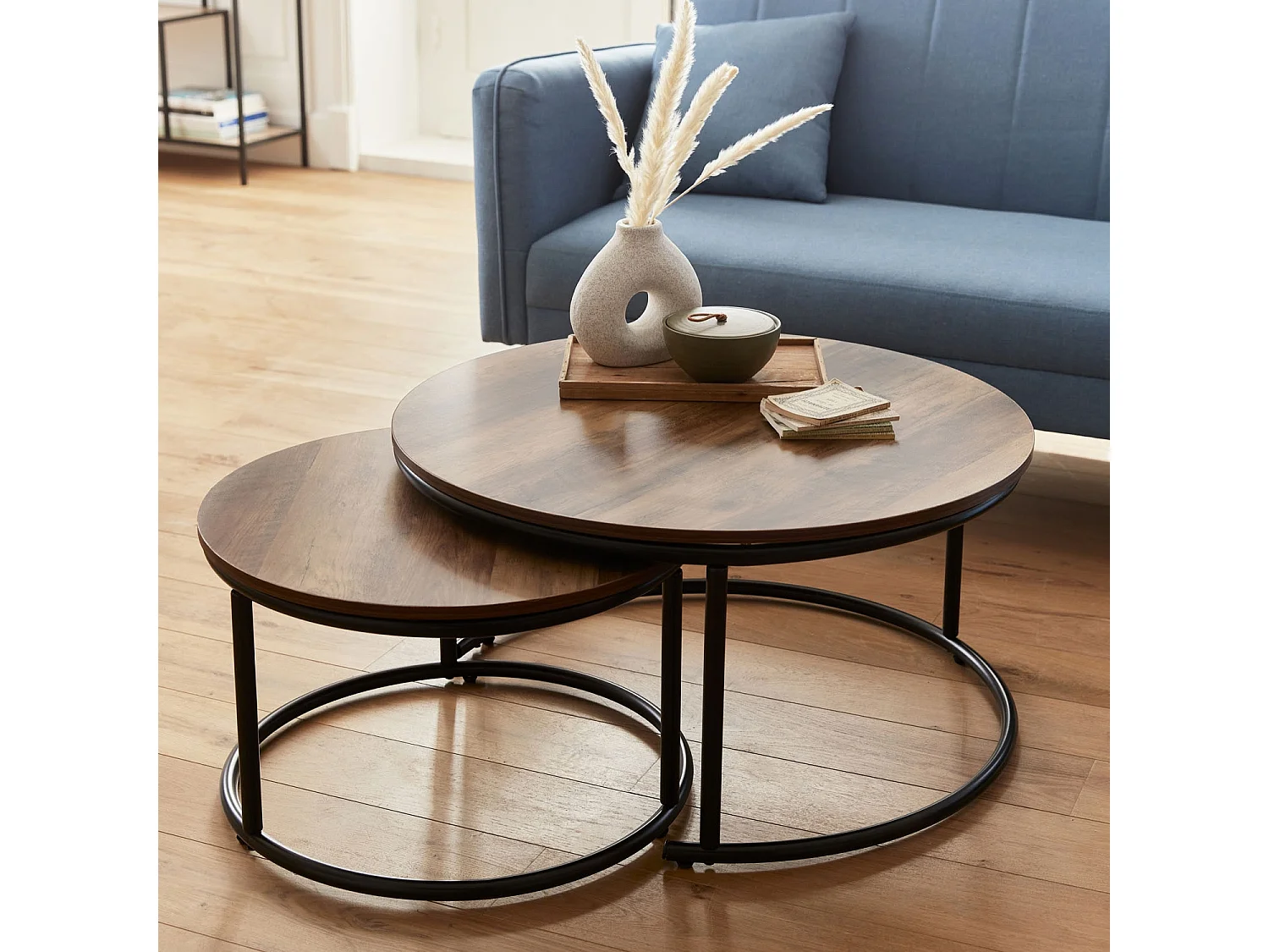 Set di 2 tavolini rotondi impilabili effetto quercia, noce