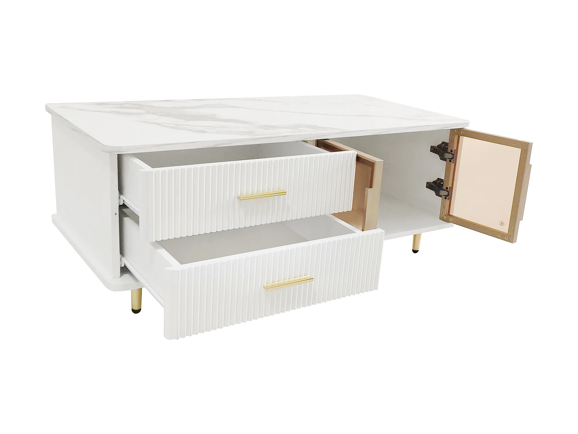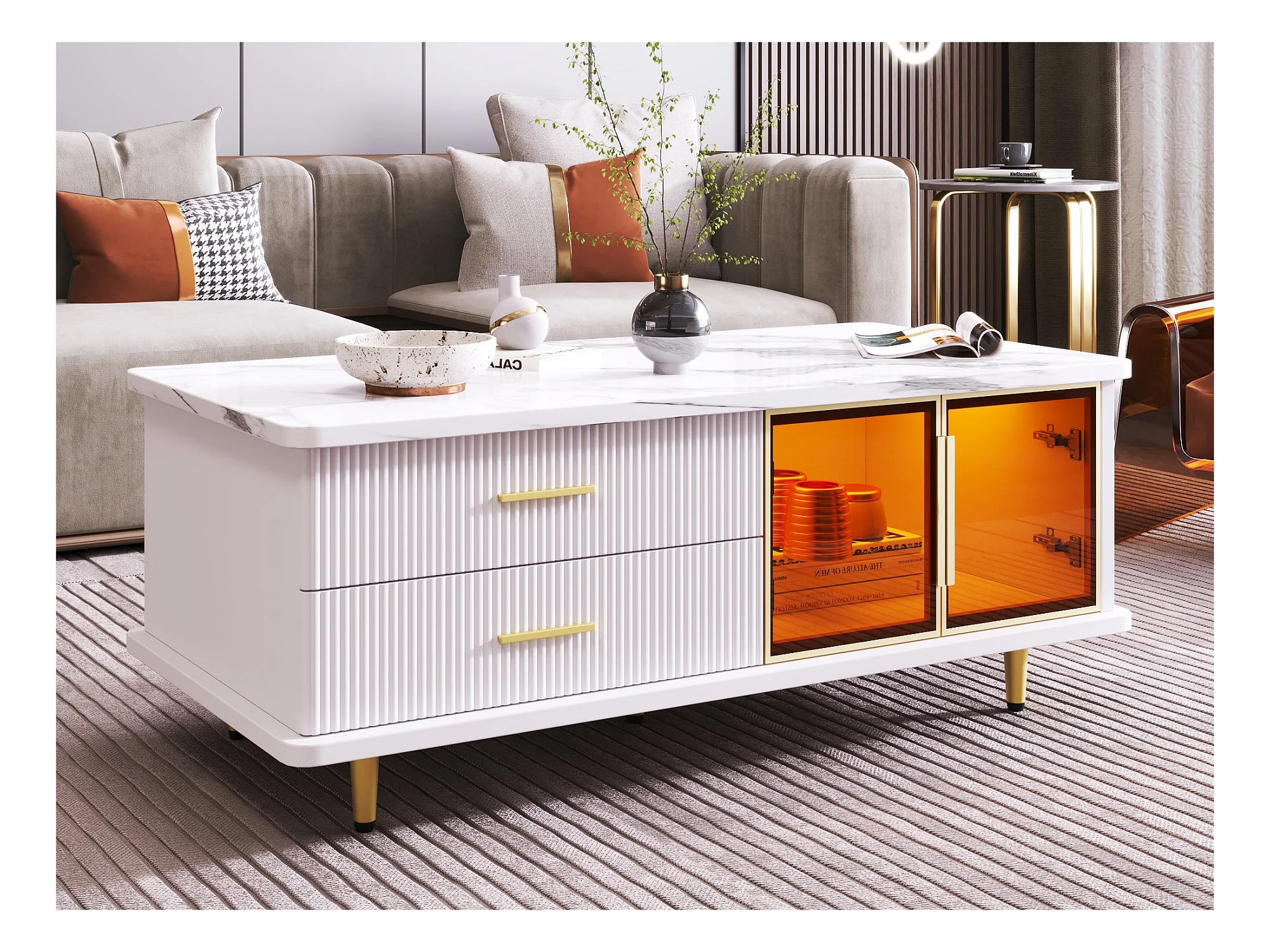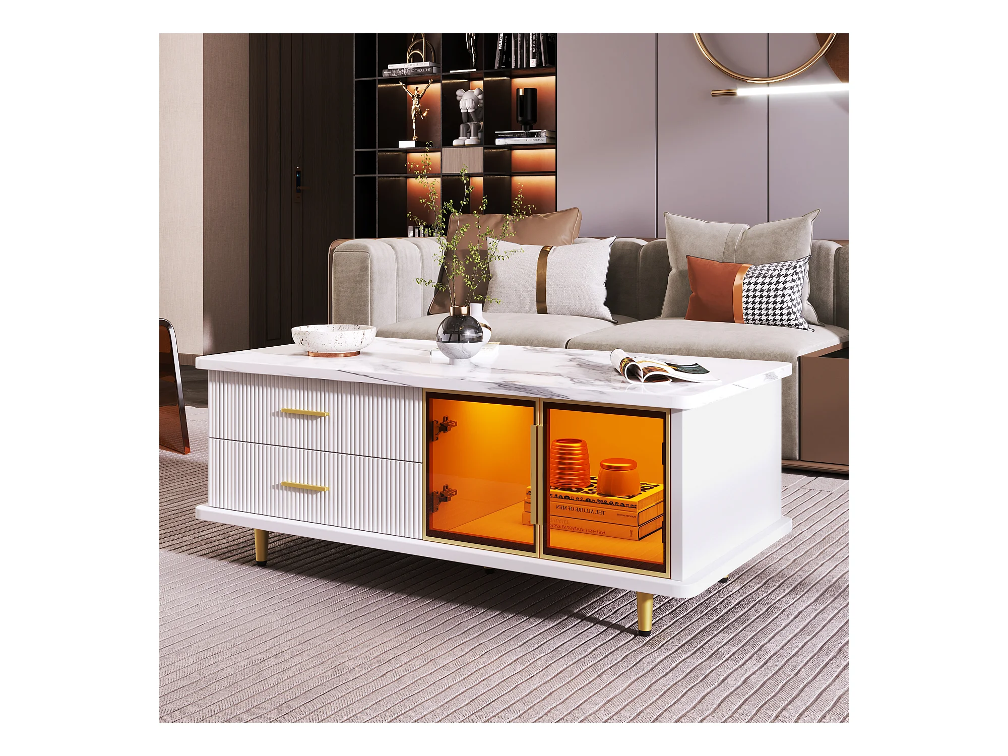 Tavolino scandinavo - 2 cassetti e 2 ante - LED integrato - impiallacciatura con motivo marmo - Bianco