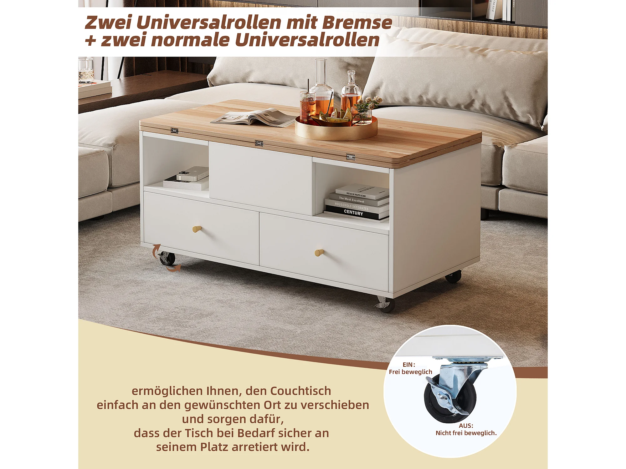Tavolino trasformabile regolabile in altezza, 4 cassetti e piano allungabile, MDF, legno naturale e bianco (100x50x47,5cm)