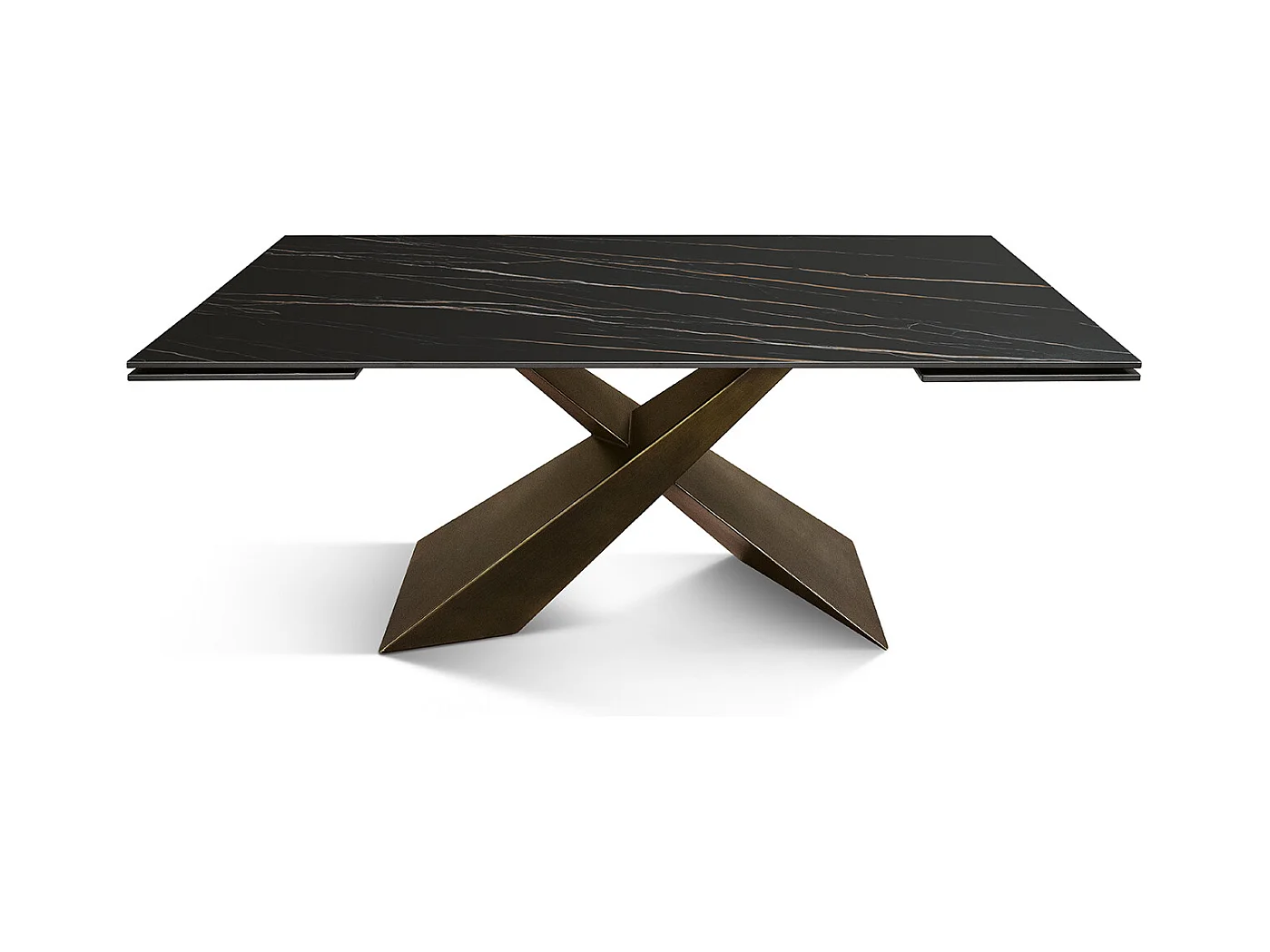 Tavolo allungabile Romeo,Piano in ceramica matt golden nero, gambe in metallo bronzo a X, 180x90 cm