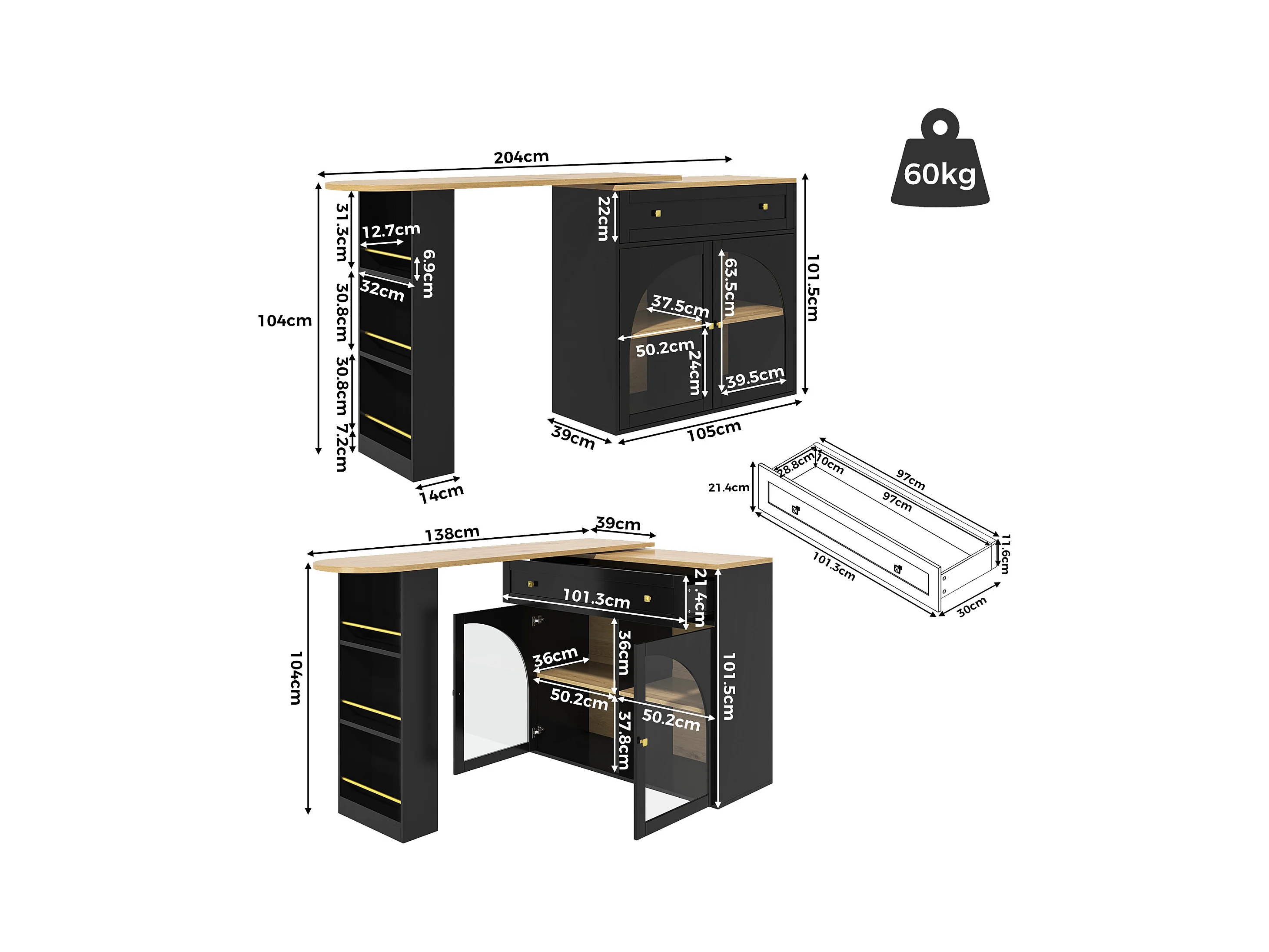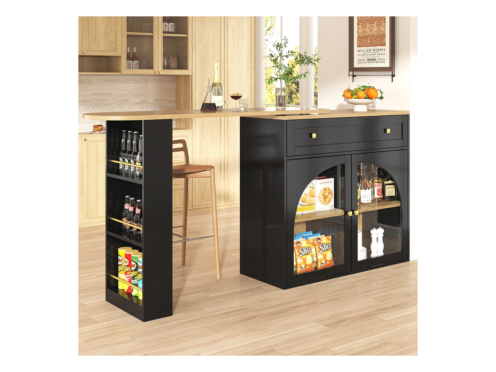 Tavolo bar allungabile MDF 138-204cm pivotante 360° con rangement verre noir kitchen salon