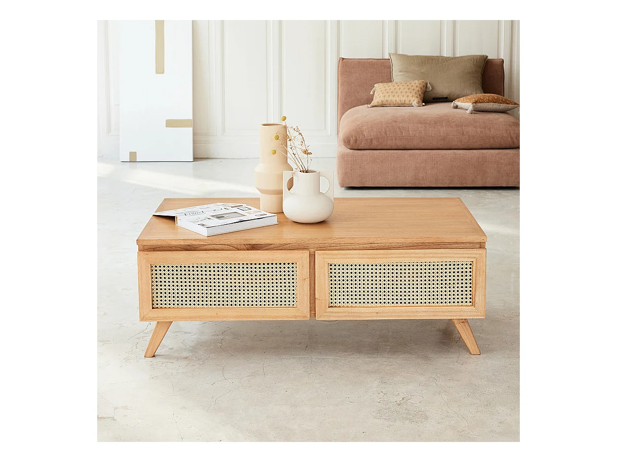 Tavolo basso in mindi massello e vimini 4 cassetti 110 cm