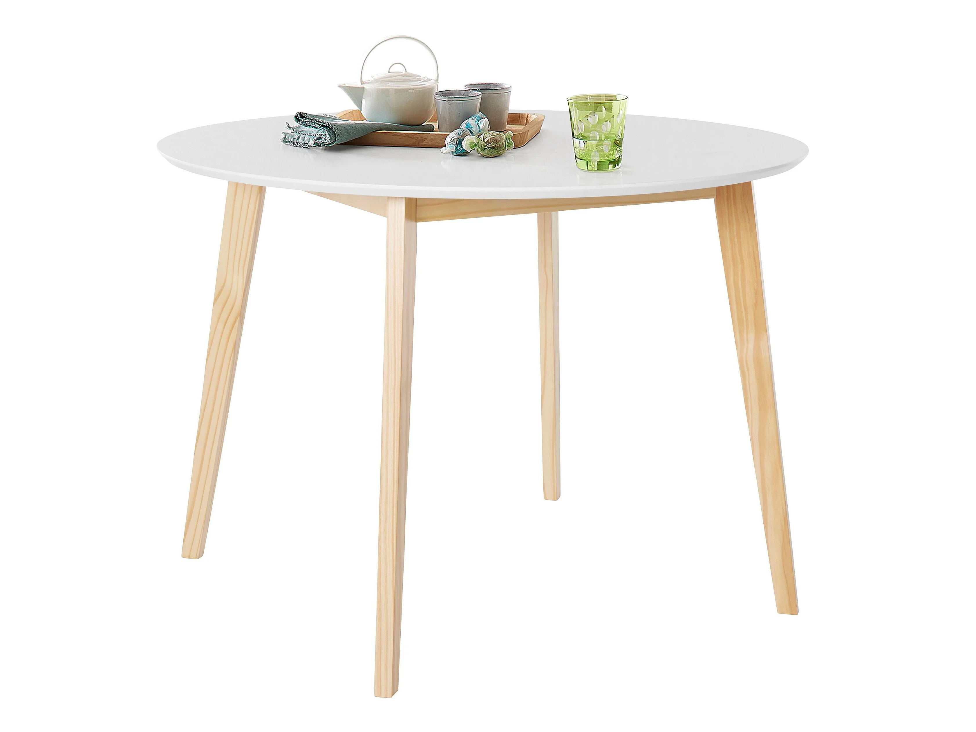 Tavolo da pranzo rotondo in legno di abete e base in poliresina bianca