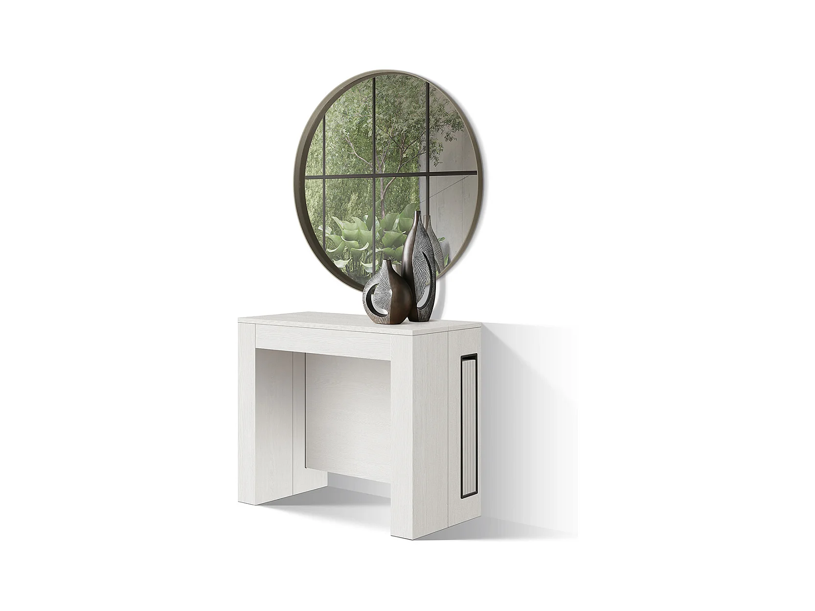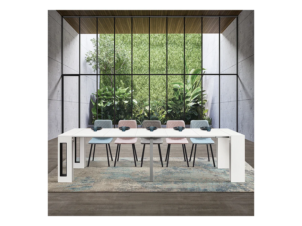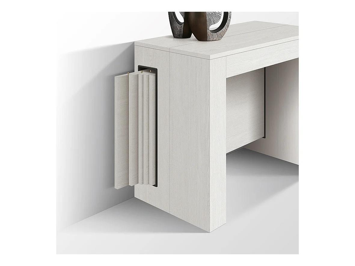 Tavolo Consolle Allungabile con porta prolunghe Paola, Bianco Frassinato, Made in Italy, da 45 a 300 cm