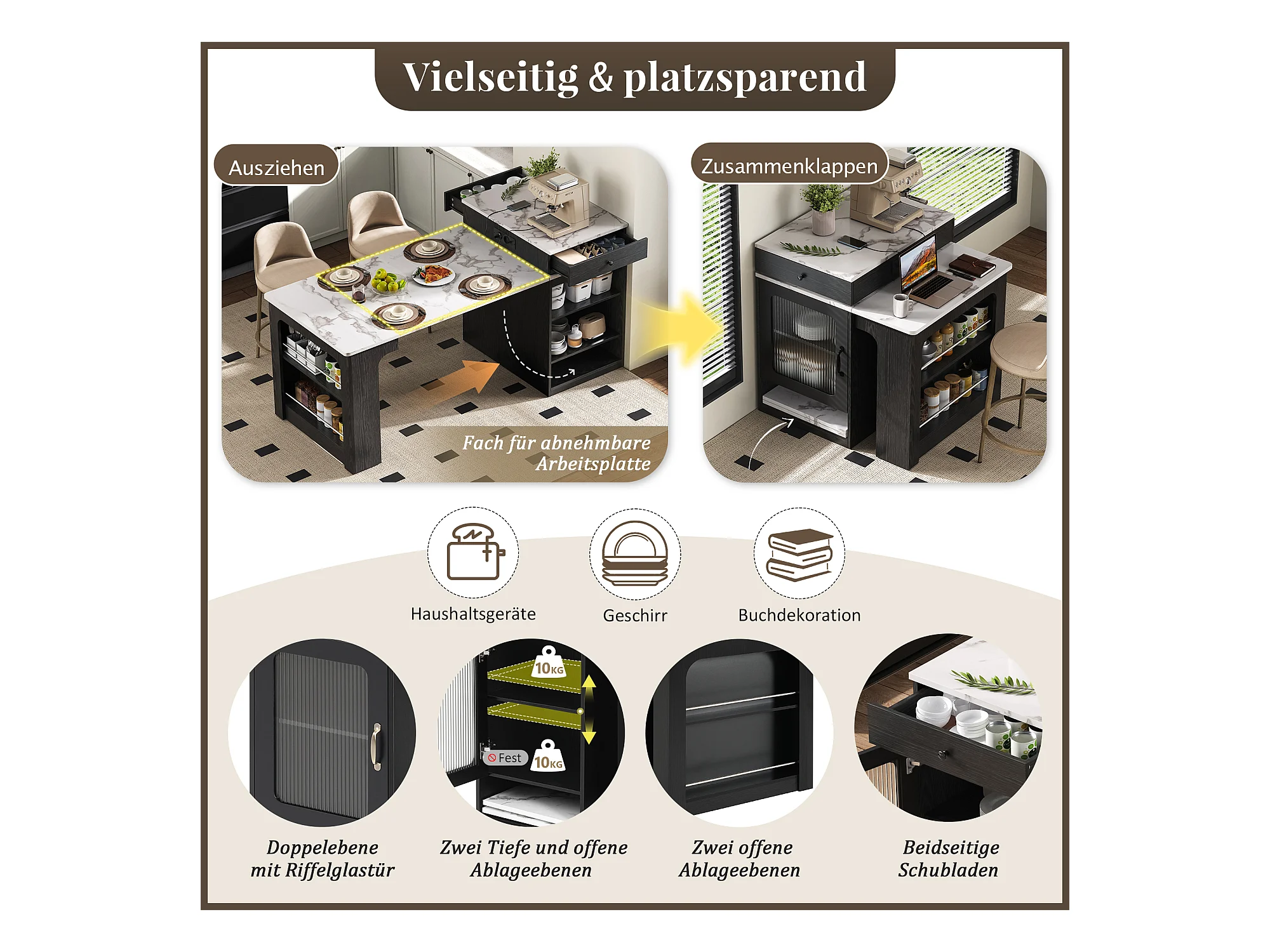 Mobile bar estensibile - 138-204 x 39 x 104 cm - Tavolo da pranzo girevole a 360° - con 2 ante + 2 cassetti - MDF - nero