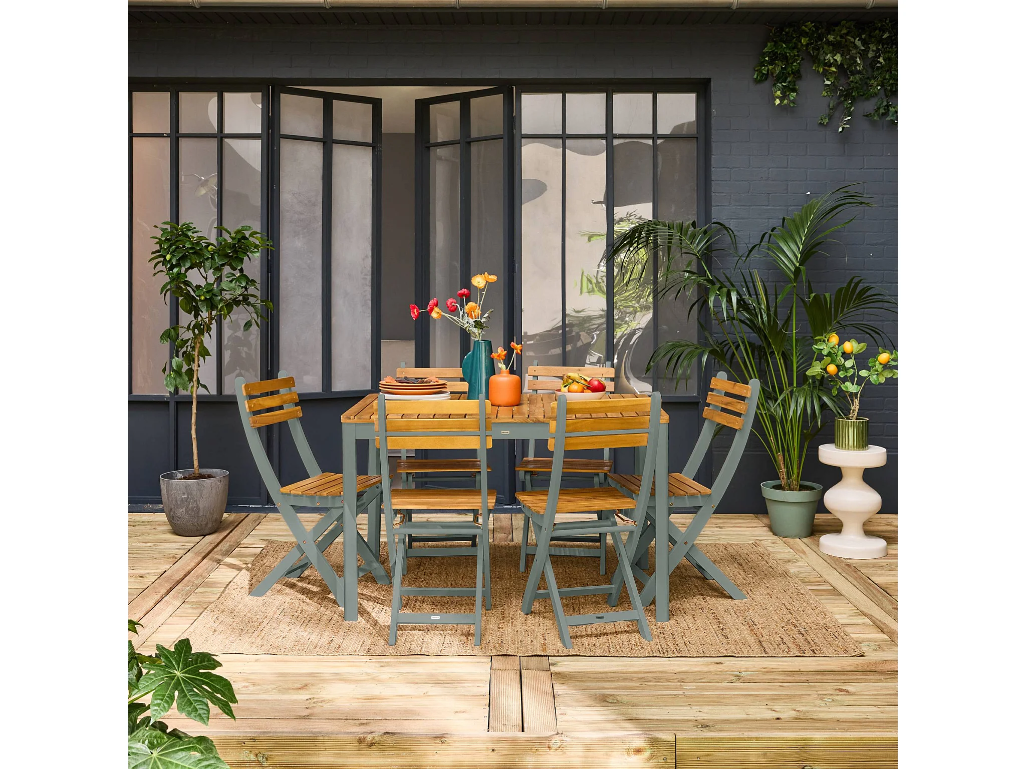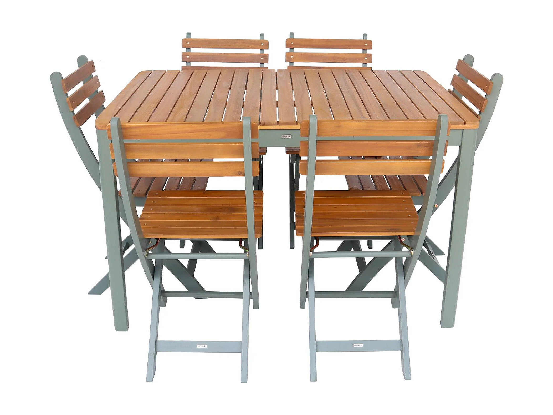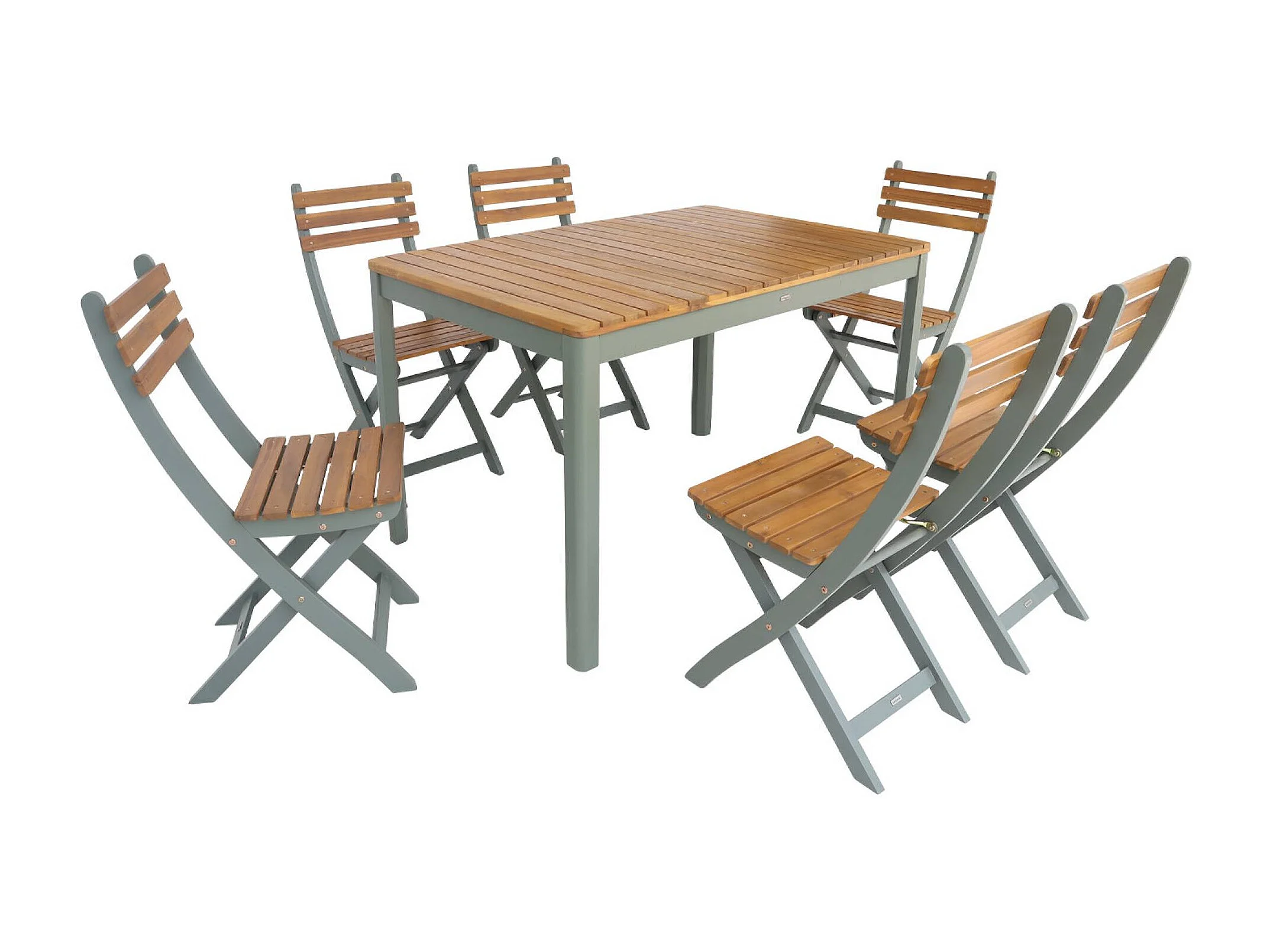 Tavolo da giardino in acacia con angoli arrotondati, 6 sedie, verde