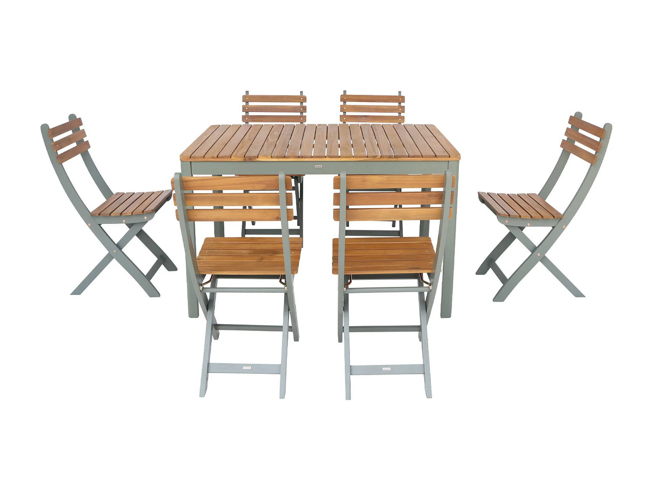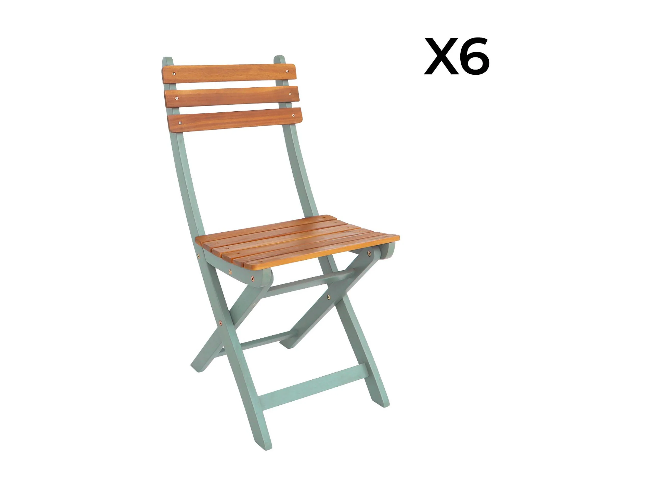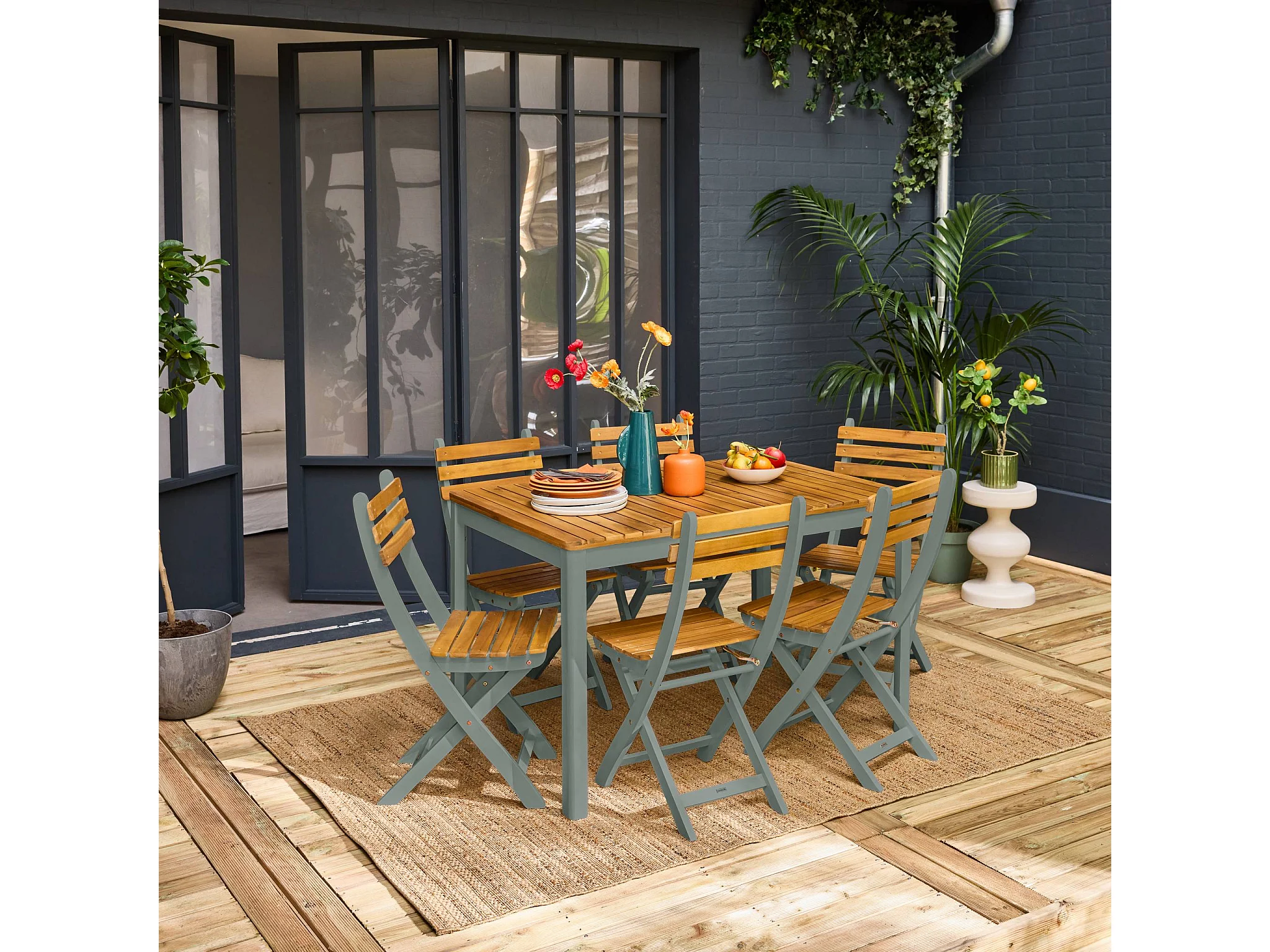 Tavolo da giardino in acacia con angoli arrotondati, 6 sedie, verde