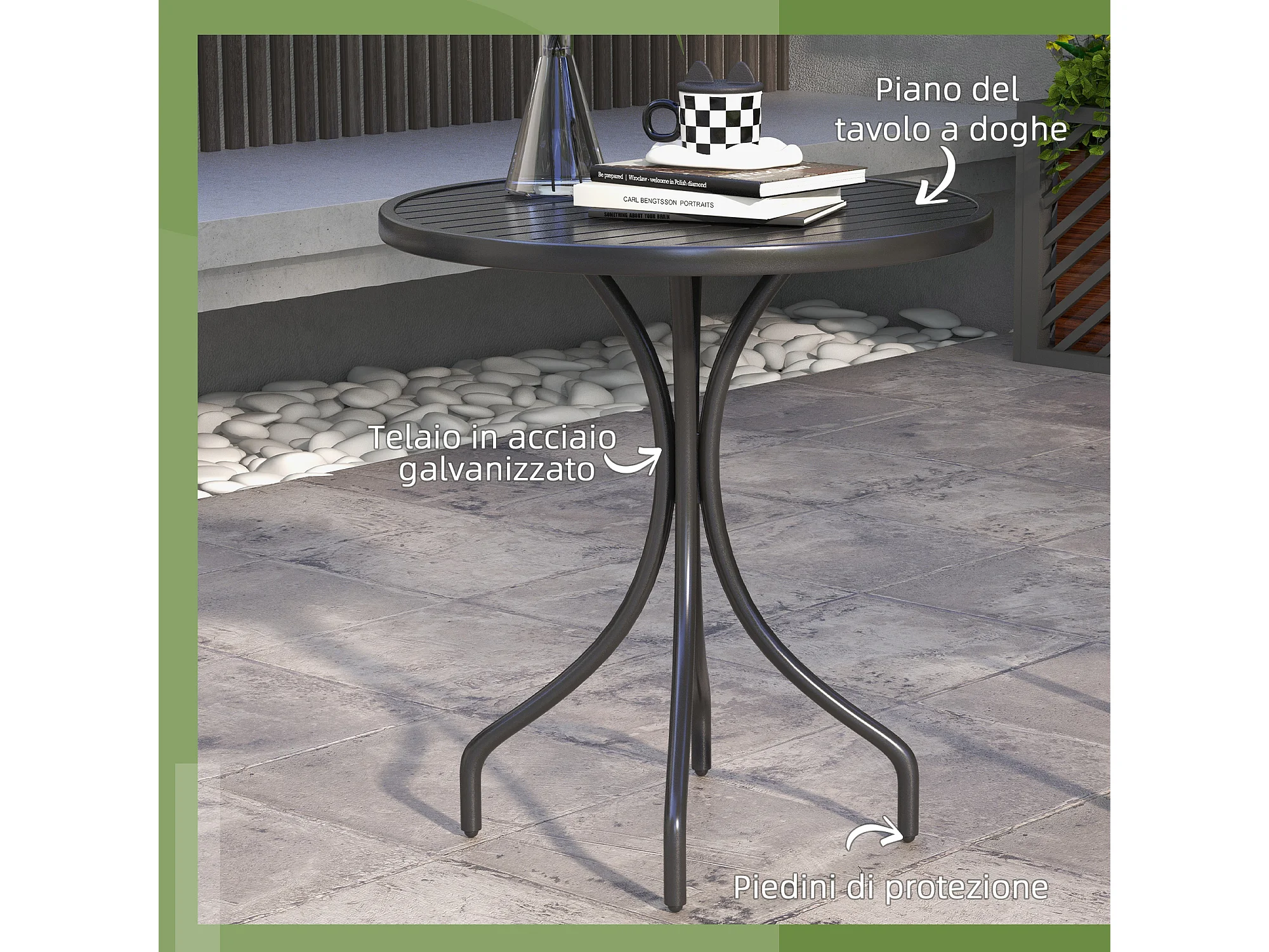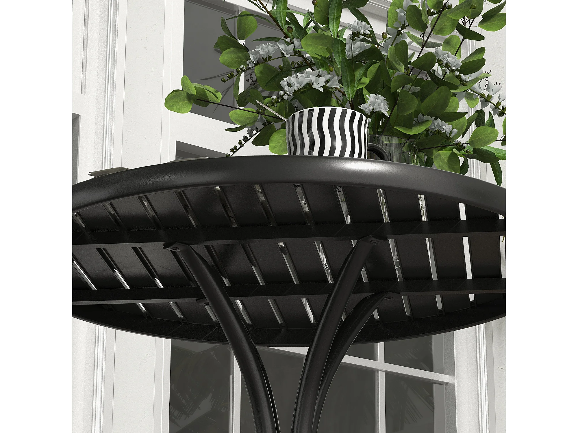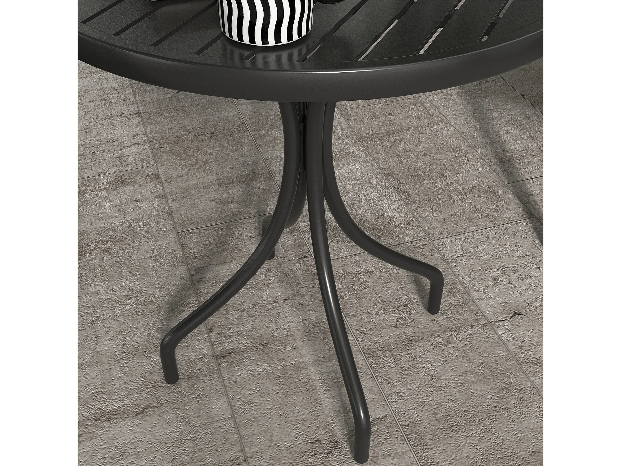 Tavolo da giardino rotondo con piano a doghe in acciaio nero