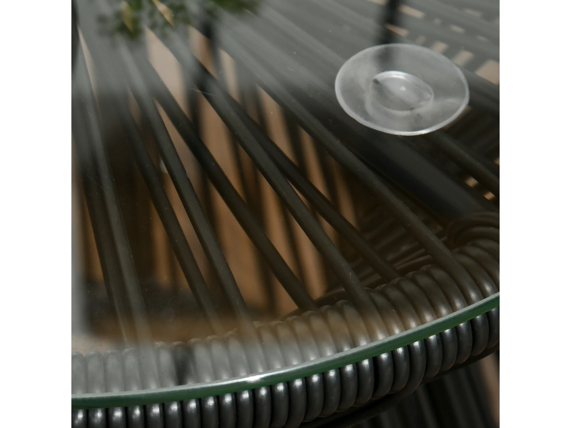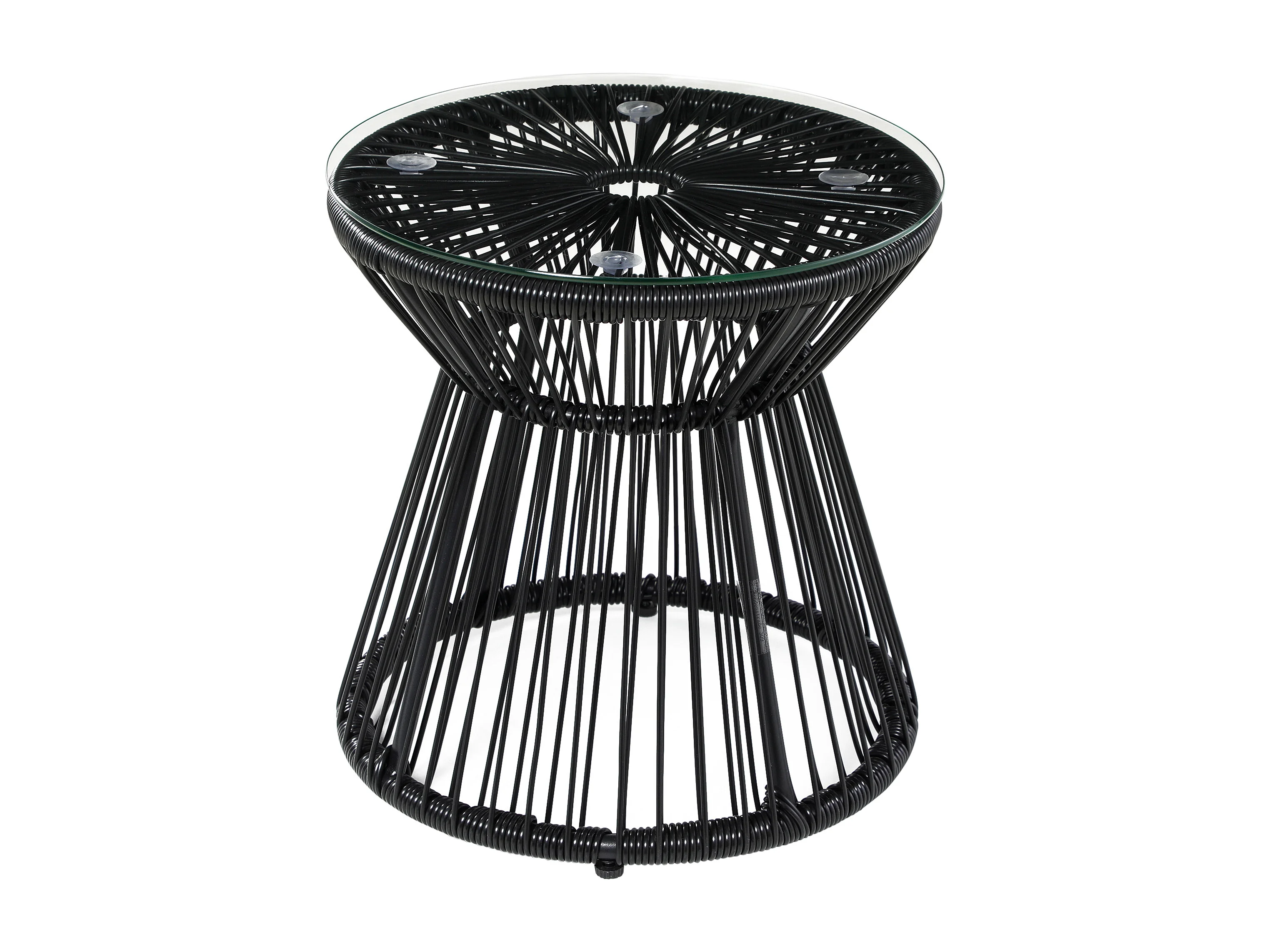 Tavolo da giardino rotondo con piano in vetro, design a tamburo, metallo e rattan sintetico, nero, stile boho (40x40x42cm)
