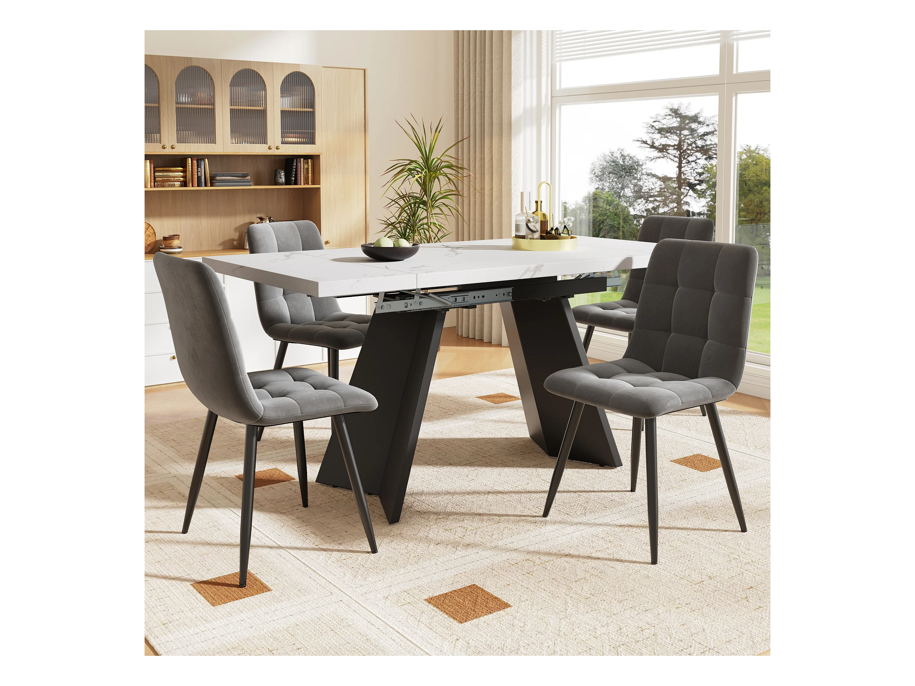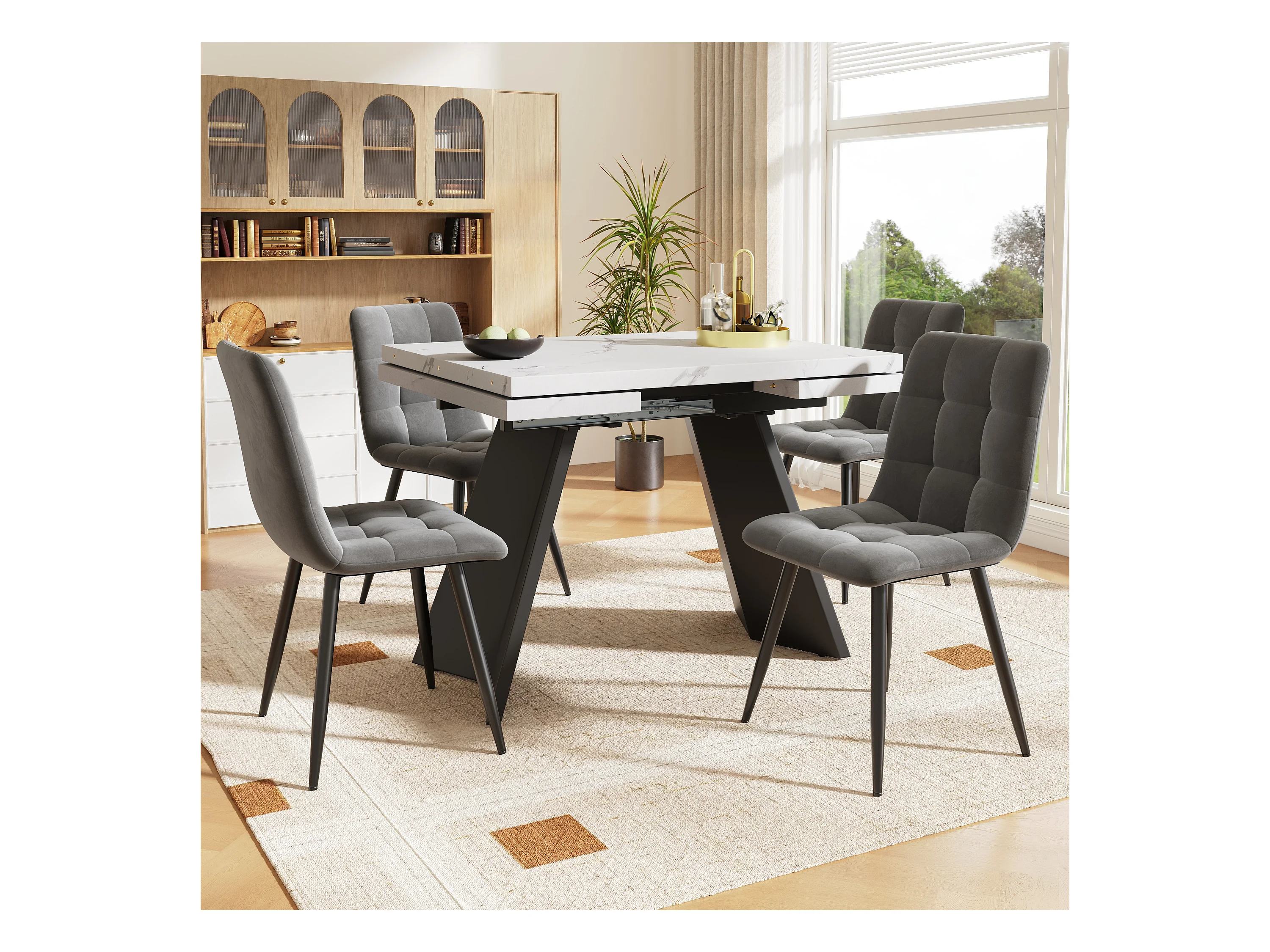 Tavolo da pranzo allungabile per 4 persone, 160x80 cm, tavolo in MDF bianco, gambe in metallo, sedie in velluto grigio (160-179,5x80x75 cm)
