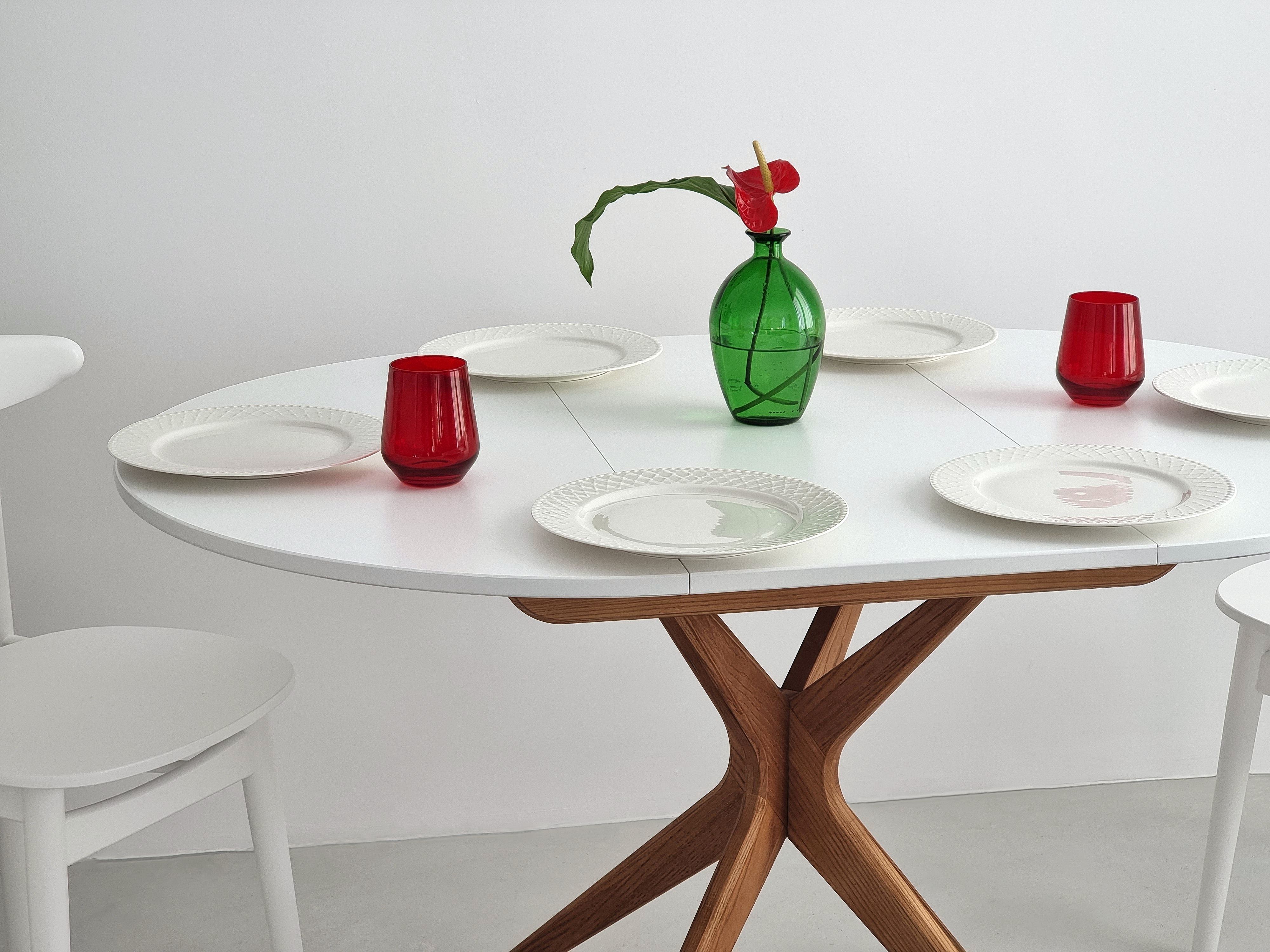 Tavolo da pranzo rotondo allungabile 90cm Jubi Bianco | Gamba in frassino tinto rovere