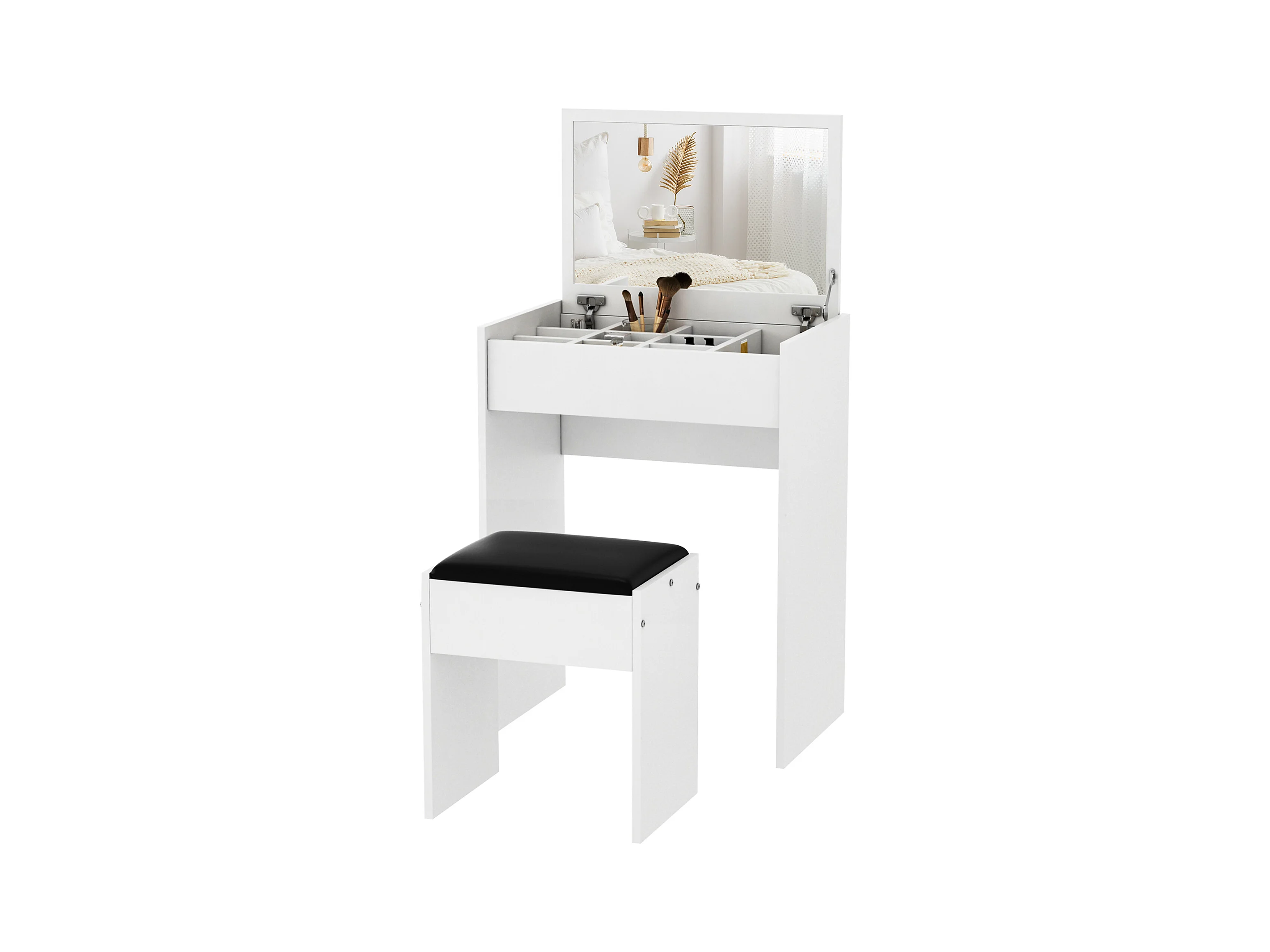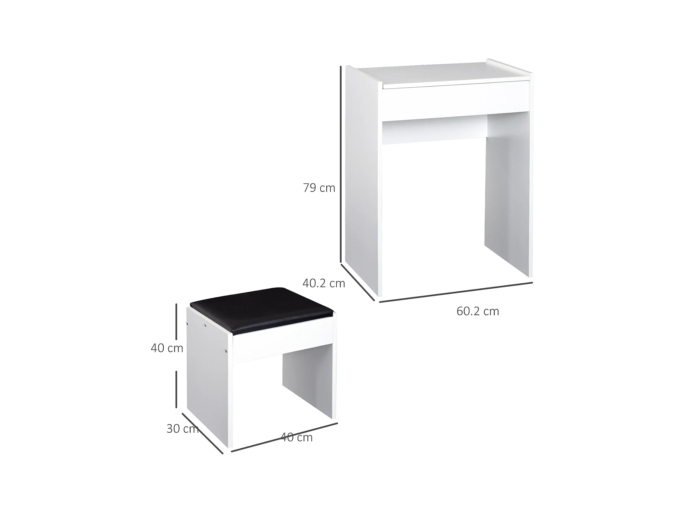 Mobile da trucco con specchio a scomparsa sgabello e cassetto bianco