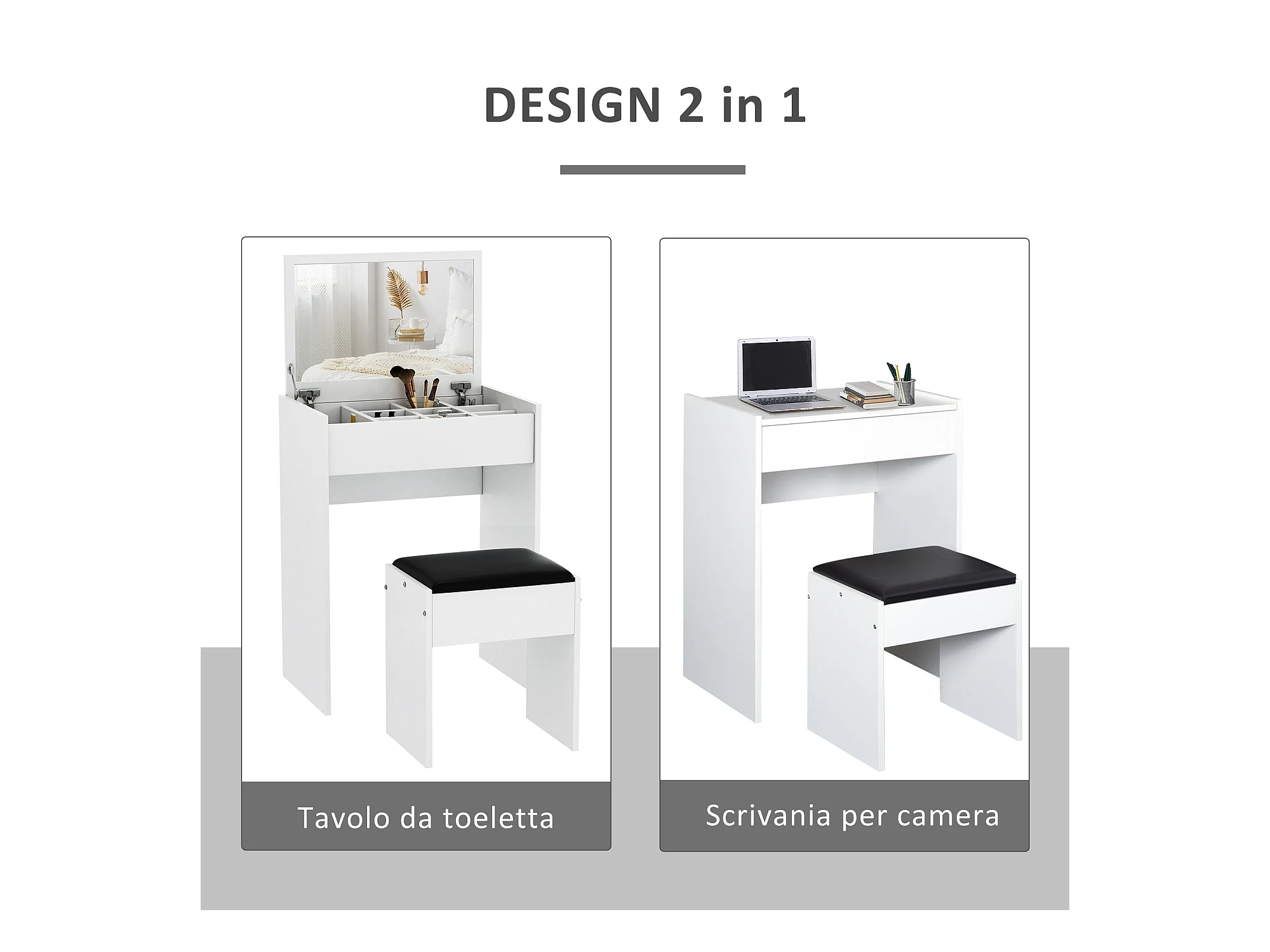 Tavolo da trucco con sgabello e specchio richiudibile in mdf bianco