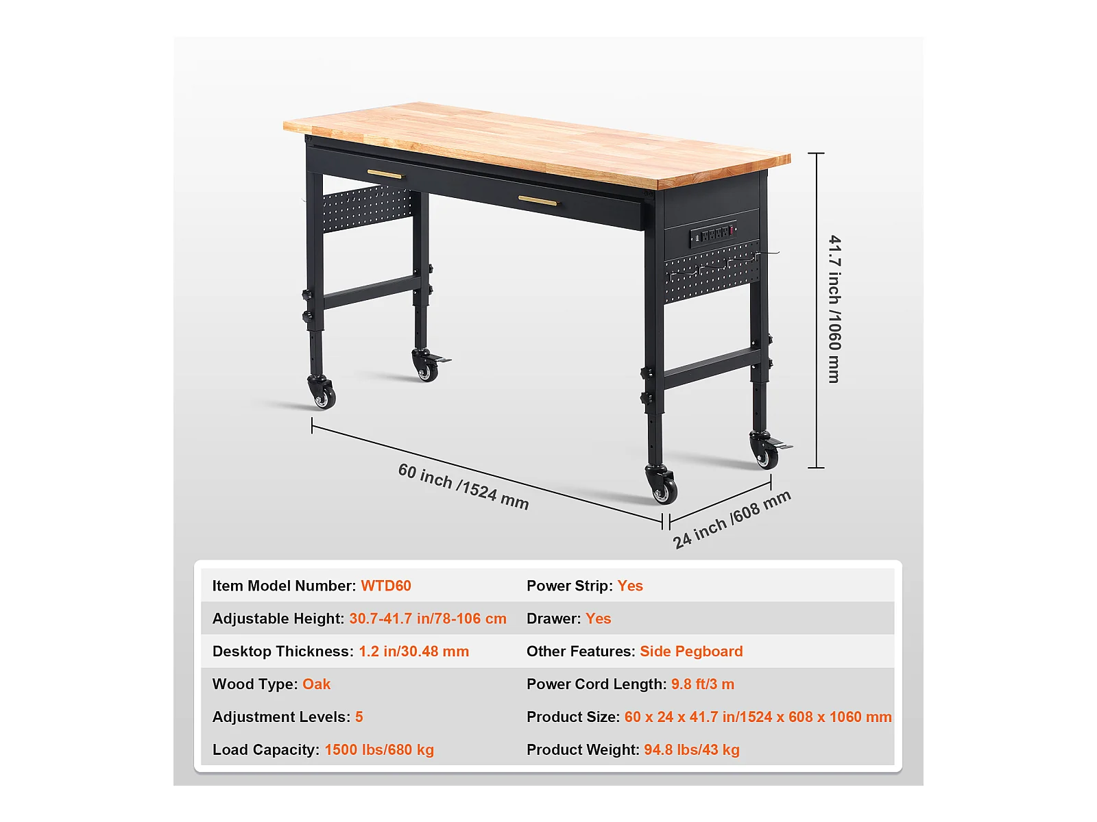 Banco da Lavoro per Officina e Garage SucceBuy, 152,4 cm, Tavolo da Lavoro su Ruote Regolabile in Altezza, Portata 907,2 kg, in Rovere per Ufficio, Casa