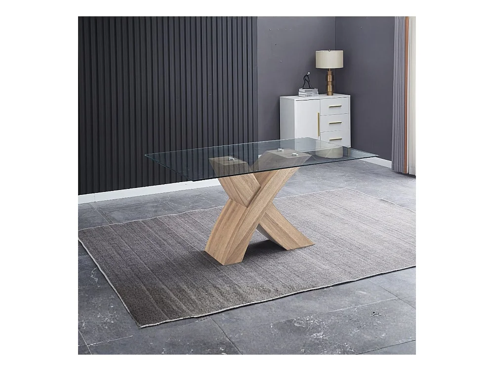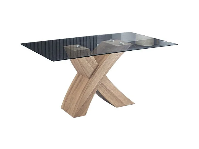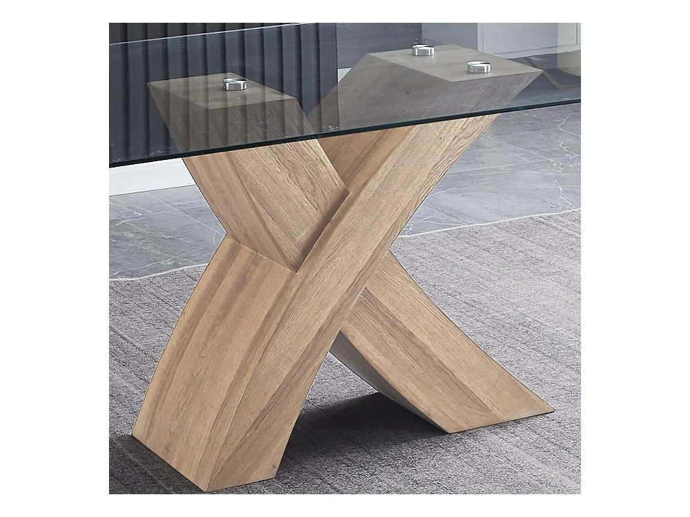 Tavolo fisso Duncan con piano in vetro e gambe incrociate effetto legno 150x90x76H