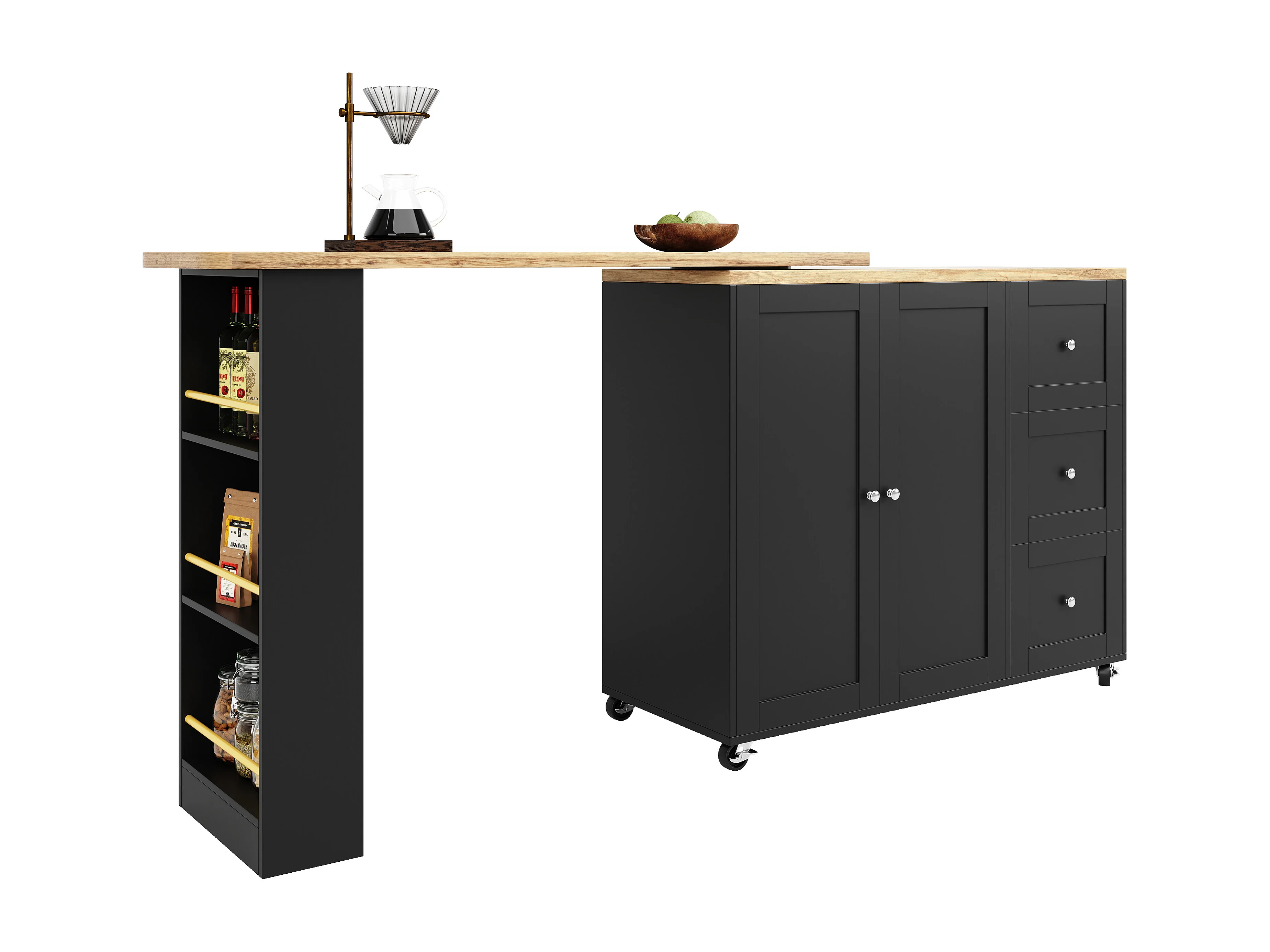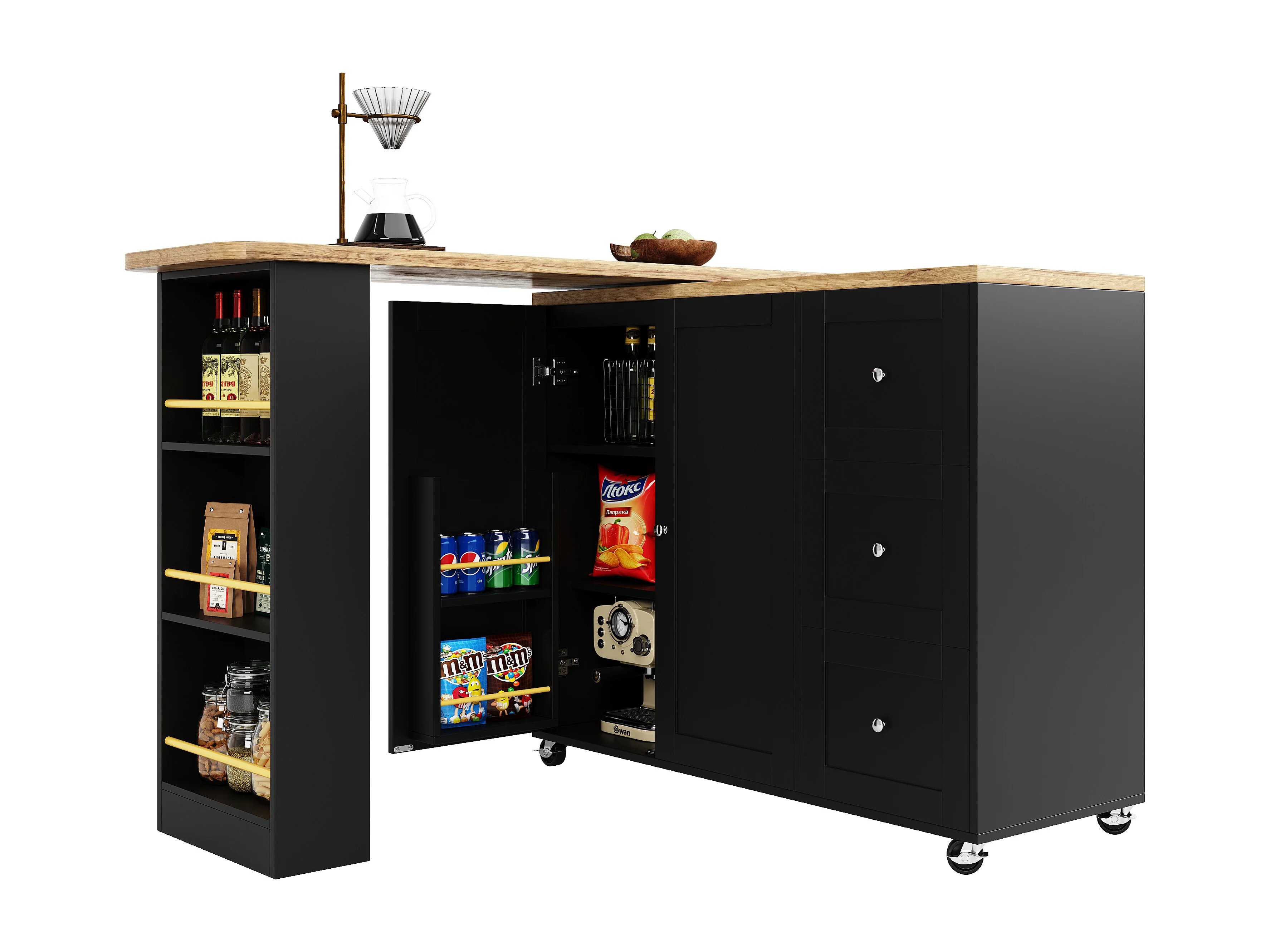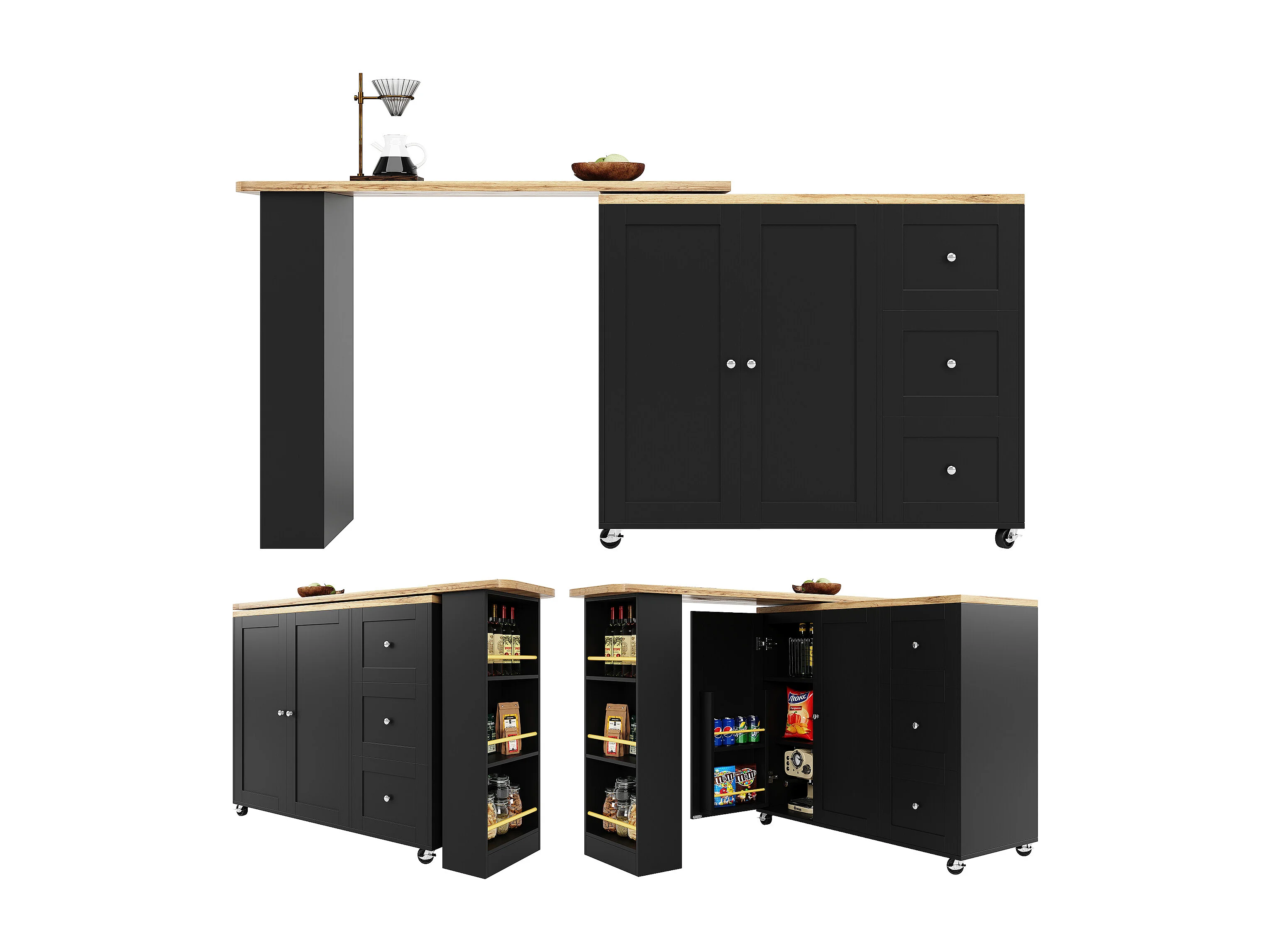 Tavolo girevole mobile da bar 2 ante e 3 cassetti Isola da cucina con piano estensibile (135-203)x39x106 cm - nero