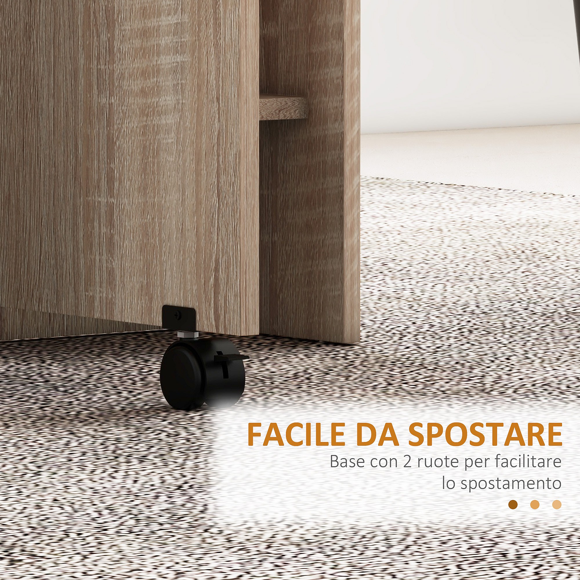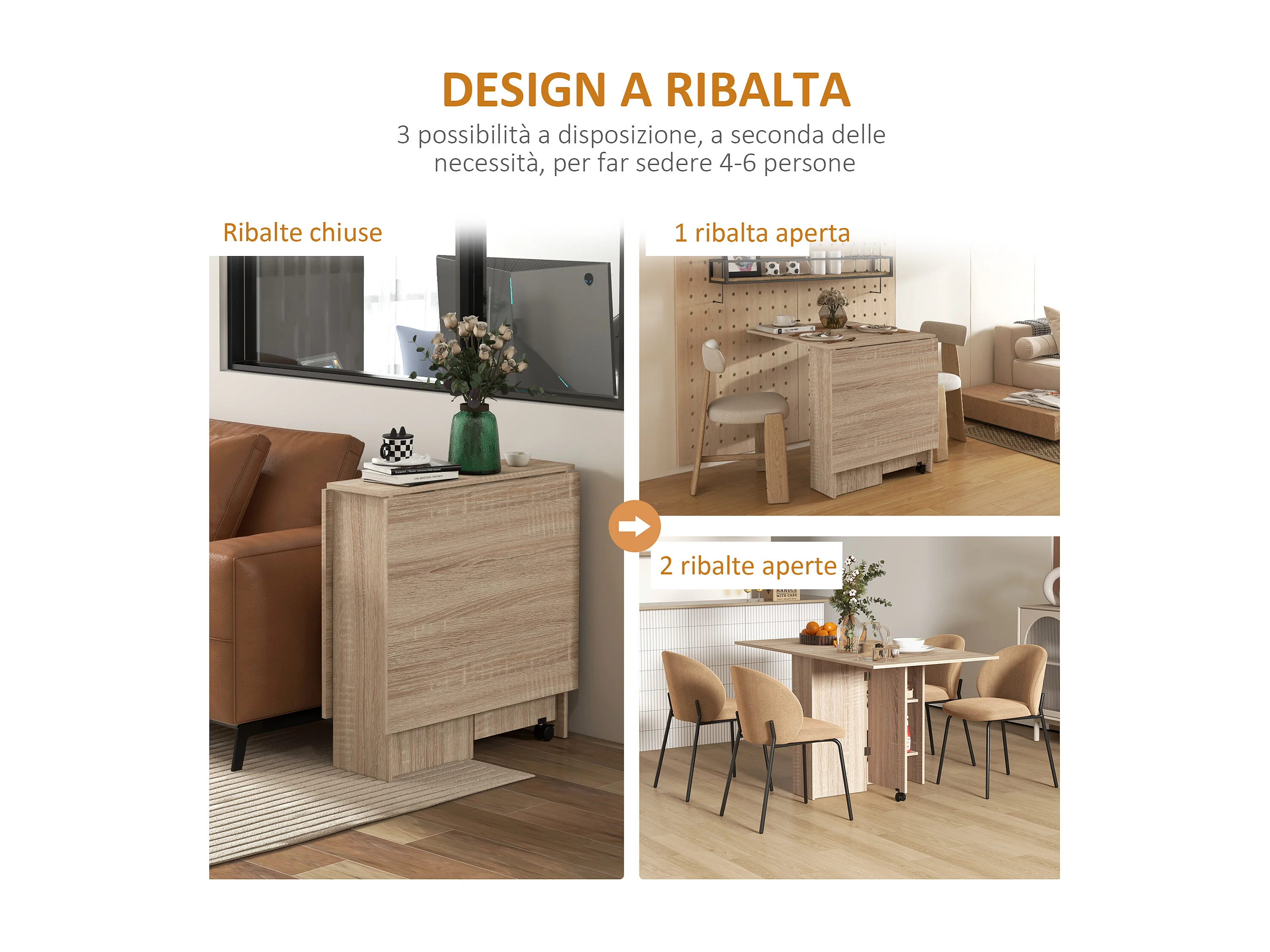 Tavolo pieghevole 6 posti con 2 ribalte ripiani e ruote color legno