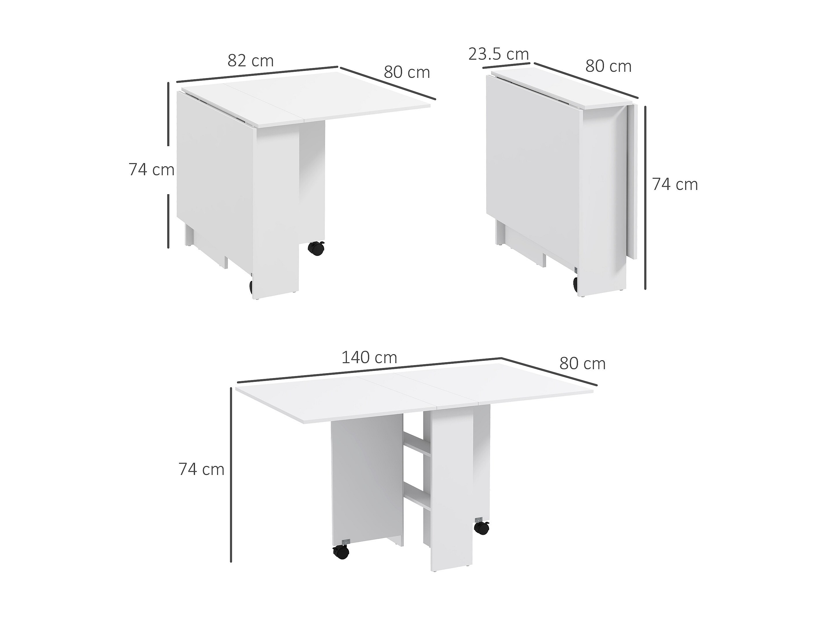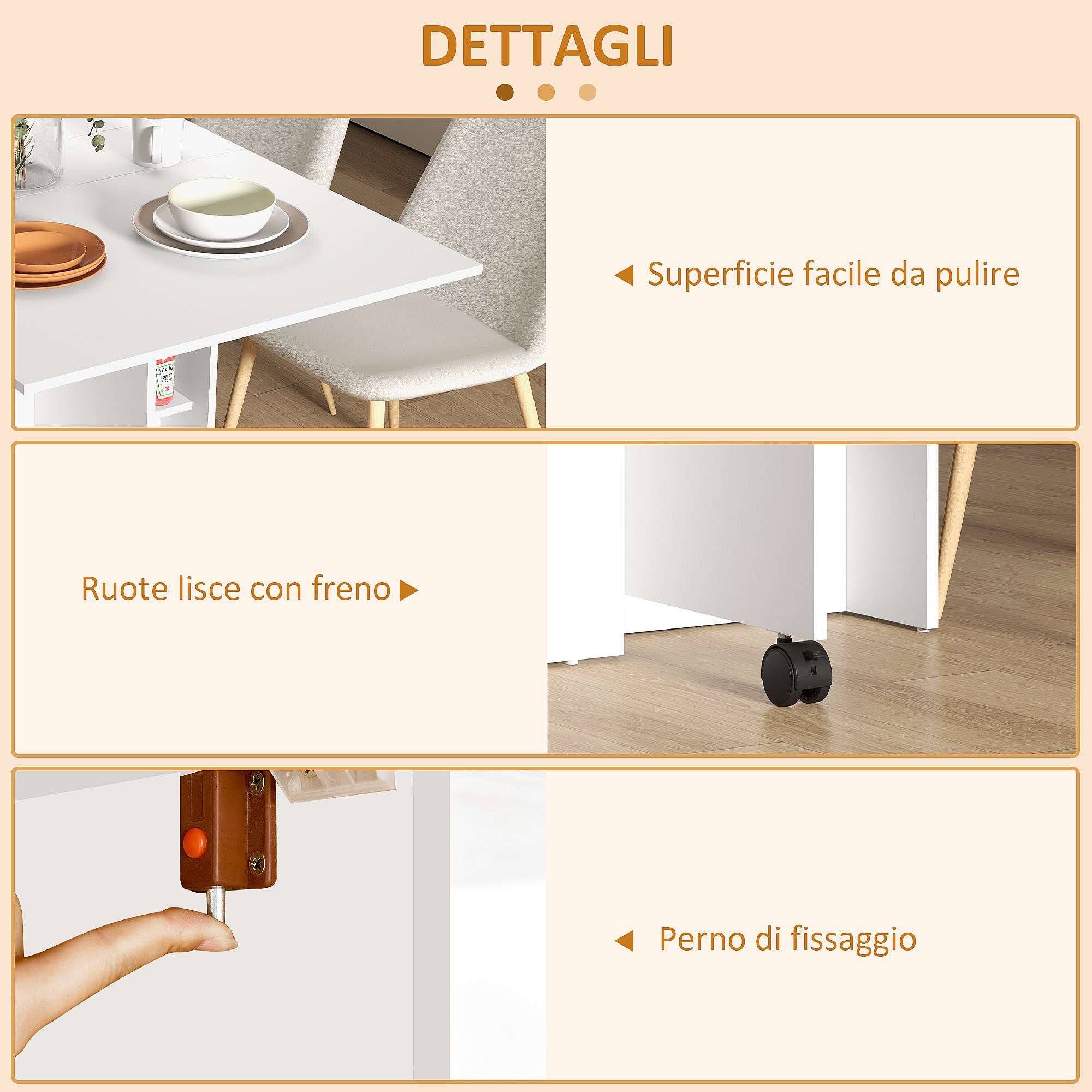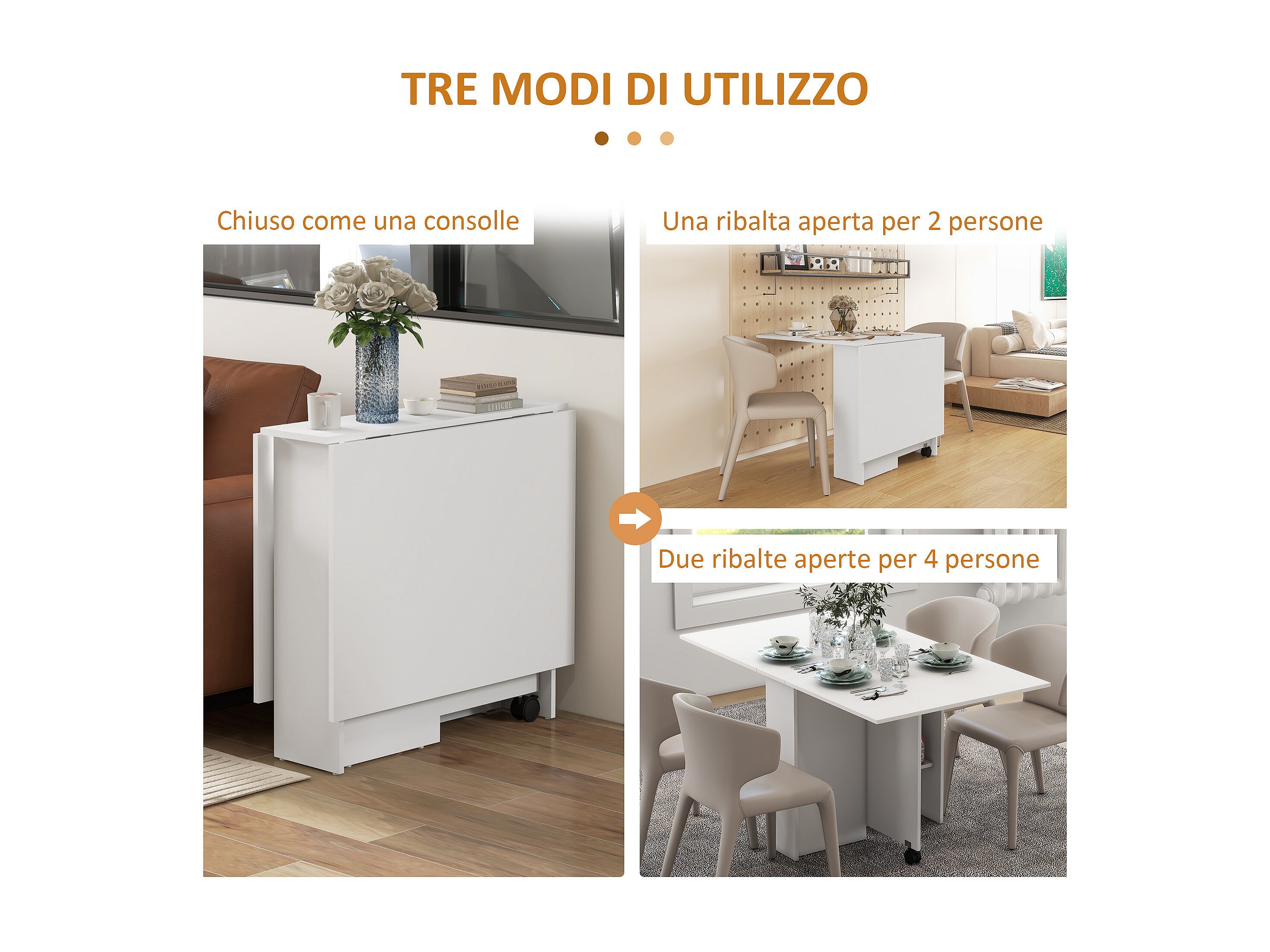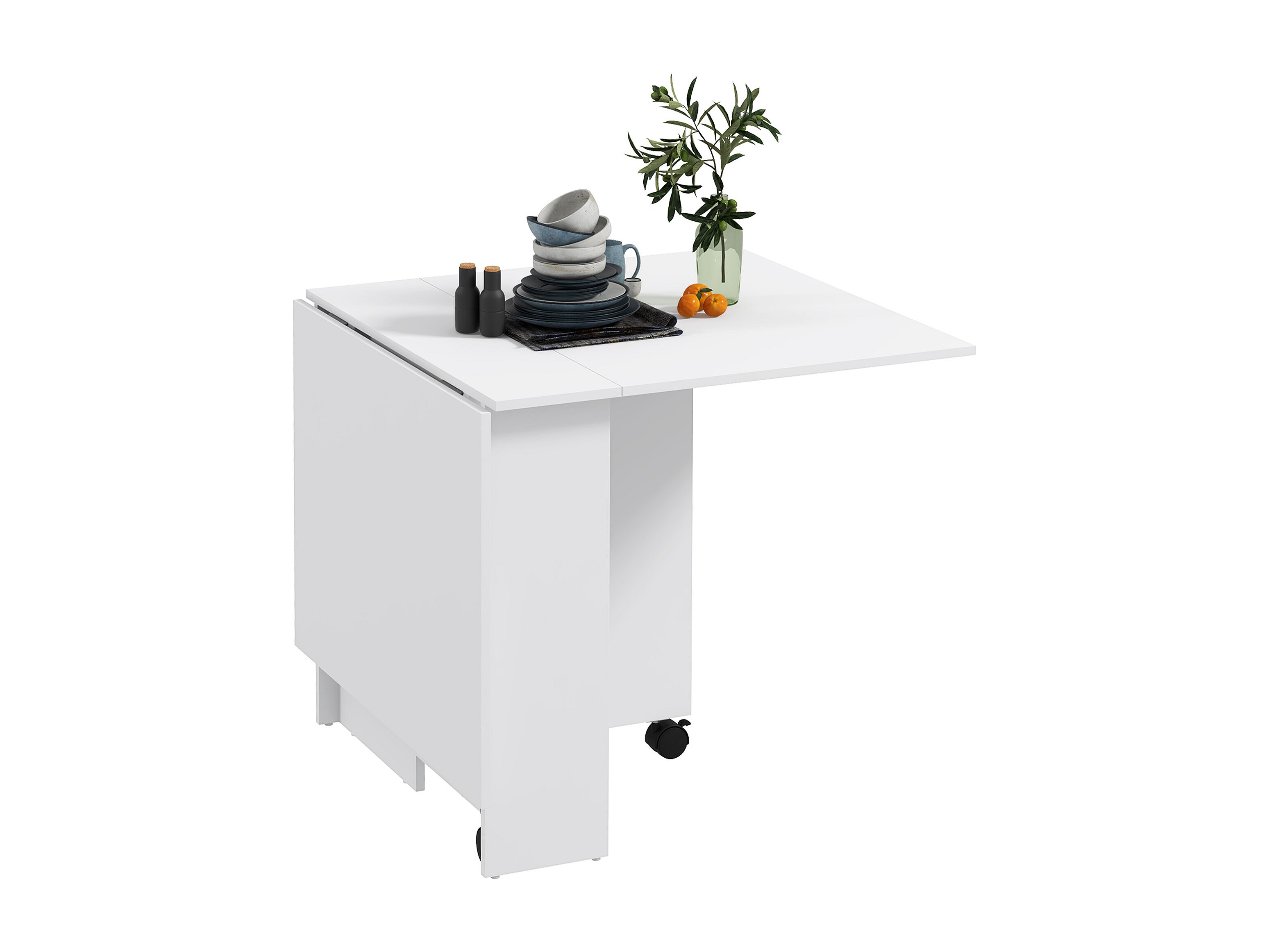 Tavolo pieghevole a 2 ribalte per 6 persone con ripiani e ruote bianco