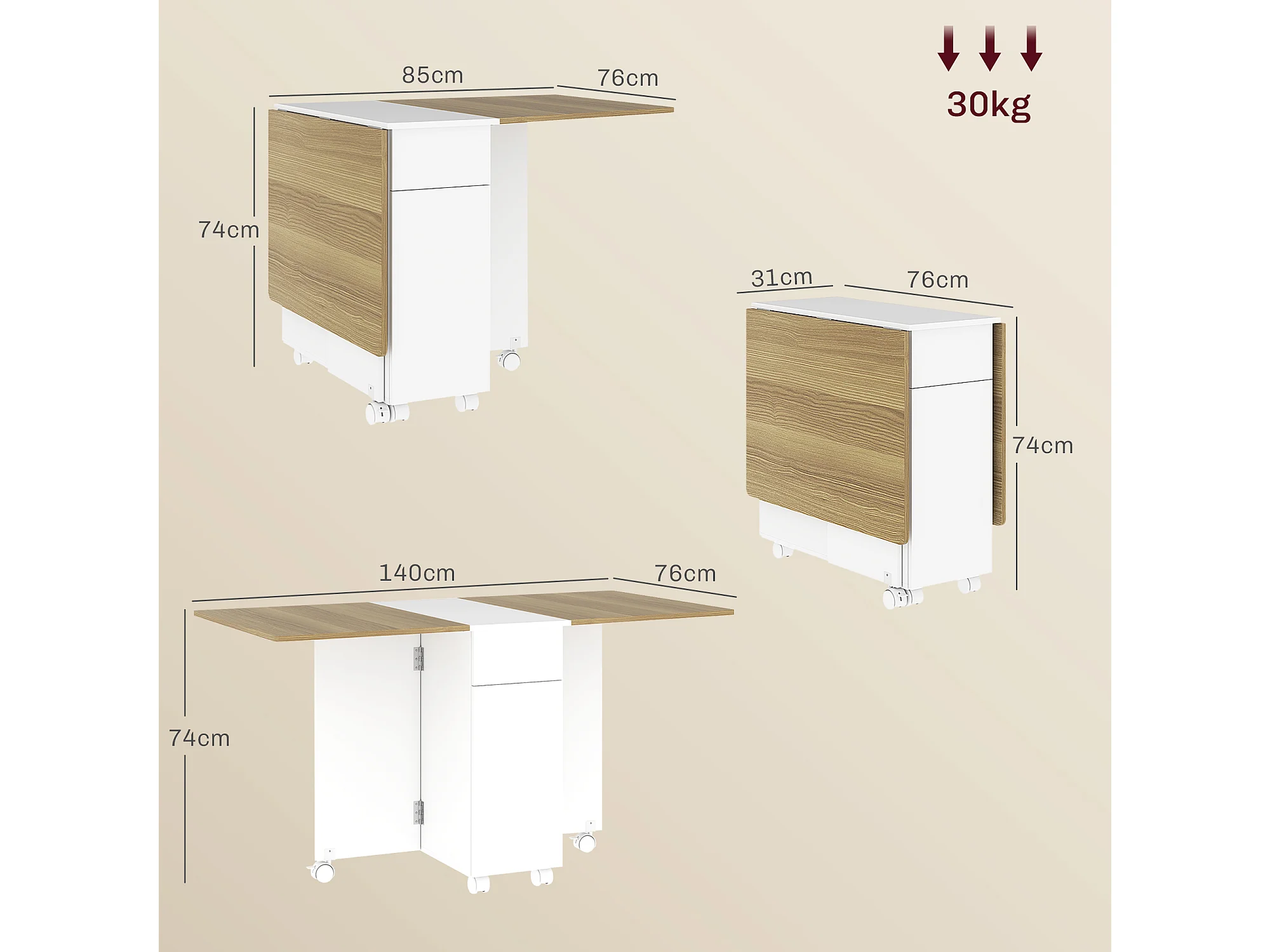 Tavolo pieghevole con 2 cassetti e armadietto bianco e color legno