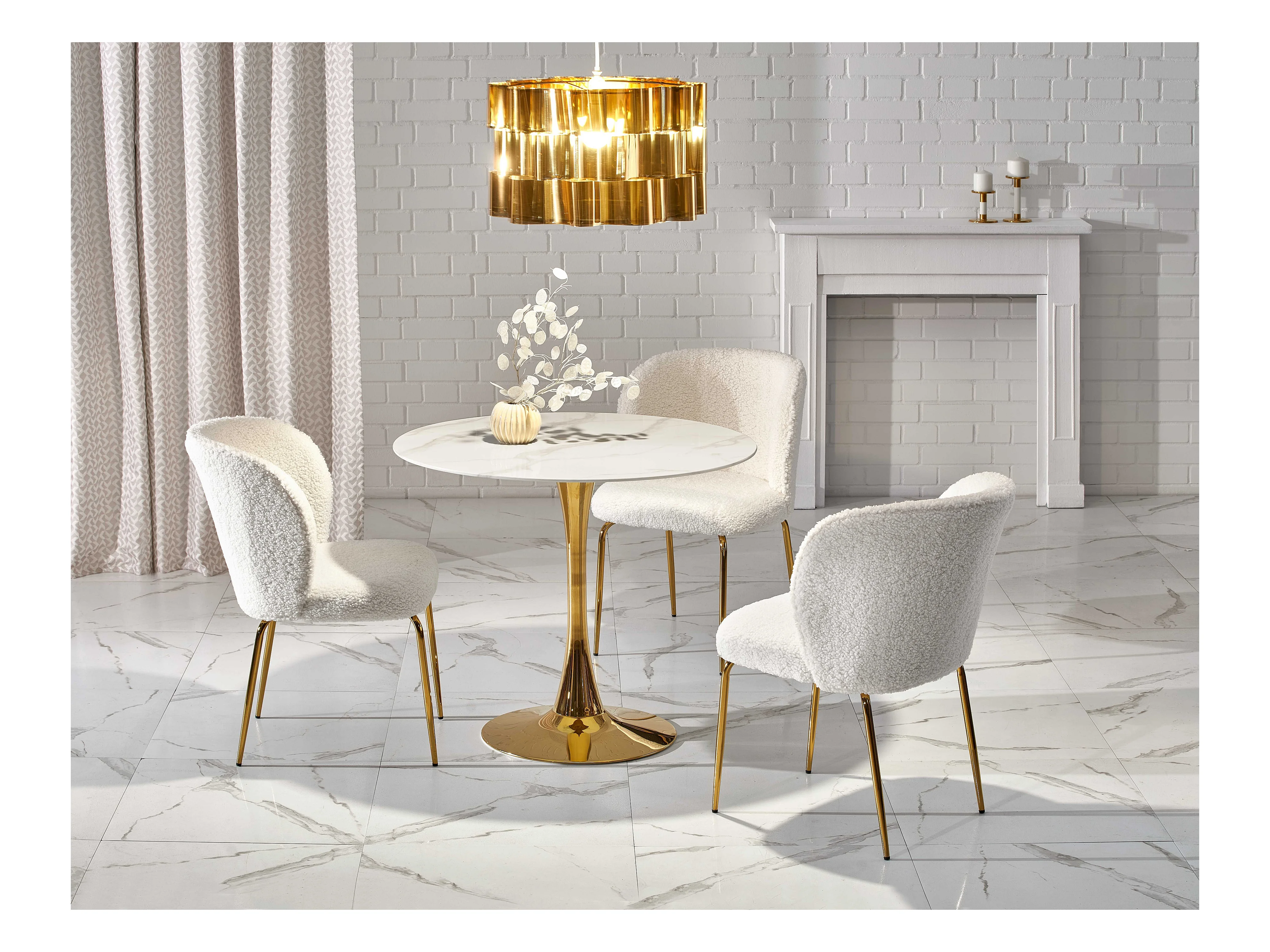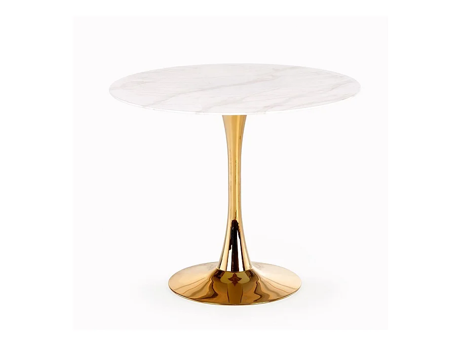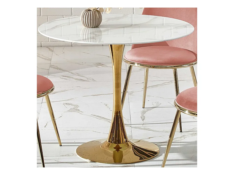 Tavolo rotondo con piano in vetro effetto marmo bianco e gamba centrale in acciaio dorato BOOTIS