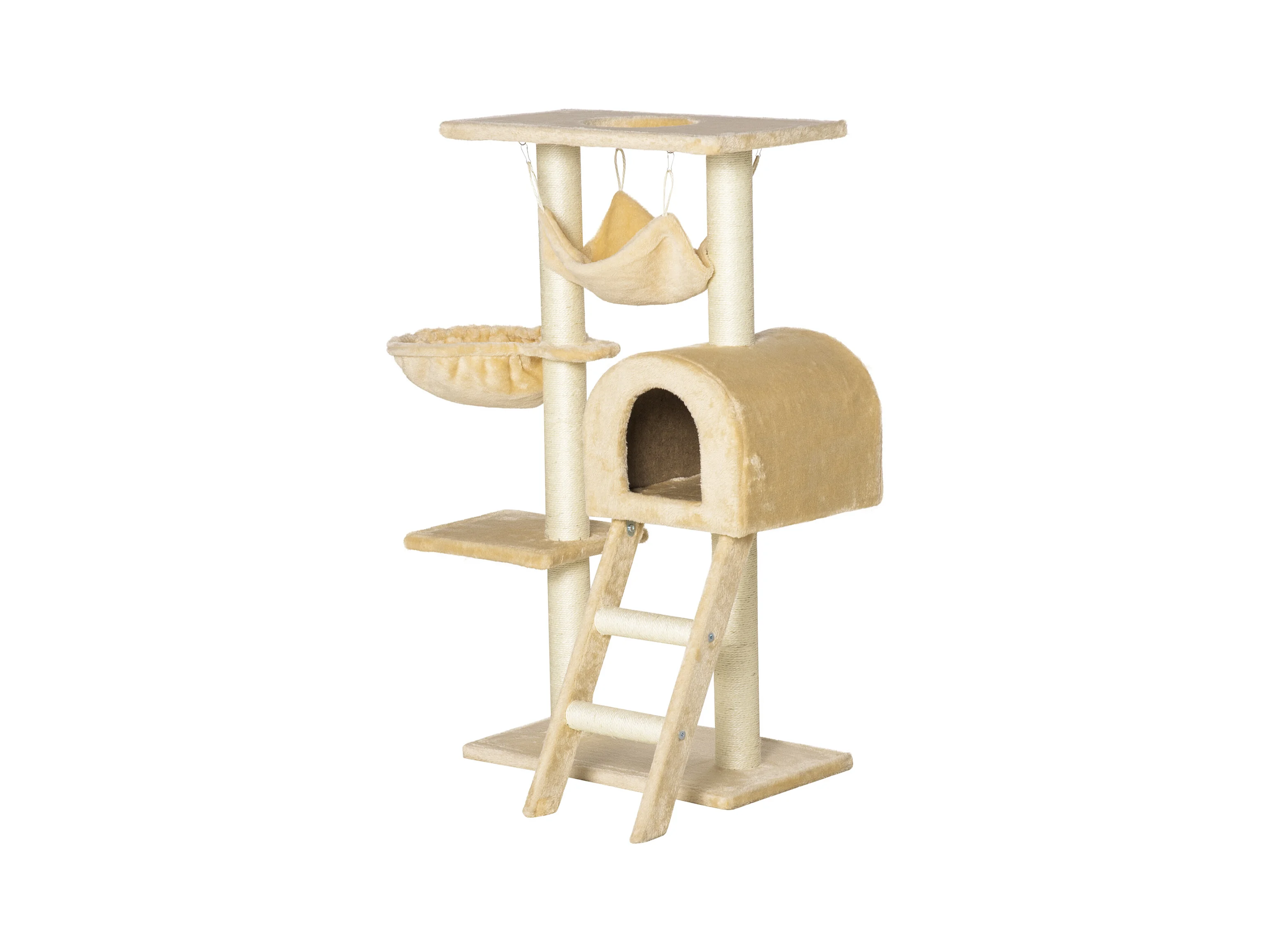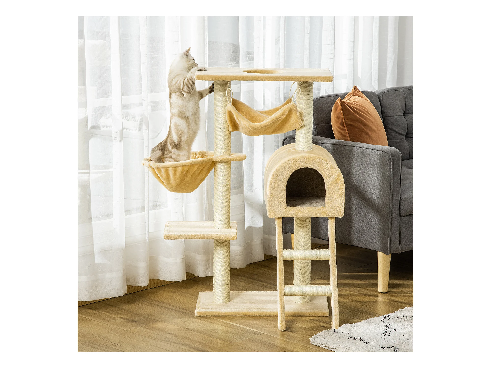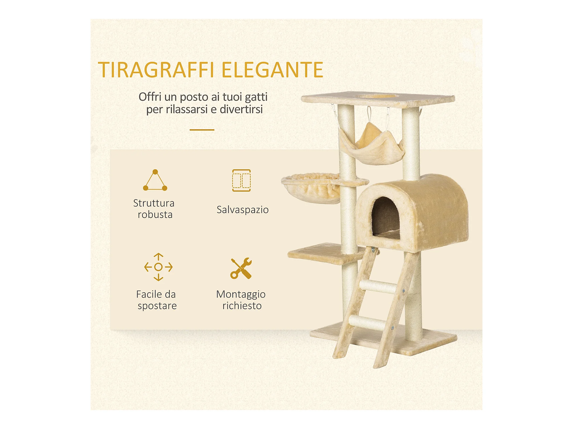 Tiragraffi per gatti con cuccia, pallina e pali in corda sisal, beige
