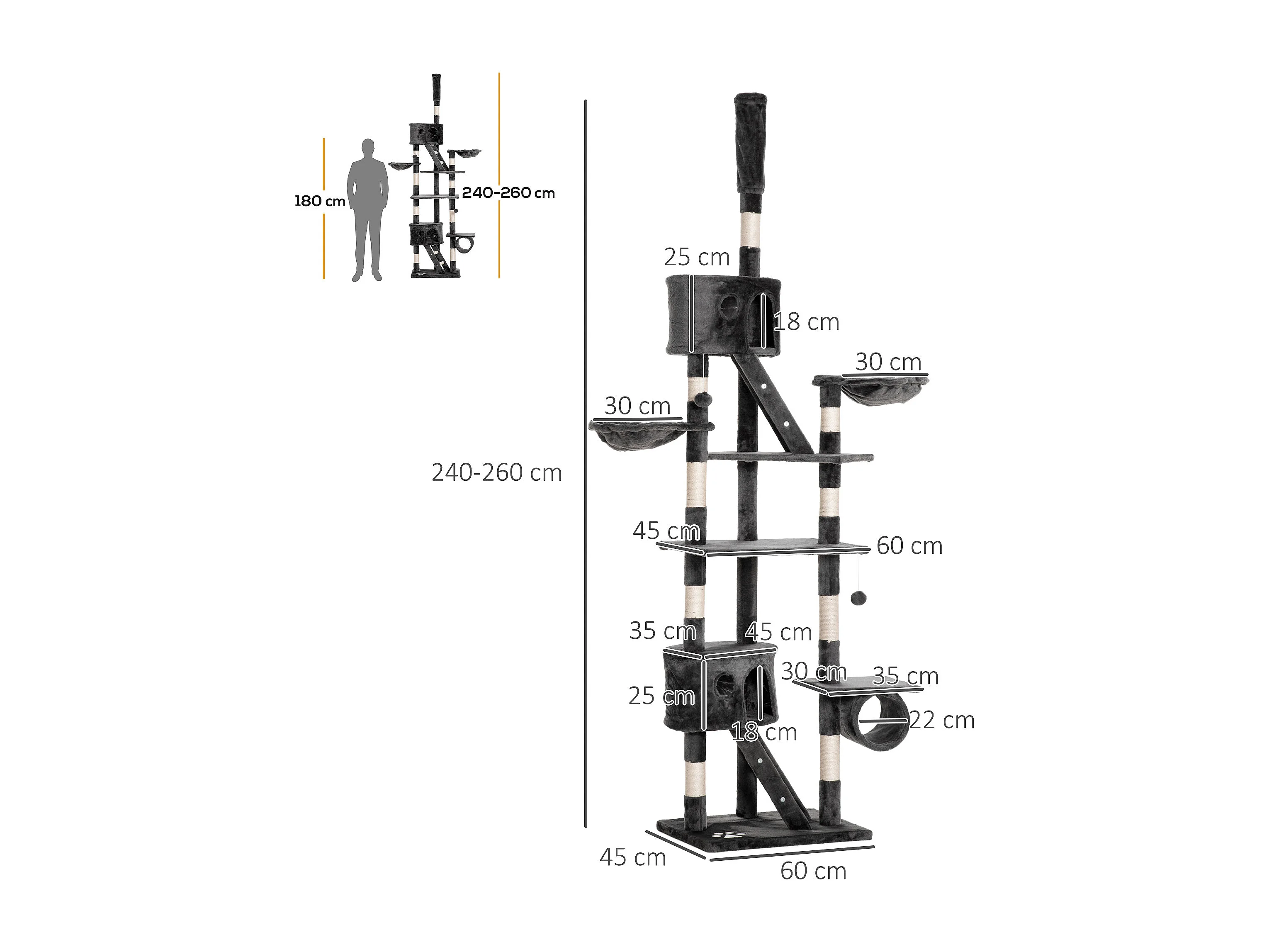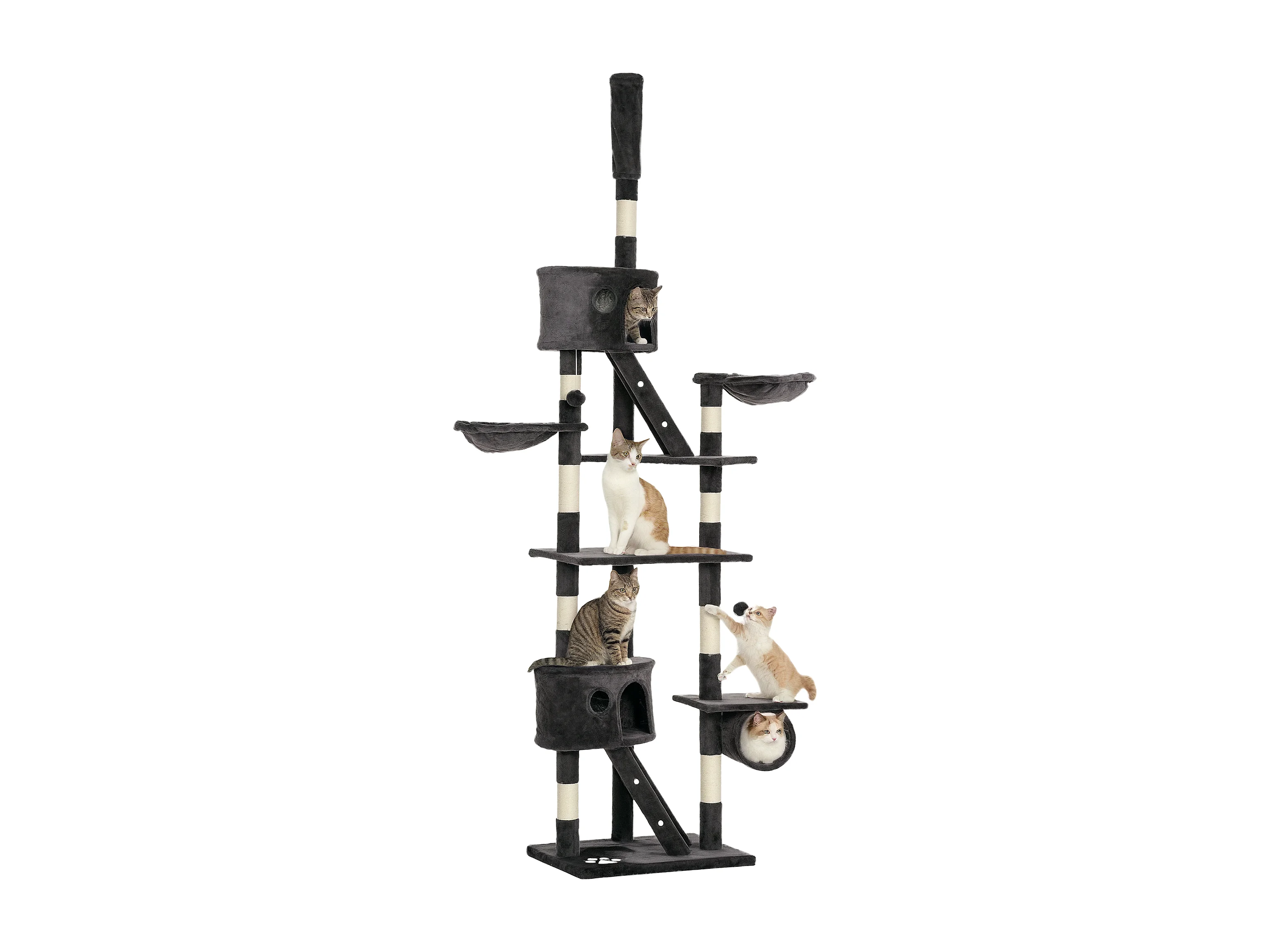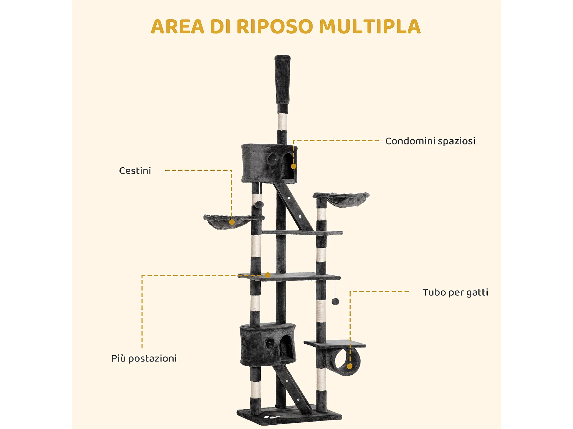 Albero tiragraffi per gatti alto 200cm con casette e amache grigio chiaro